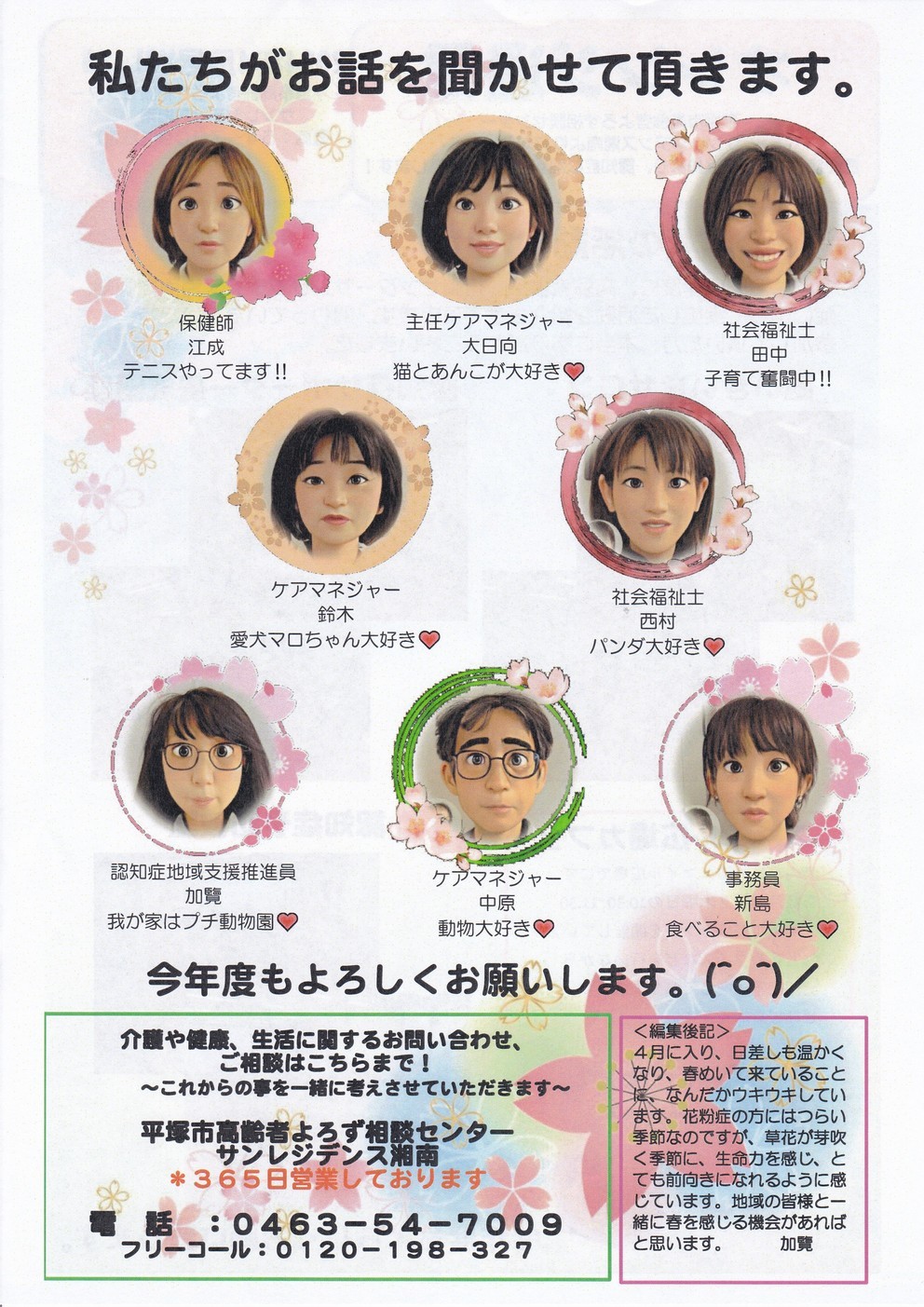 サンレジデンス湘南より2通のお知らせ 1、オレンジ通信4月号 ・令和5年度の活動報告 ・サンレジデンス湘南のご担当の 皆さんの似顔絵での紹介 2,脳いきいきサロン ・5月の認知症予防教室の ご案内 広報担当 |