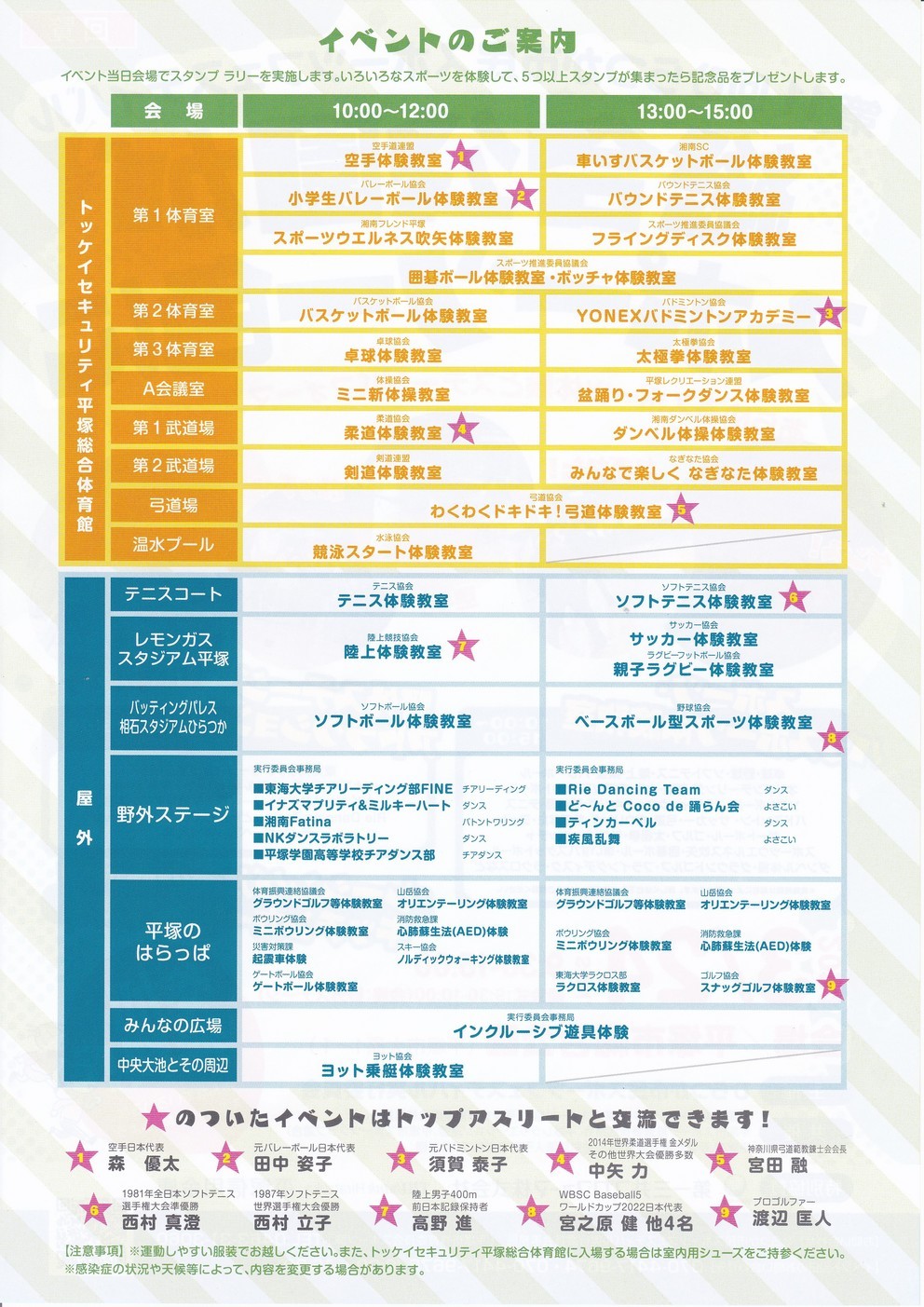 各種のスポーツ教室が開催されます。 ・体育館では、空手教室、車いすバスケット バレーボール、バウンドテニス等々19種目 ・テニスコートでテニス教室 ・レモンガススタジアムでは陸上、サッカー、ラグビー ・バッティングパレスではソフトボール、野球 ・屋外ステージではチアリーディング、ダンス等 ・はらっぱではグランドゴルフ、ミニボウリング等 ・みんなの広場では遊具体験 ・中央大池ではヨット体験 公園中を使って楽しいイベント満載です。 皆さん親子お揃いでご参加下さい。 詳細は添付資料をご覧下さい。 広報担当 | |