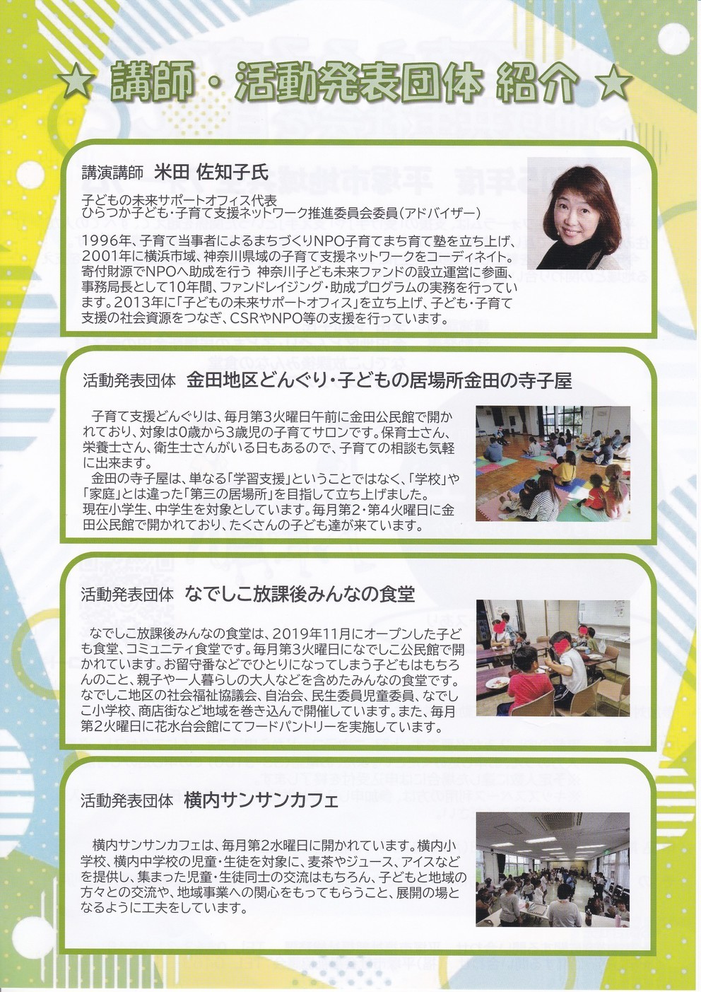 地域で支える子育て支援を考える 『地域共生フォーラム』が開催されます。 ・12月16日(土)13時30分〜 ・中央公民館 ・講演、及び地域の活動発表 ・金田地区:子供の居場所金田の寺子屋 ・なでしこ:放課後みんなの食堂 ・横内 :サンサンカフェ 詳細は添付資料を見て下さい。 広報担当 | |