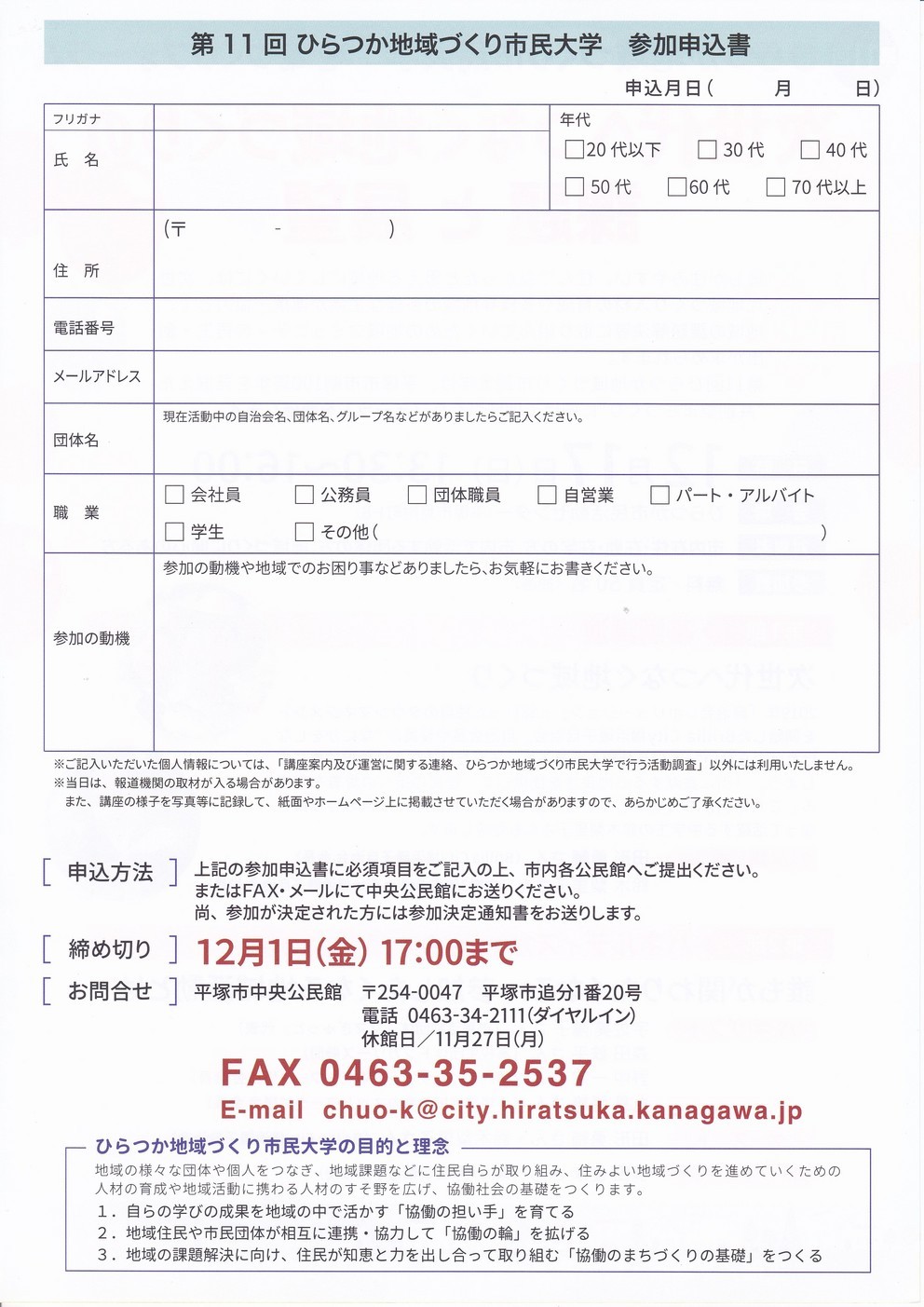平塚市民活動センターにて、『次世代へつなぐ 地域づくりの課題と展望』と題して 『地域づくりフォーラム』が開催されます。 詳細は添付資料をご覧ください。 広報担当 | |