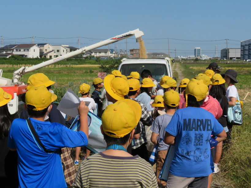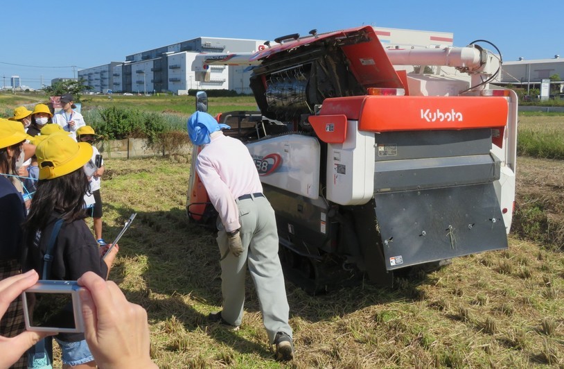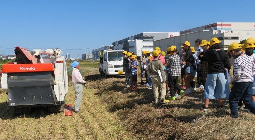 約4ケ月が過ぎ、稲にはたくさんの実がつきました。 今日(10月12日)は『稲刈りの見学学習」』です。 機械で稲を刈るようす、稲を刈る機械から、トラック にお米を積むようすを見学しました。 その後で 機械がどんな仕事をしているのか教えてもらいました。 質問の時間では、活発に多くの質問がありました。 最後にお礼を言って今日の見学は終了しました。 広報担当 |