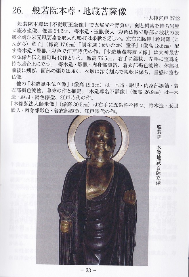本日は25番目の『般若院』と26番目の『地蔵菩薩像』の 紹介です。 般若院は1639年創建で、かつては広い寺域だったが、 いまは縮小し、檀家も少ない。しかし名主等村の要職に つく家柄の檀家が多いとの事。 8月第一日曜日の 施餓鬼会に作られる盆飾りは色鮮やか。 般若院の本尊は『不動明王像』で左右に『こんがら童子』 『せいたか童子』。ほかにも像を所蔵しているが中でも 『地蔵菩薩像』は大神最古の室町時代の作と伝えられる との事です。 | |