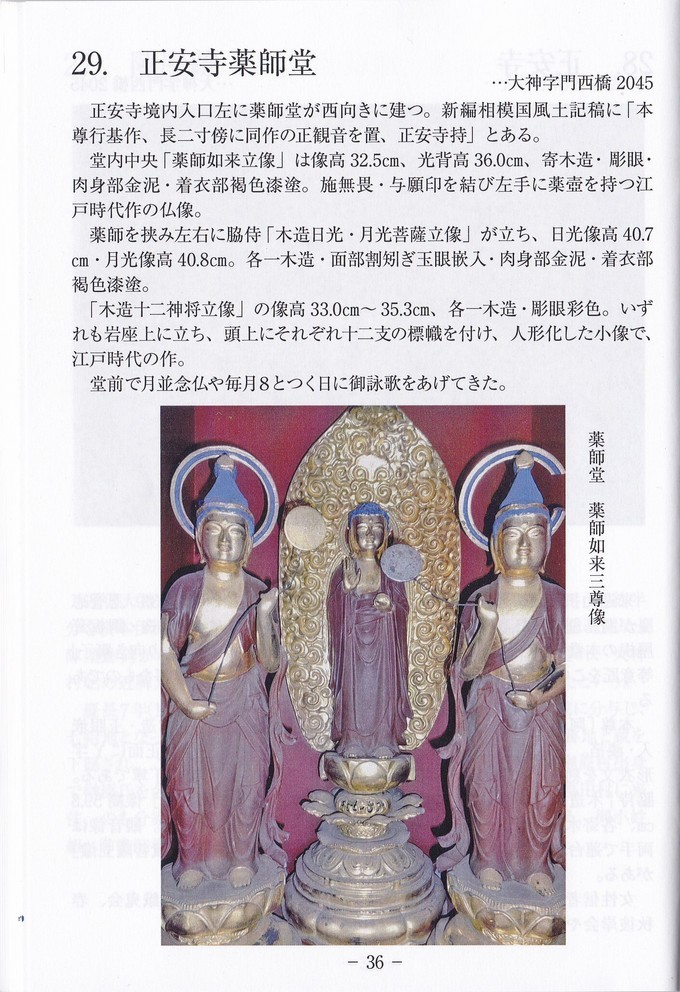 28番目の『正安寺』、29番目の『正安寺薬師堂』です。 正安寺は1533年創立。ご本尊は『阿弥陀如来立像』です。 脇侍は『観音菩薩立像』と『勢至菩薩立像』。 薬師堂には『薬師如来立像』、左右の脇侍は『日光・月光菩薩立像』 いずれも江戸時代の作だそうです。 | |