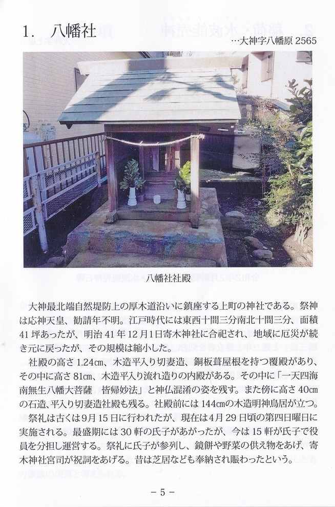 『大神歴史散歩 史跡・文化財50選』の冊子が発行されました。大神地区の歴史を知るのに大変貴重な冊子だと思います。 是非多くの皆さんに紹介したいと思います。 ページ数が多いので、少しずつ紹介して参ります。 今回は第1回『八幡社』の紹介です。 所在の場所は添付のPDFの地図を見て下さい。 |