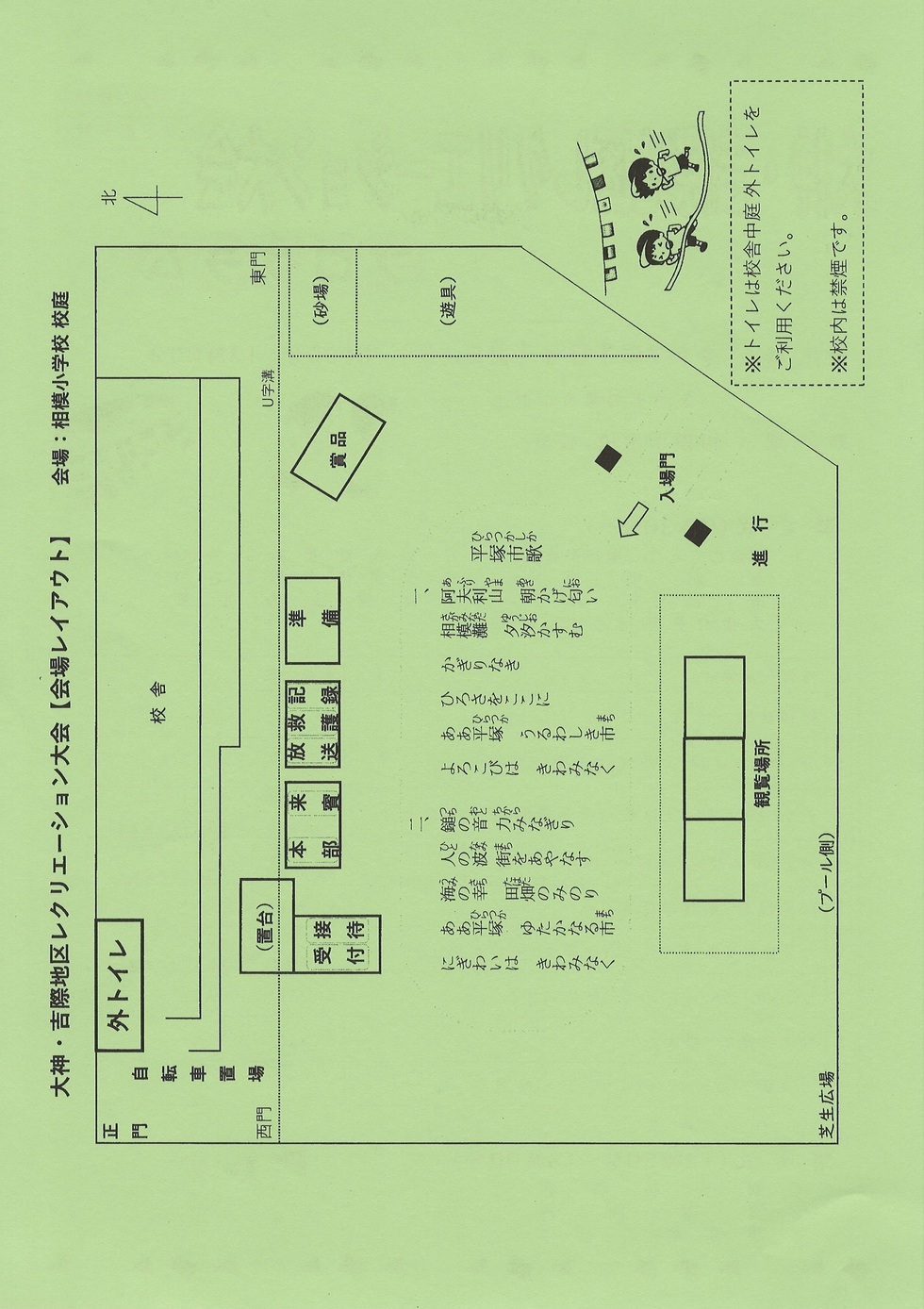 レクリエーション大会です。 相模小学校のグラウンドで9時30分開始です。 楽しいゲームとたくさんの賞品が皆さんを待って います。多くの方の参加を待ってますよ!! HP委員K,T |