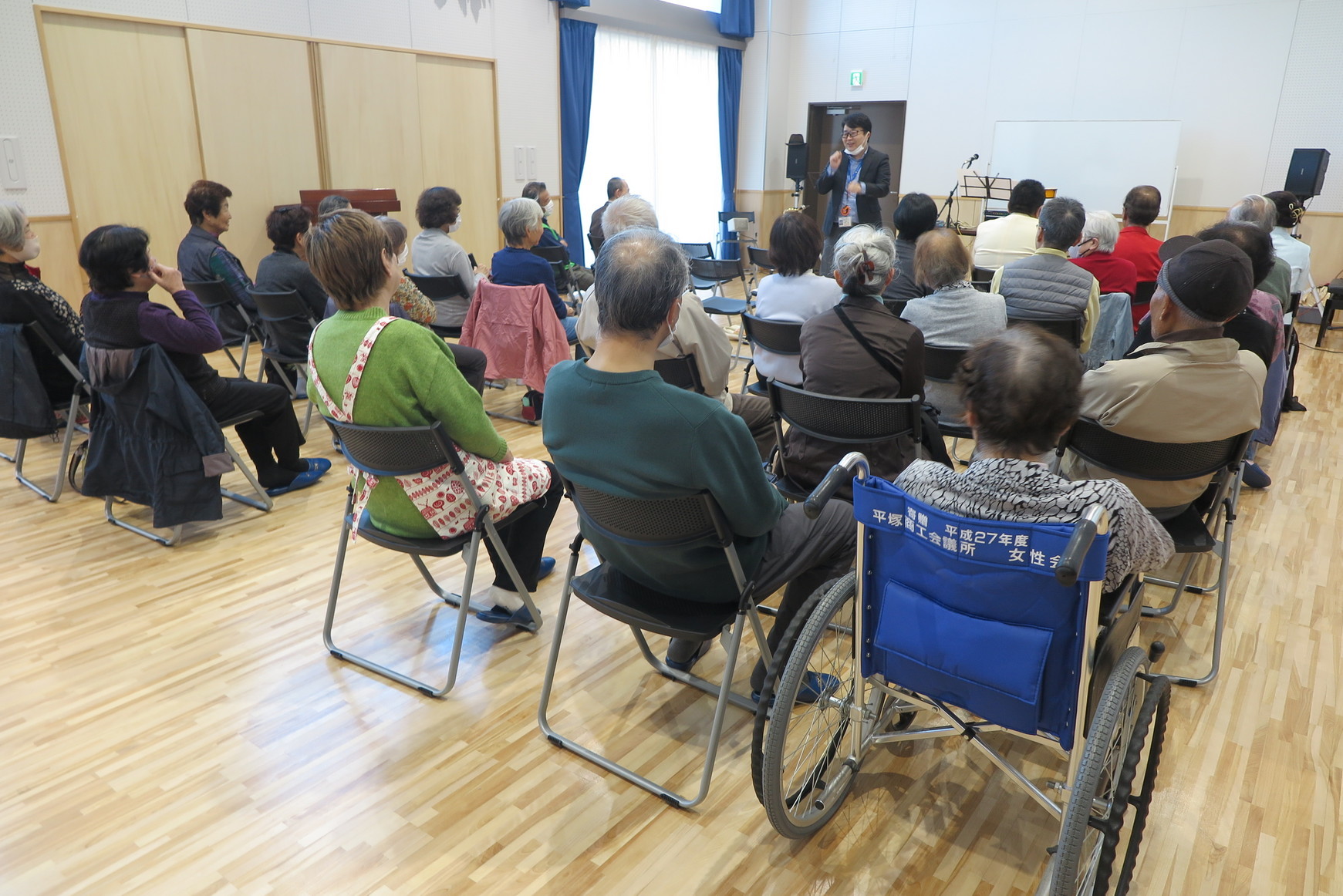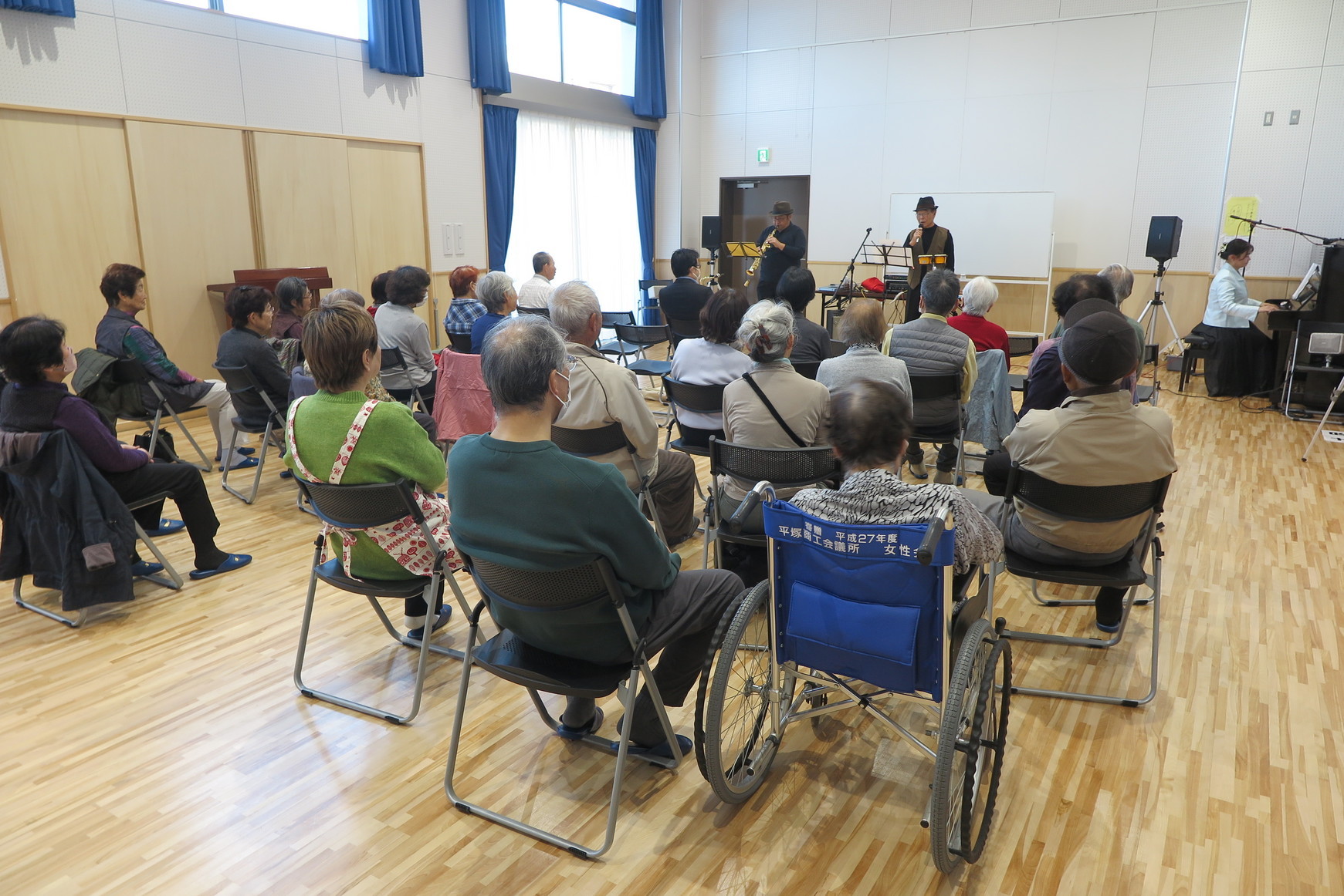 その後本日のメインイベント「オールドボーイズ・アイアイ」さんによる、 ”歌謡ショー”を開幕しました。このバンドは昨年の移動ふれあいサロンにもご出演になり大好評を博されたグループで、今回は司会・ボーカル(男性、二宮さん)、サックス(男性、矢野さん)、ピアノ(女性、相原さん)の三名の構成でした。“君といつまでも”で始まり“イエスタディ”を挟み、“マイウエー”で終わる、歌謡曲からハワイアン、ビートルズ楽曲等全12曲、合間に司会のユーモアたっぷりの曲紹介があり、選曲もバラエティに富み、聞き慣れた曲ばかりで、皆様ボーカルの熱唱・熱演に合わせ、口ずさみ楽しんでおられるようでした。 次回12月のふれあいサロンは、12月15日(月)13時より公民館にて、平塚市消費生活センターさんによる「生活トラブル予防講座」を開催の予定です。皆様こぞってご参加ください。 |