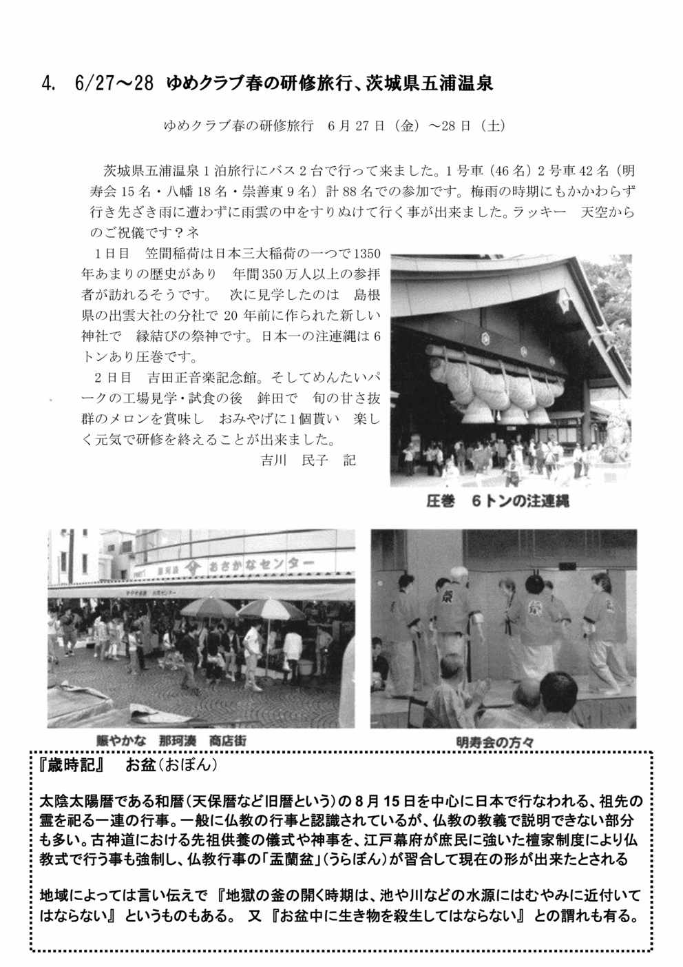 <テキストは携帯電話閲覧用です。スマホやパソコンは添付の図やpdfを御利用ください> p.1 ☆新入会員紹介 ・第3クラブ 原田努 S14-6生76歳, 宜しくお願いします。 ☆ 7/20の親睦会のにぎわい ・和やかに、華やかに、話し合った、唄った、踊った一日でした。 ・参加実績(参加申し込み数:140名 当日参加者数:130名) ・夏の親睦会7/20ふれあいセンターで行われました、役員の皆さん指定の時刻には全員集合、会場作りも短時間で出来た、カラオケ、コーラス、踊りと皆さん芸達者、中でも衣装を付けた13 名の踊り「大川ながし」は本格派、見応えが有りました。 ・ご寄付&御寄贈報告 高橋政子様金一封 神代長子様金一封 田辺ストアー様清酒 ☆ 8月の予定 ・8/2,3第17回四之宮地区 れあい盆踊り大会午後5時大野小学校校庭 ・8/15平和祈念祭=前鳥神社殉国碑前正副会長代表参加 ・8/27第50回ゆめクラブ湘南平塚福祉大会 市民センター四之宮地区午後出演11番目(14:20予定)踊り「大川流し」「佐渡の恋歌」 ☆9月以後の予定 ・9/4仲良し旅行「藤稔」ぶどう狩り、山梨方面(日帰り) 第6クラブ 担当幹事 ・9/9静友会舞踊発表会ふれあいセンター午前10時より ・9/23神社清掃(例大祭前) ・9/16,17,18ゆめクラブ悠々旅行安芸の宮島、出雲大社、足立美術館、松江、玉造、皆生温泉(2泊3日現地まで往復飛行機代金67,500円募集人員80名)航空券取消料金59日前5%発生 パンフレット配布済 ・10/28傘寿会(四之宮ふれあいセンター) ・11 中旬〜下旬、ゆめクラブ湘南平塚秋の研修旅行、 金華山ロープウエイ、岐阜大仏、大須観音、郡上八幡温泉、大矢田もみじ谷、養老公園、方面の旅、旅行費35,800円2泊3日 p.2 ☆4. 6/27〜28 ゆめクラブ春の研修旅行、茨城県五浦温泉ゆめクラブ春の研修旅行6月27日(金)〜28日(土) ・茨城県五浦温泉1 泊旅行にバス2 台で行って来ました。1 号車(46 名)2 号車42 名(明寿会15 名・八幡18 名・崇善東9 名)計88 名での参加です。梅雨の時期にもかかわらず行き先ざき雨に遭わずに雨雲の中をすりぬけて行く事が出来ました。ラッキー 天空からのご祝儀です?ネ ・1 日目笠間稲荷は日本三大稲荷の一つで1350年あまりの歴史があり年間350万人以上の参拝者が訪れるそうです。次に見学したのは島根県の出雲大社の分社で20年前に作られた新しい神社で縁結びの祭神です。日本一の注連縄は6トンあり圧巻です。 ・2日目吉田正音楽記念館。そしてめんたいパークの工場見学・試食の後、 鉾田で旬の甘さ抜群のメロンを賞味し、おみやげに1個貰い楽しく元気で研修を終えることが出来ました。吉川民子記 ☆『歳時記』お盆(おぼん) ・太陰太陽暦である和暦(天保暦など旧暦という)の8月15日を中心に日本で行なわれる、祖先の霊を祀る一連の行事。一般に仏教の行事と認識されているが、仏教の教義で説明できない部分も多い。古神道における先祖供養の儀式や神事を、江戸幕府が庶民に強いた檀家制度により仏教式で行う事も強制し、仏教行事の「盂蘭盆」(うらぼん)が習合して現在の形が出来たとされる地域によっては言い伝えで 『地獄の釜の開く時期は、池や川などの水源にはむやみに近付いてはならない』 というものもある。又『お盆中に生き物を殺生してはならない』との謂れも有る。 | |