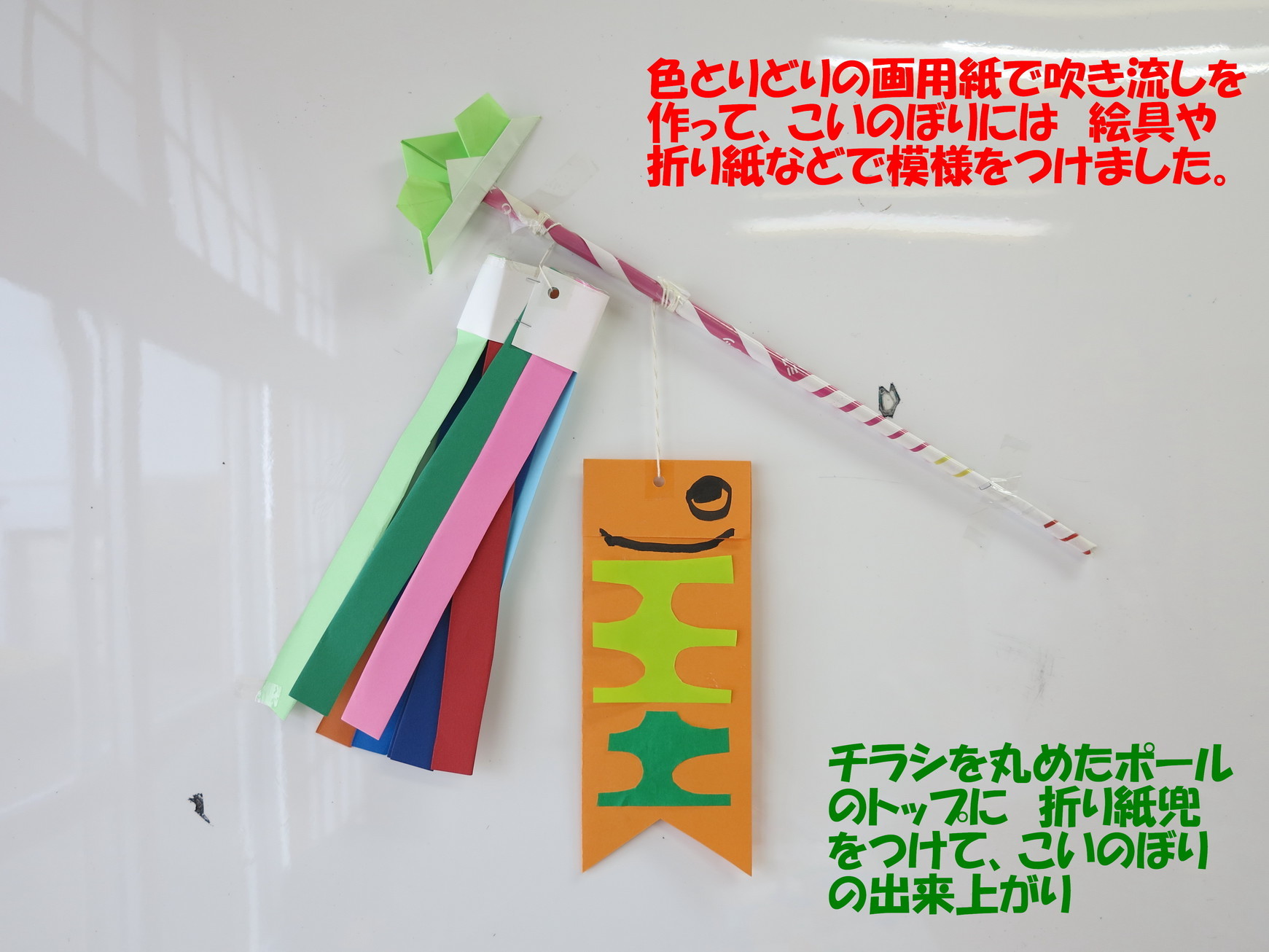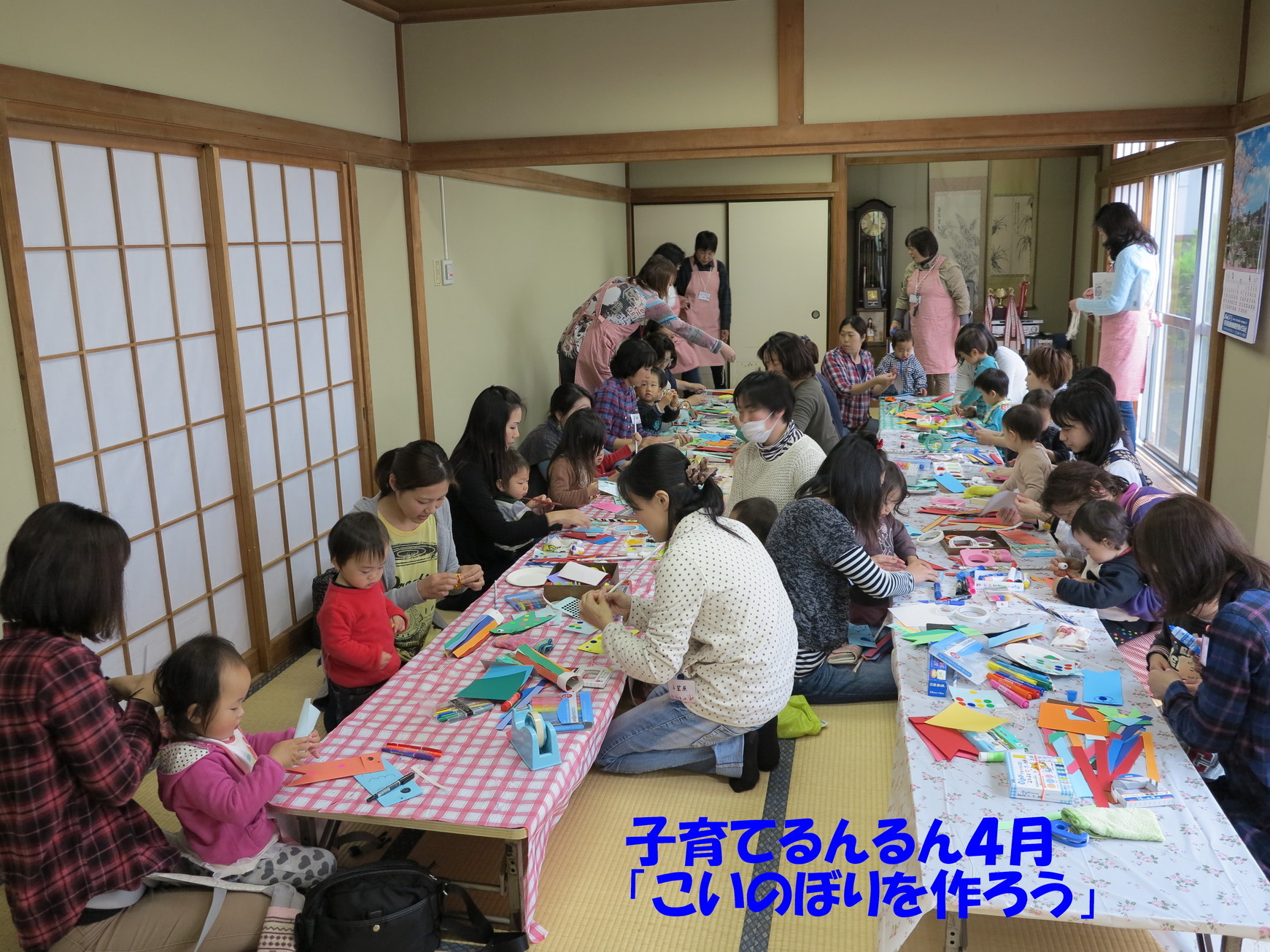 21日のるんるんは小雨交じりのあいにくのお天気でしたが、みんな元気に遊びに来てくれました。お歌を歌ったり絵本を読んでもらったりした後は、こいのぼり作りをしました。色とりどりの画用紙で吹き流しを作って、こいのぼりには絵の具や折り紙などで模様をつけました。チラシを丸めたポールのトップに折り紙兜をつけて、こいのぼりの出来上がり!今月のおやつはミニカップケーキでした。しっとりふわふわの手作りケーキは程よい甘さでとてもおいしかったですね。 ☆5月のるんるんは「ミニミニ遠足」です。 5月19日(月)10:00〜神奈川県下水道公社ふれあい広場集合お茶とおやつが用意されます。帽子を忘れずにね!*いつもの公民館ではなく、場所が変わりますのでお間違えの無いようにお願いします。雨天の場合は公民館で自由遊びとなります。