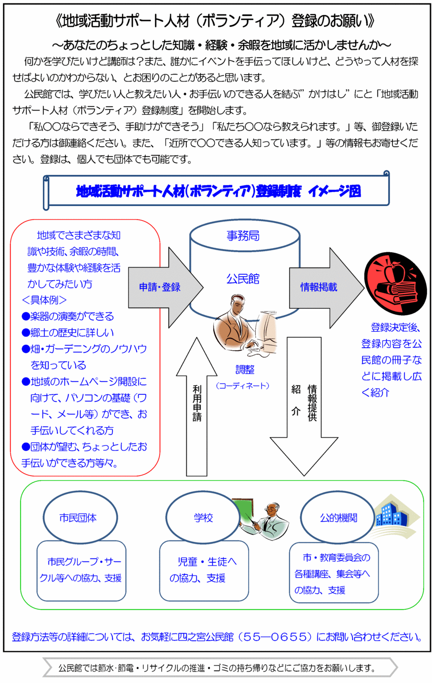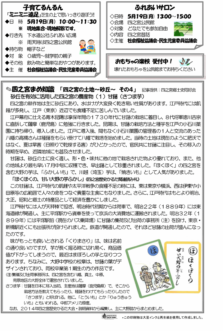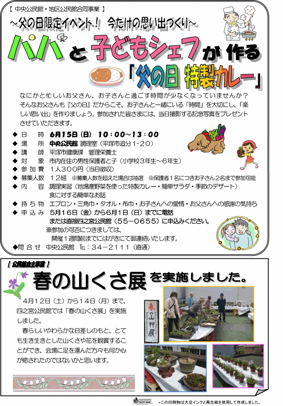 p.1 ☆高齢者学級が始まります! ・6月3日(火)13:30〜15:00自転車の交通ルール振り込め詐欺等について 平塚警察署交通課・生活安全課 交通安全母の会の皆さん ・6月5日(木)13:30〜15:00平塚空襲について-旧大野町-元博物館長土井浩氏 ・6月9日(月)13:30〜15:00童謡・唱歌を楽しく歌おう! 小瀬村春雄氏 ・6月11日(水)13:30〜15:00リンパマッサージで心も体も健康体 湘南リンパ四季の会 ・6月19日(木)8:45〜17:30〔移動学習〕崎陽軒横浜工場、新横浜ラーメン博物館、赤レンガ倉庫 ※ドラッグセイムス四之宮店に8:30までに集合 ・会場:移動学習以外は四之宮公民館です。 ・対象:地区在住の60歳以上の方ならどなたでも御参加いただけます。 ・定員:50名程度(移動学習は44名) ・参加費:3;000円(移動学習に参加する方のみ。昼食代は含みません。) ・申込み:5月14日(水)9:00から四之宮公民館へ 《 明寿会に加入されている方は参加費を添えてクラブ長さんへ 》 ・会場:移動学習以外は四之宮公民館2階集会室です。 ・対象:地区在住の60歳以上の方ならどなたでも御参加いただけます。 ・定員:50名程度(移動学習は44名) ・その他:全日程に参加できなくても構いません。但し移動学習のみの参加はできません。 p.2 ☆【 中央公民館・地区館合同事業 】〜父の日限定イベント! パパと子どもシェフ作る「父の日特製カレー」 ・日時:6月15日(日)10:00〜13:00 ・場所:中央公民館調理室(平塚市追分1-20) ・講師:平塚市健康課管理栄養士 ・対象:市内在住の男性保護者と子(小学校3年生〜6年生) ・参加費:1人300円(当日徴収) ・募集人数:12組 ※募集人数を超えた場合は抽選 ※保護者1名につきお子さん2名まで参加可能 ・内容: 調理実習(地場産野菜を使った特製カレー・簡単サラダ・季節のデザート)食に対する簡単なお話 ・持ち物:エプロン・三角巾・タオル・布巾・お子さんへの愛情・お父さんへの感謝の気持ち ・申込み:5月16日(金)から6月1日(日)までに電話または直接四之宮公民館(55−0655)に申込みください。 ※参加の可否につきましては開催1週間前までにはがきにて御連絡いたします。 ・問合せ:中央公民館 :34−2111(直通) ・日時:6月15日(日) 10:00〜13:00 ・場所:中央公民館 調理室(平塚市追分1-20) ・講師:平塚市健康課管理栄養士 ・対象:市内在住の男性保護者と子(小学校3年生〜6年生) ・参加費:1人300円(当日徴収) ☆春の山くさ展を実施しました。【省略】 p.3 ☆《地域活動サポート人材(ボランティア)登録のお願い》〜あなたのちょっとした知識・経験・余暇を地域に活かしませんか〜 ・何かを学びたいけど講師は?また、誰かにイベントを手伝ってほしいけど、どうやって人材を探せばよいのかわからない、とお困りのことがあると思います。公民館では、学びたい人と教えたい人・お手伝いのできる人を結ぶ”かけはし”にと「地域活動サポート人材(ボランティア)登録制度」を開始します。「私○○ならできそう、手助けができそう」「私たち○○なら教えられます。」等、御登録いただける方は御連絡ください。また「近所で○○できる人知っています。」等の情報もお寄せください。登録は個人でも団体でも可能です。 登録方法等の詳細については、お気軽に四之宮公民館(55-0655)にお問い合わせください。 p.4 ☆子育てるんるん「ミニミニ遠足」芝生の上で思いっきり遊ぼう!! ・日時:5月19日(月)10:00〜11:30※現地集合・現地解散です。 ・行き先:下水道公社ふれあい広場※雨天時は四之宮公民館 ・持ち物:帽子など ・対象:0歳児〜就学前の親子 ・その他:飲み物と簡単なおやつがあります。 ・主催:社会福祉協議会・民生児童委員協議会 ☆ふれあいサロン ・日時:5月19日(月)13:00〜15:00 ・会場:四之宮公民館 ・対象:どなたでも参加自由 ・内容:四之宮昔話 ・主催:社会福祉協議会・民生児童委員協議会 ☆四之宮まめ知識「四之宮の土地〜砂丘〜 その4」砂丘を有効に活用した四之宮の農産物(1)甘藷(さつま芋) 記事提供:四之宮郷土史同好会【省略】 |