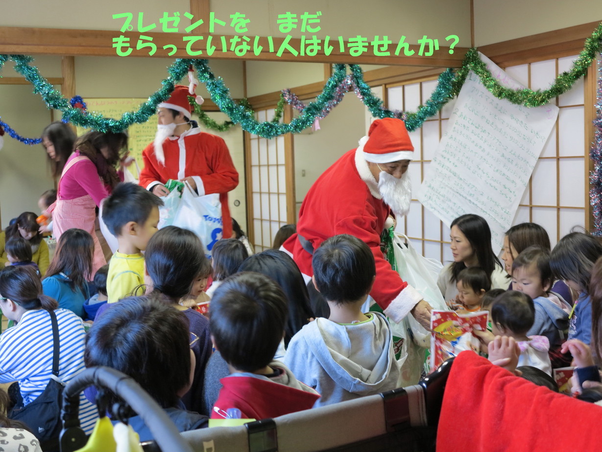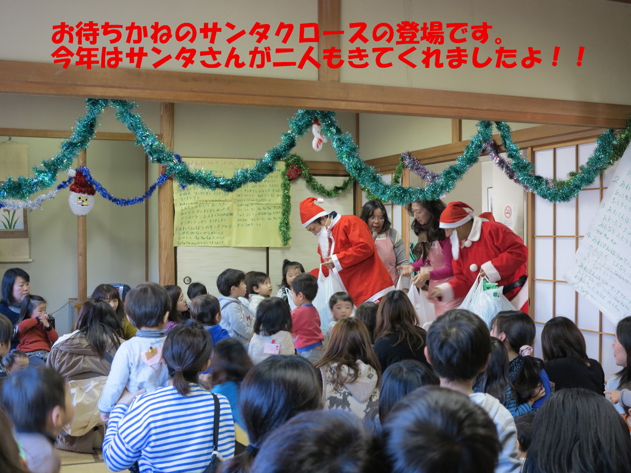 ☆12/16日のるんるんは、12月らしいすっきりした お天気に恵まれ、たくさんのちびっ子たちが 集まってくれました。 ☆最初に、民生委員の改選で8人が替わったので、 新しくなったスタッフの紹介をしました。 子育ての事や地域の事でわからないことは 何でも聞いてくださいね〜。 ☆さあ、いよいよクリスマス会の始まりです♪ まずみんなで「あわてんぼうのサンタクロース」の 歌を歌いました。 ☆ふたば会さんの人形劇では「ぐりとぐら」のお話 を楽しみました。最後にはかわいらしい人形たち と握手もできて皆大喜びでしたね。 ☆クリスマスの手作りおやつはロールケーキでした。 みんなで賑やかに美味しくいただきました。 ☆その後はお待ちかねのサンタクロースの登場です。 今年はサンタさんが二人も来てくれましたよ!! 眠くてグズグズいっていた子もプレゼントをもらって 一気にご機嫌さんになりましたね。 楽しい時間はあっという間。サンタさんに 「また来てね」とお願いしてクリスマス会は お開きとなりました。 ☆1月のるんるんは凧を作ろう!です。 1月20日(月)10:00〜 風邪に気を付けて、 元気に新年を迎えてください。 来年もるんるんで待っていま〜す♪ |