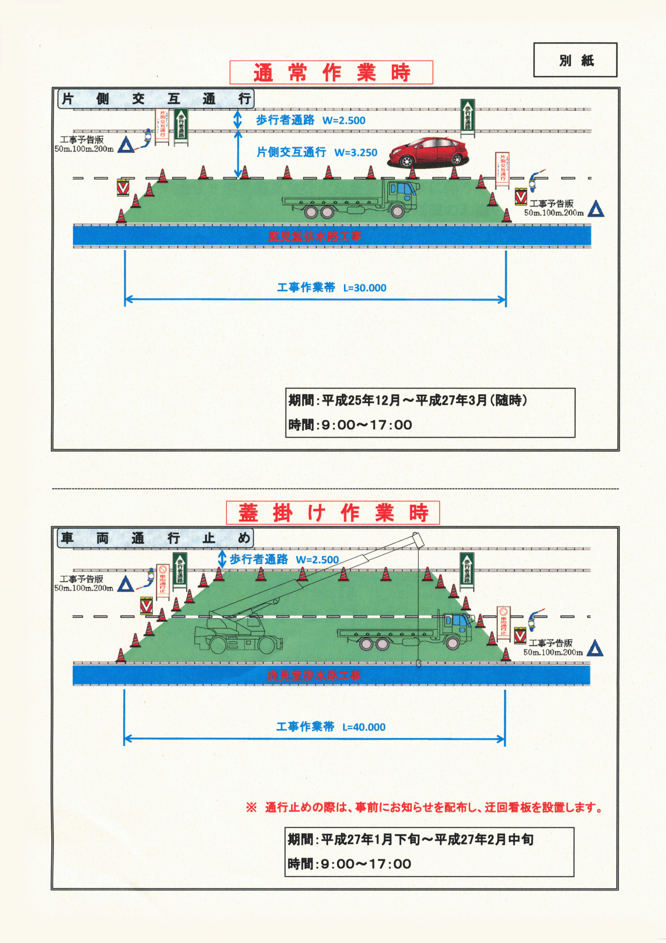 平成25年度鹿見堂排水路蓋掛け工事区間周辺にお住まいの皆さまヘ 平成25年12月17日 神奈川県流域下水道整備事務所長 平成25年度鹿見堂排水路蓋掛け工事に伴う道路通行制限のお願い 日ごろから、本県の下水道行政につきまして御理解、御協力をいただき、厚くお礼申し上げます。 さて、当所では、相模川流域下水道右岸処理場周辺の環境整備の一環として、平成22年度から鹿見堂排水路蓋掛けを実施しており、今年からは、下図の赤色部分【約420m】の蓋掛け工事を実施します。この工事に伴い、鹿見堂排水路に隣接する市道の一部区間について、別紙のとおり道路の通行を制限させていただきます。ご不便をおかけすることになりますが、安全に十分配慮し施工を行いますので、御理解、御協力のほどよろしくお願いします。 ○期間:平成25年12月〜平成27年3月(日曜日は除く) ○問い合わせ先 発注者:流域下水道整備事務所 維持計画課・平田 0467-87-9120 請負者:株式会社池田建設 現場代理人 米山 0463-93-2763 |