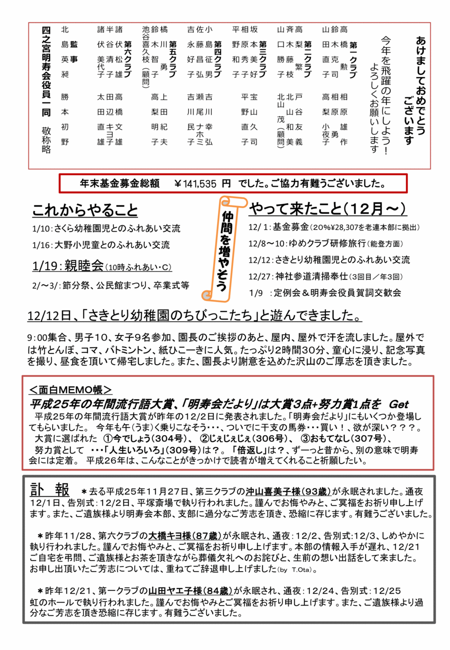 ☆新年のご挨拶 明寿会会長高橋勲 ・新年明けましておめでとう御座います。会員の皆様におかれましては清々しい新年を迎えられたこととお慶び申し上げます。昨年は26号台風で伊豆の大島は大きな災害に見舞われました。幸いにも我々が住む湘南地区は被害を受けることもなく過ごすことができました。四之宮明寿会は創立50年を迎えた年でもありました。また会員の皆様には各種事業に積極的に取り組んでいただき大きな成果を収めることができました。有難うございました。ただ楽しみにしていた市老連主催の体育祭は26号の影響で中止のやむなきに至りました。日本は世界に名だたる長寿国です。これに伴い会員の高齢化もすすんでいます。その反面若手の入会者がなく役員の選任には本部並びに各クラブ共々苦慮しているところであります。これらの問題に対しては長年の経験と英知を活かし乗り越え魅力有る明るい明寿会を築き、力を合わせ取り組んで参りたいとおもいます。皆様のお力添えを賜り新しい年が素晴らしい年になりますよう心からお祈り申し上げます。 p.2 ☆あけましておめでとうございます 今年を⾶躍の年にしよう! よろしくお願いします 四之宮明寿会役員一同【氏名等略】 ☆年末基金募金総額¥141,535 円でした。ご協力有難うございました。 ☆これからやること ・1/10:さくら幼稚園児とのふれあい交流 ・1/16:大野小児童とのふれあい交流 ・1/19:親睦会(10時ふれあい) ・2/〜3/:節分祭、公民館まつり、卒業式等 ☆やって来たこと(12月〜) ・12/1:基金募金(20%\28,307を老連本部に拠出) ・12/8〜10:ゆめクラブ研修旅行(能登方面) ・12/12:さきとり幼稚園児とのふれあい交流 ・12/27:神社参道清掃奉仕(3回目/年3回) ・1/9 :定例会&明寿会役員賀詞交歓会 ☆12/12日、「さきとり幼稚園のちびっこたち」と遊んできました。【以下略】 ☆平成25年の年間流行語大賞、「明寿会だより」は大賞3点+努力賞1点をGet【以下略】 ☆訃報 謹んでお悔やみと、ご冥福をお祈り申しあげます【お名前のみ】・第三クラブ沖山喜美子様(93歳)平成25年11月27日 ・第六クラブ大橋キヨ様(87歳)昨年11/28 ・第一クラブ山田ヤエ子様(84歳)昨年12/21 | |