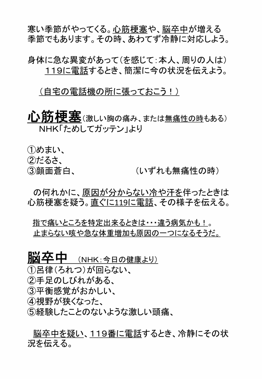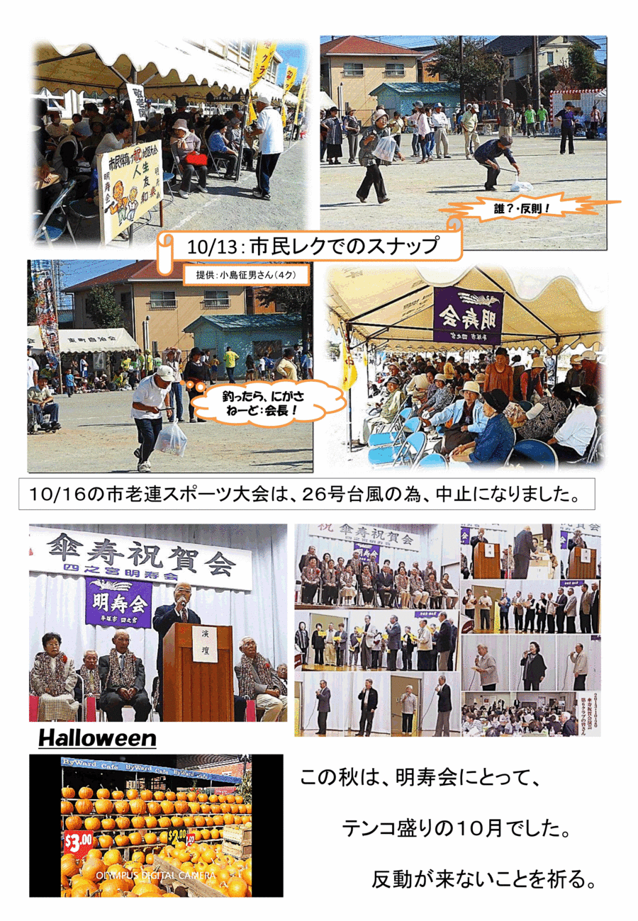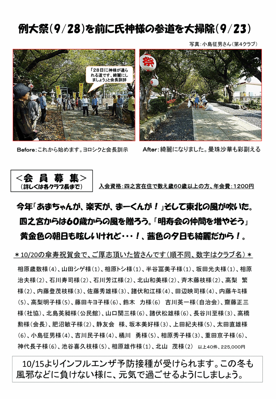 <詳細はスマホやPCで添付図やpdfを御覧ください> p.1 ☆傘寿祝賀会 十分なおもてなし出来ましたか傘寿祝賀会10/20は・・・?【以下略】 p.2 ☆前鳥神社例大祭(9/28)を前に、9/23に参道を大掃除しました。 ☆会員募集 ・入会資格:四之宮在住で数え歳60歳以上の方 ・年会費:1,200円 ☆10/20の傘寿祝賀会で多くの皆様からご厚志を頂きました【写真・氏名略】 ☆インフルエンザ予防接種の開始は10月15日から【以下略】 p.3 ☆写真 ・市民レクで(10/13)スナップ4点 ・傘寿祝賀会(10/20)スナップ8点 ・Halloweenのカボチャ1点 p.4 ☆寒い季節がやってくる。心筋梗塞や脳卒中が増える季節でもあります。その時あわてず冷静に対応しよう。【以下略】 | ||