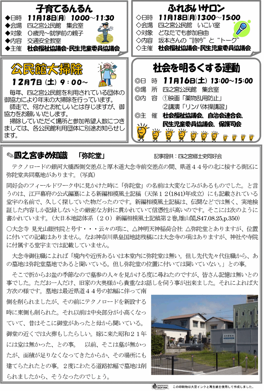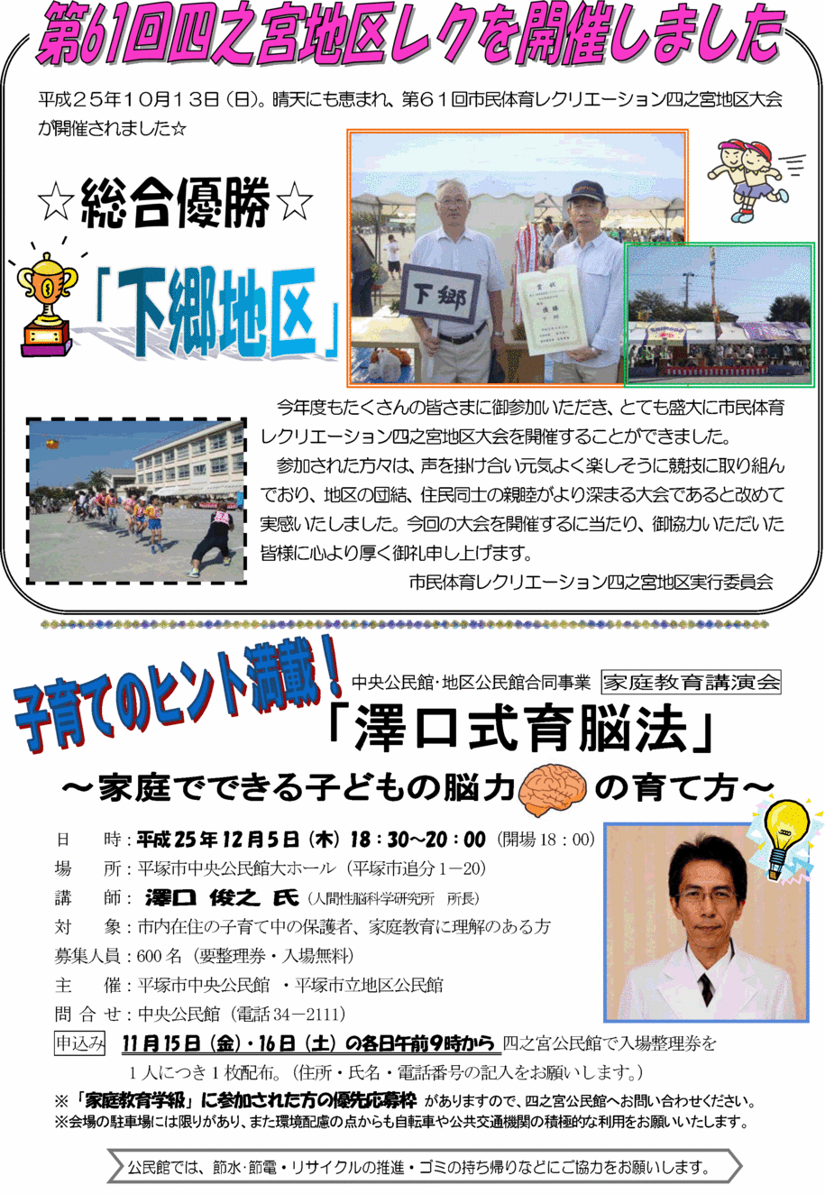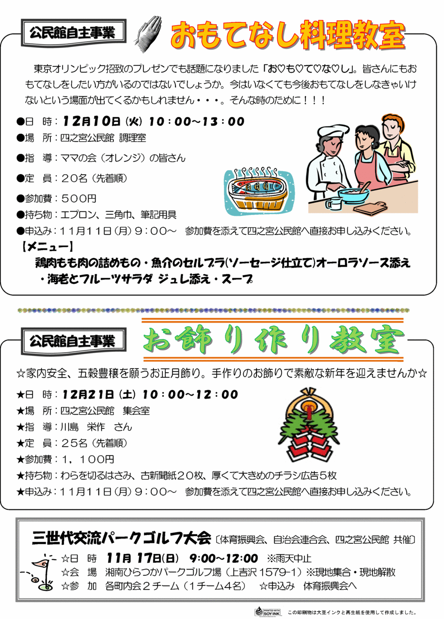 <テキスト部には全項目が書いてあるわけではありません> <場所を明記していない場合は四之宮公民館です> <スペースの関係で団体名称は分かる範囲のみで略称とする事があります> p.1 ☆市外ハイキング「箱根 神山」 ・日時:11月30日(土)ドラッグセイムス四之宮店8:00→箱根園→(ロープウェイ)→駒ヶ岳山頂→神山→大涌谷→四之宮公民館周辺(解散16時頃(予定)) ※天候によってはコースを多少変更することもある ・歩行:3.7km ・標高差:408m ・参加費:200円(当日集金) ・交通費:620円(自己負担)【ロープウェイ】 ・定員:20名(先着順) ・対象:小学校4年生以上(小学生は保護者同伴) ・持ち物:山登用靴,弁当,飲み物,行動食(チョコレート等),防寒具,雨具,帽子,敷物等 ・申込み:11月11日(月)9:00〜11月27日(水)までに四之宮公民館へまたは直接お申し込み ・その他:雨天及び参加人数によっては中止もある。また帰着時間等は多少前後することもある。 p.2 ☆おもてなし料理教室 ・日時:12月10日(火)10:00〜13:00 ・指導:ママの会(オレンジ) ・定員:20名(先着順) ・参加費:500円 ・持ち物:エプロン、三角巾、筆記用具 ・申込:11月11日(月)9:00〜 参加費を添えて四之宮公民館へ。【メニュー】鶏肉もも肉の詰めもの・魚介のセルブラ(ソーセージ仕立て)オーロラソース添え・海老とフルーツサラダ ジュレ添え・スープ ☆お飾り作り教室 ・日時:12月21日(土)10:00〜12:00 ・指導:川島栄作さん ・定員:25名(先着順) ・参加費:1,000円 ・持ち物:わら切るはさみ、古新聞紙20枚、厚くて大きめのチラシ広告5枚 ・申込:11月11日(月)9:00〜参加費を添えて四之宮公民館へ ☆三世代交流パークゴルフ大会〔体振、自治連、公民館共催 ・日時:11月17日(日)9:00〜12:00【以下略】 p.3 ☆第61回四之宮地区レクを開催しました【以下略】 ☆中央公民館・地区公民館合同事業 家庭教育講演会 「澤口式育脳法」 ・日時:12月5日(木)18:30〜20:00(開場18:00) ・場所:中央公民館 ・講師:澤口俊之氏(人間性脳科学研究所 所長) ・対象:市内在住の子育て中の保護者、家庭教育に理解のある方 ・募集人員:600名(要整理券・入場無料) ・主催:平塚市中央公民館 ・平塚市立地区公民館 ・問合せ:中央公民館(電話34−2111) ・申込み:11月15日(金)・16日(土)の各日午前9時から 四之宮公民館で入場整理券を1人につき1枚配布 ※会場の駐車場には限りがあり、自転車や公共交通機関の積極的な利用をお願います。 p.4 ☆子育てるんるん ・日時:11月18日(月)10:00〜11:30 ・対象:0歳児〜就学前の親子 ・内容:交通安全教室 ・主催:社協・民生児童委員協 ☆ふれあいサロン ・日時:11月18日(月)13:00〜15:00 ・対象:どなたでも ・内容:坂本さんの“詩吟”と“トーク” ・主催:社協・民生児童委員協 ☆公民館大掃除 ・12月7(土)9:00〜 毎年利用団体の御協力により年末の大掃除を行っています【以下略】 ☆社会を明るくする運動 ・日時:11月16日(土)13:00〜15:00 ・内容:@映画「薬物乱用防止」A講演「リンパ体操講習」 ・主催:社協、自連、民生児童委員協議会、保護司会 ☆四之宮まめ知識 「弥陀堂」 記事提供:四之宮郷土史同好会【以下略】 |