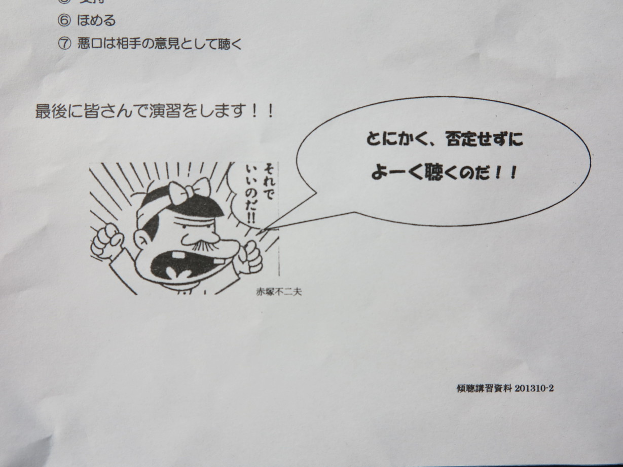 ひとり暮らしの高齢者や長期入院の方 施設入居中の方 等を対象に 苦しみや悩みをじっくり聴くことで、その方の心を癒やし、孤独や 不安を軽減させる手助けをするボランティア。 これを傾聴ボランティアーと言います。 神奈川県傾聴赤十字奉仕団の岡本様 平能様を講師にお願いして 11月6日四之宮公民館でこの傾聴ボランティアーの勉強会がありました。 “聞く”と“聴く”の違いから「アイコンタクト 」「笑顔 」「うなづき」等 傾聴の基本を説いてももらい最後の受講者同志による傾聴実習 と 2時間の講義は大変わかり易く ボランティアーはもとより 普段の生活にも大いに参考になるものでした。 主催 四之宮地区社会福祉協議会 |