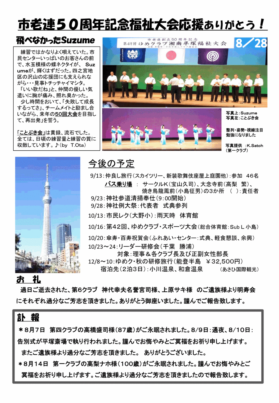 <スマホやPCでは添付の図かpdfの御利用が快適です> p.1 ☆会員数情報 25年度当初:345名(男:166,女:179)、任意脱会:6名、死亡脱会:10名、新規入会:0名 8/22在籍:329名(男:159 女:170) ☆関東大震災から90年が経ちました 9/1日は防災の日、年に一度は備えを見直しておこう。明日起きるかも?*日本に住んでる限り赤ん坊から年寄りまで災害から逃れることはできないのだから!【以下略】 p.2 ☆市老連50周年記念福祉大会応援ありがとう! 飛べなかったSuzume 練習ではかなりよく唄えていた。市民センターいっぱいのお客さんの前で水玉模様の蝶ネクタイが、Suzumeが、輝くはずだった。四之宮地区の沢山の応援団にも支えられながら・・・見事トチッチャイマシタ。「いい歌だね」と仲間の優しい気遣いに胸が痛み、照れ臭かった。少し時間をおいて「失敗して成長するってさ」、チームメイトと励まし合いながら来年の50回大会を目指して「再出発」を誓う。 「ことぶき会」は貫録、流石でした。全ては日頃の練習量と練習の質に収斂しています。♪(by T.Ota) ☆今後の予定 9/13:仲良し旅行(スカイツリー、新装歌舞伎座屋上庭園他):参加46名 バス乗り場:サークルK(宝山久司)、大念寺前(高梨繁)、焼き鳥龍鳳前(小島征男)の3か所( ):責任者 9/23:神社参道清掃奉仕(9:00開始) 9/28:神社例大祭:代表者式典参列 10/13:市民レク(大野小):雨天時体育館 10/16:第42回、ゆめクラブ・スポーツ大会(総合体育館:Sub L小島) 10/20:傘寿・百寿祝賀会(ふれあい・センター:式典、軽食懇談、余興) 10/23〜24:リーダー研修会(千葉勝浦)対象:理事&各クラブ長及び正副女性部長 12/8〜10:ゆめク・秋の研修旅行(能登半島\32,500円) 宿泊先(2泊3日):小川温泉、和倉温泉(あさひ国際観光) ☆お礼 過日ご逝去された、第6クラブ神代幸夫名誉宮司様、上原サキ様のご遺族様より明寿会にそれぞれ過分なご芳志を頂きました。ありがとう御座いました。謹んでご報告致します。 ☆訃報 *8月7日第四クラブの高橋盛司様(87歳)がご永眠されました。8/9日:通夜、8/10日:告別式が平塚斎場で執り行われました。謹んでお悔やみとご冥福をお祈り申し上げます。またご遺族様より過分なご芳志を頂きました。ありがとうございました。 *8月14日第一クラブの高梨ナホ様(100歳)がご永眠されました。謹んでお悔やみとご冥福をお祈り申し上げます。ご遺族様より過分なご芳志を頂きましたので報告致します。 | |