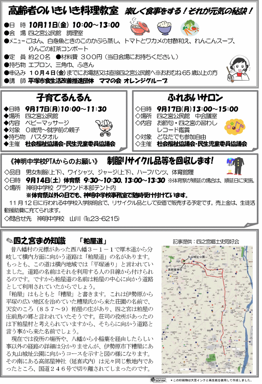 p.1 ☆第61回 市民体育レクリエーション四之宮地区大会 ・日時 10月13日(日)9:00〜15:00 ・場所 大野小学校校庭(雨天の場合は同校体育館) ・主管 市民体育レクリエーション四之宮地区大会実行委員会 ※詳細については後日各戸配布されるプログラムをご覧ください。 ☆下郷自治会が道路愛護等国土交通大臣表彰を受けました!! 平成25年8月1日に、下郷自治会が長年実施した国道129号線の美化清掃に対し、道路愛護等国土交通大臣表彰を受けました。 ☆四之宮 わくわくクラブ 第2弾 “ペットボトルロケット”を作って飛ばそう!参加者募集中! 参加費無料 ・日時 〔作製教室〕〔発射大会〕9月21日(土)9:00〜13:00 ※雨天・強風の場合は9月22日(日)9:00〜13:00 に延期します。 ・場所〔作製教室〕四之宮公民館 集会室9:00〜 〔発射大会〕大野小学校グラウンド11:00〜(予定) ・講師 四之宮地区青少年指導員のみなさん ・協力 おもちゃの楽校 ・対象 小中学生(先着25名) ※ 低学年の場合は保護者同伴でロケット作りのお手伝いをお願いします。 ・持ち物 〔作製教室〕カッター、はさみ、ホチキス、ペンチ、定規 〔発射大会〕帽子、タオル、飲みもの ・申込み 四之宮公民館へ電話(55-0655)または直接 ※ペットボトルロケットが家にあるという人は〔発射大会〕だけでも是非参加してください!! p.2 ☆高齢者のいきいき料理教室 楽しく食事をする!それが元気の秘訣! ・日時 10月11日(金)10:00〜13:00 ・会場 四之宮公民館 調理室 ・メニューごはん、白身魚ときのこのかぶら蒸し、トマトとワカメの甘酢和え、れんこんスープ、りんごの紅茶コンポート ・定員 約20名 ・材料費300円(当日会場にお持ちください。) ・持ち物 エプロン、三角巾、ふきん ・申込み 10月4日(金)までにお電話又は直接四之宮公民館へ ※おおむね65歳以上の方 ・講師 平塚市食生活改善推進団体ママの会 オレンジグループ ☆子育てるんるん ・日時 9月17日(月)10:00〜11:30 ・場所 四之宮公民館 ・内容 ベビーマッサージ ・対象 0歳児〜就学前の親子 ・持ち物 バスタオル ・主催 社会福祉協議会・民生児童委員協議会 ☆ふれあいサロン ・日時 9月17(月)13:00〜15:00 ・場所 四之宮公民館中会議室 ・内容 お節句の四之宮の習わし、レコード鑑賞 ・対象 どなたでも参加自由 ・主催 社会福祉協議会・民生児童委員協議会 ☆《神明中学校PTAからのお願い》 制服リサイクル品等を回収します! ・品目 男女制服(上下)、ワイシャツ、ジャージ(上下)、ハーフパンツ、体育館履 ・日時 9月14日(土)体育祭9:30〜10:30、13:00〜13:30 ※体育祭が順延の場合は順延日に実施 ・場所 神明中学校グラウンド本部テント内 ※体育祭以外の日でも神明中学校事務室で随時受け付けています。 ※11月12日に行われる中学校入学説明会でリサイクル品として安価で販売する予定です。売上金は生徒活動援助費に充てられます。 ・問合せ先 神明中学校山川 (23-6215) ☆四之宮まめ知識 「粕屋道」 記事提供:四之宮郷土史同好会【省略】 |