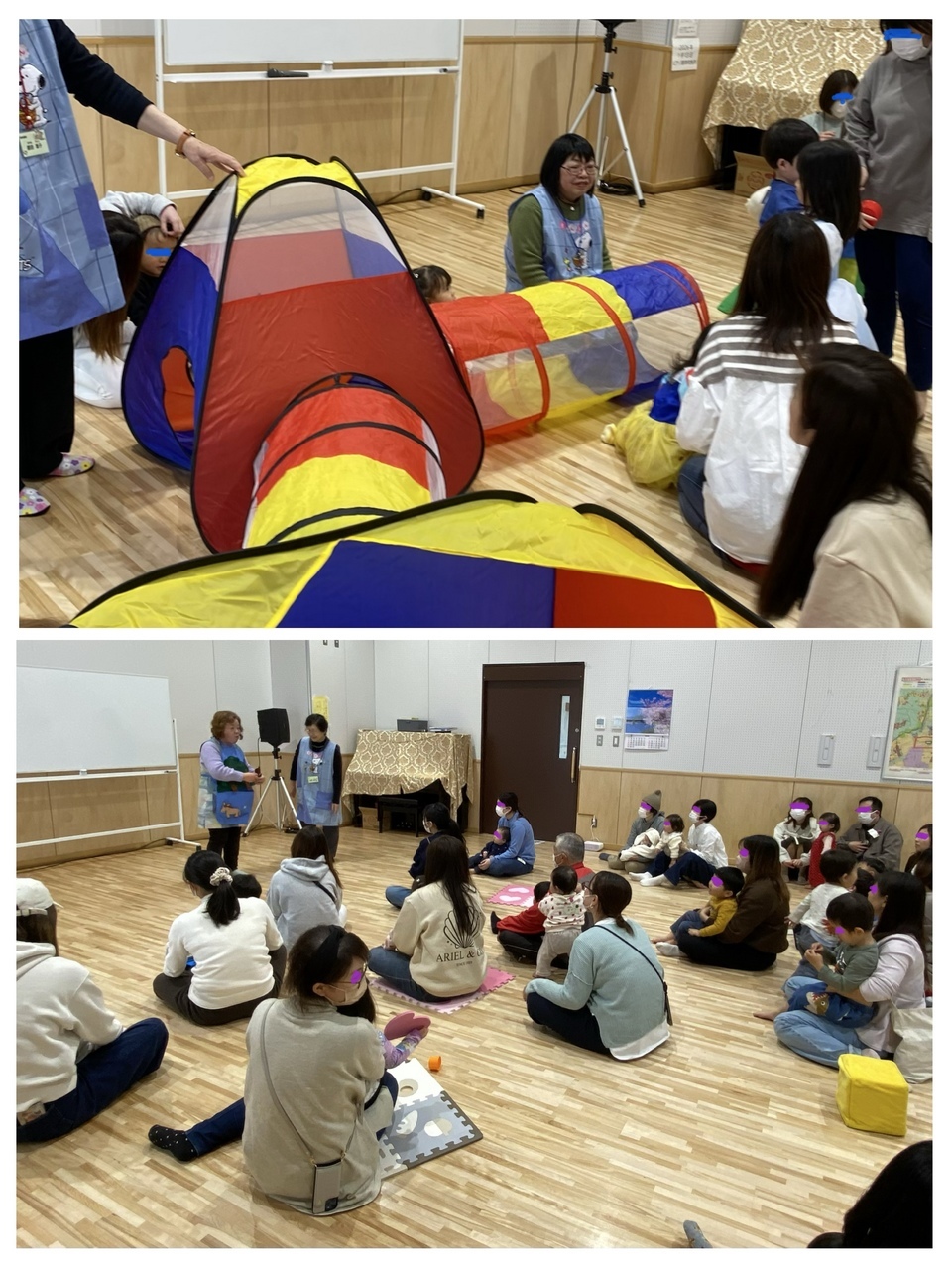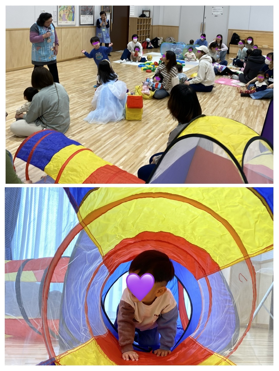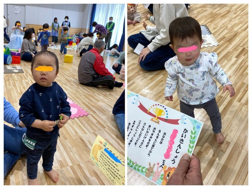 3月のるんるんは、「自由遊び&卒業るんるん」でした 新しくテントとトンネルの遊具と、おままごとキットが増えました ブロックやボールプール、はたらくくるまも人気でしたね〜 みんなそれぞれ自分の好きな遊びを楽しんでくれたようでよかったです たくさん遊んだ後は、スタッフがしかけ絵本の読み聞かせや、エプロンシアターでクールダウンしました 今年度最後のるんるんでしたので、4月からの予定をうかがったところ、幼稚園や保育園に通うお友達が9人もいて 「るんるんしょう」の賞状をおくってお祝いをしました 頑張って一年間休まずに来てくれた子も二人、「かいきんしょう」でお祝いをしましたよ ママも頑張りました 新しいところでも、お友達をたくさん作って、元気で過ごしてくださいね〜 来月は、こいのぼりを作ろうです🎏 | ||