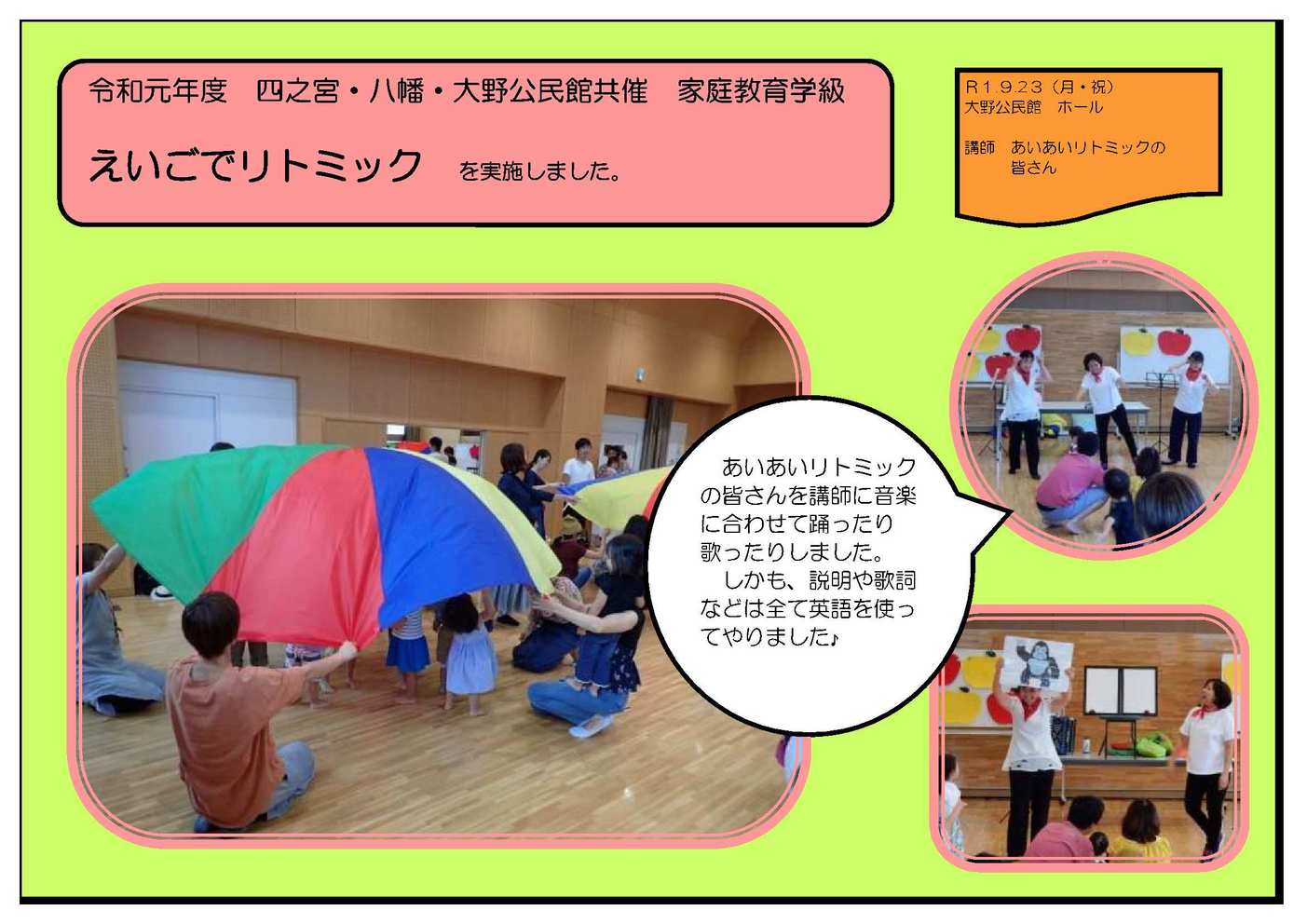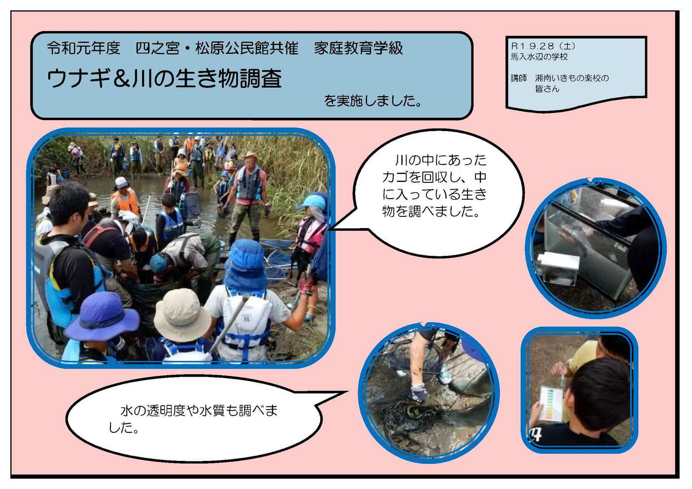 13時からスタートするために、12:30集合でお願いいたします。 小雨が降るかもしれませんので、服装・靴・持ち物にご注意ください。 今後天候が急変し、中止する際には別途ご連絡いたします。 四之宮公民館 |