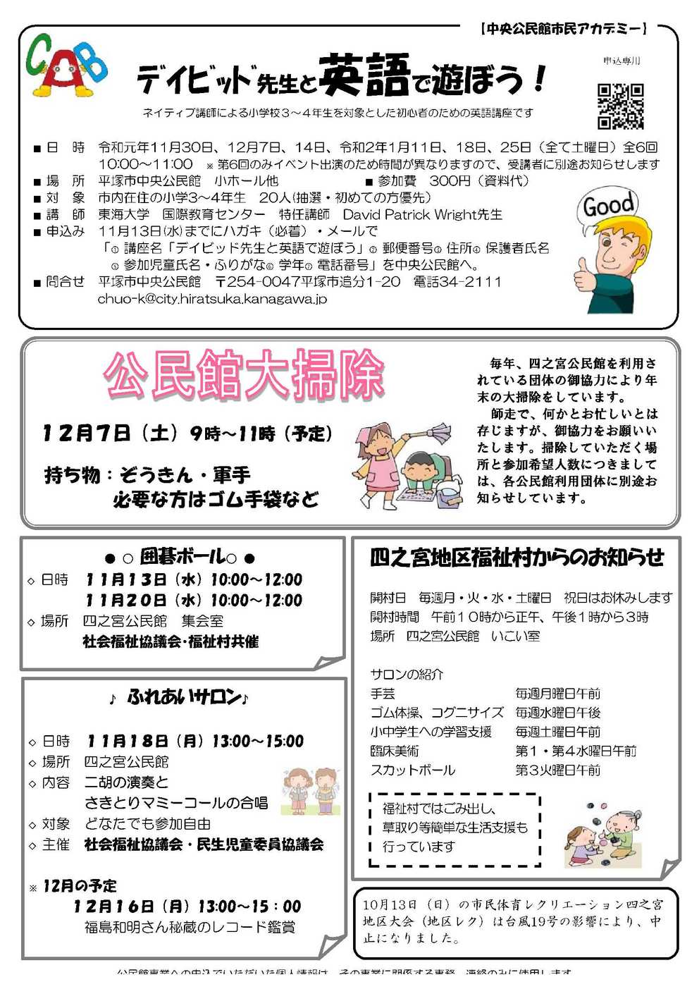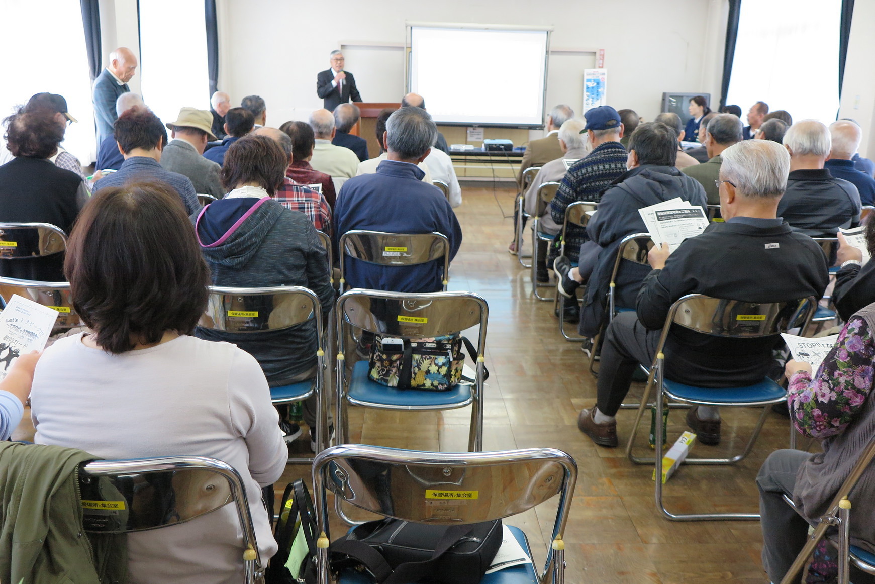 令和元年度の“社会を明るくする運動(社明運動)”(成人向け)は、11月16日(土)午後1時より2時半まで公民館で開催されました。当日は好天に恵まれ、自治会連合、明寿会等のご協力のお陰で、昨年度を大幅に上回る、講師3名を含め60名位の大盛会となりました。四之宮社協の遠藤副会長司会で始まり、まず、高橋会長に挨拶を頂き、第一部は四之宮地区の保護司で社協理事である川崎久満さんによる“スマートフォンの落とし穴”のお話、第二部は平塚警察署交通安全課からお招きしたお二人の婦人警官から“交通安全講和”をレクチャーして頂きました。