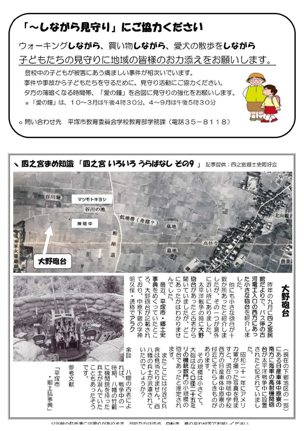 第一部では、最初に四之宮を含む近隣地区の各保護司さんの自己紹介、平塚市には現在65名の保護司さんが活躍中であることなどが紹介されました。スマートフォンは小さなパソコンで多くの機能を持ち、それだけに隠れた落とし穴がある。その一例として、ワンクリック請求詐欺がある。猥褻サイトにクリックして、聞きなれないIPアドレスを知られてしまったと恐慌を起こし、相手に連絡するとひどい目に遭う(IPアドレスだけで個人特定は不可能)。最近では偽アマゾンや偽楽天のサイトが出てきて、巧みにパスワードを取得して、それを使って多額の買い物をする手口もある。大人がこういう詐欺に遭わないためには、興味本位で怪しいサイトをクリックしない、慌てて業者に連絡しない、払わないで直ぐ消費者センターへ連絡するなどの対策がある。最近子供で被害が広がっているのに、言葉巧みに騙されて女の子が自撮り裸の写真をラインにアップされるのがある。拡散してしまうと取り消せないので、注意が必要だ。 第二部は、平塚警察署交通安全課の二人の婦警さんによる“四之宮地区交通安全教室”で、様々な事故の統計、交通安全にかかわる法令・規則、高齢者の歩行中の交通事故防止の為に考案された“Let’sトラビック”の説明と実体験でした。 県内に54個所の警察署があるが、平塚市の人身交通事故件数はワースト6(多い)。 市内で多い地区は四之宮と田村。 横断歩道での人身事故多し。JAF(日本自動車連盟)の調査によると、信号のない横断歩道で自動車が止まる割合は14.4%、警察はドライバーに対し一時停止や徐行運転を指導している。歩行者は横断歩道では、真っ直ぐ渡る、車の直前直後の横断に注意する、横断禁止帯での横断禁止を守ることを心がけて欲しい。 自転車の事故も多い。自転車が歩道を走る時は車道側をゆっくり走ること。自転車運転者も損害賠償保険に入ることを義務付けた新しい県条例が今年の10月から施行された。その他、免許返納に伴う“運転経歴証明書”制度の説明がなされた。 最後に、歌って踊って年寄りの交通事故防止する為の運動“Let’s トラビック”が説明された。トラビックとはTraffic Safety と Aerobicを複合してTRABICと造語したもので、誰もが知っている春が来、雪等の童謡に交通安全の心得を組み込んだ替え歌に合わせて、簡単な体操を加えたものです。婦警さんご指導で、皆さん替え歌動揺に合わせて体操をして今年の社明運動をお開きにしました。 |