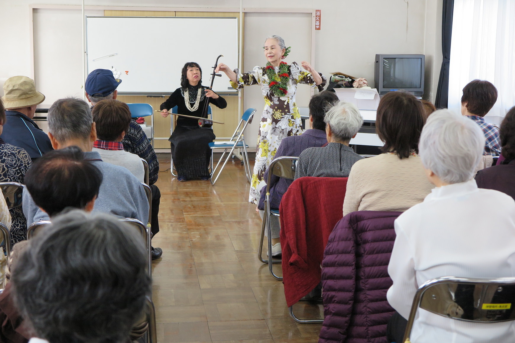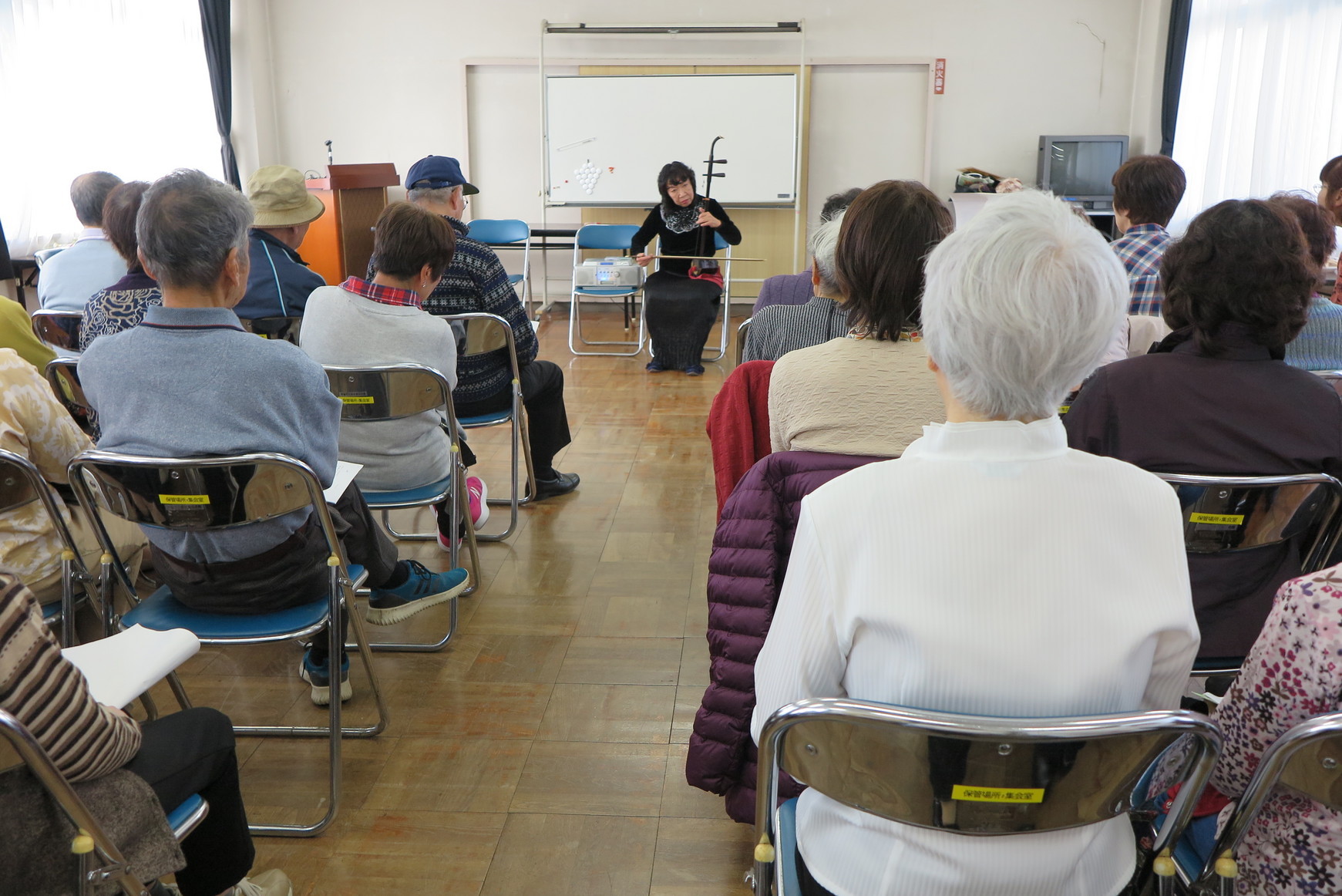当月のふれあいサロンは11月18日(月)13:00〜15:00公民館で開催され、総勢59名の参加となるとなる程の大盛況となりました。町内の“さきとりマミーコール”女性合唱団(今回出演者は17名+伴奏兼指揮者1名)をお招きして二胡演奏による伴奏で、多種多様な歌曲を楽しみ、またそれに合わせて会場も参加して合唱するという楽しい時間となりました。まず恒例の倉田会さん上条さんのご指導で、頭と体をほぐす体操をして、平林(ひらばやし、たいらばやし)という字違いの落語で大いに笑った後、マミーコールさんの“紅葉”、‟青い山脈‟‟ともしび”などのロシア民謡3曲、‟お猿のかごや”で“さ”の音で手を叩く頭の体操を中に入れ、その後お馴染みの‟野に咲く花のように”等2曲が歌われました。休憩後、今回の指揮・伴奏者でもある長岡先生(女性)による二胡演奏を楽しみました。蘇州夜曲、シルクロード、秋の歌3曲メドレー‟里の秋”、‟旅愁”、‟赤とんぼ”、いずれも二胡独特の雅やかで、流れるような、もの悲しさも感じさせる、見事な演奏で大いに堪能しました。今回の特別企画なのか、その後二胡とフラダンスのコラボという初めて見る素晴らしい演出もありました。折角の機会と言うことで中国の歌“月之故郷”“夜来香”も披露されました。その後、会場からも合唱団に加わって、皆で懐かしい童謡、唱歌、懐メロを歌い合ってお開きとなりました。