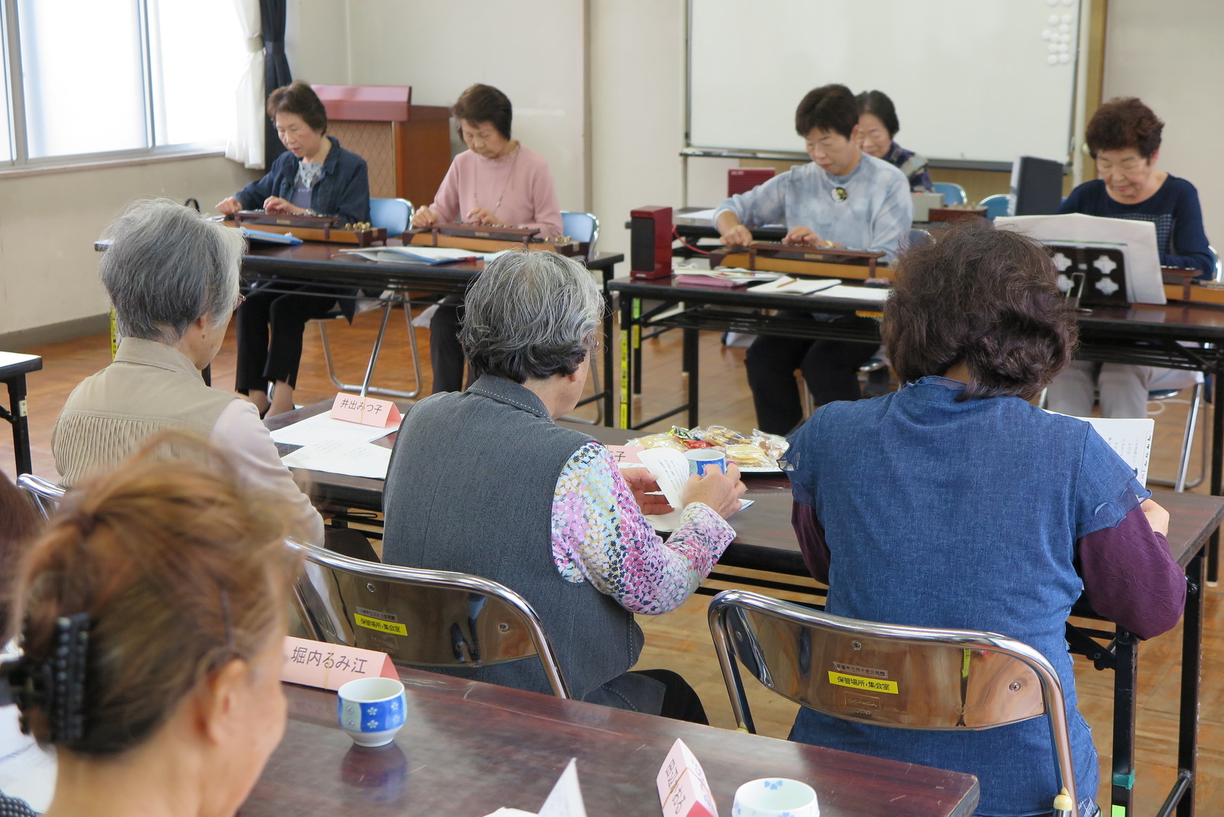 10月のふれあいサロンは、10月21日(月)13:00〜14:30あいにくの曇り模様の中、公民館で開催され、演奏者5名を含め総勢23名の参加となりました。今回のふれあいサロンは、倉田会の看護師さんの認知症の話し、そのご指導による脳トレと大正琴演奏グループ“すずらん”さんによる歌曲の演奏との二本立てでした。脳トレは短期記憶を司る海馬の活性を見る簡単なクイズで、身近な物を短時間見て少し時間を置いていくつ答えられるかを競うもので、参加者の皆さんは高得点でした。大正琴の演奏は“ふるさと”、“カナリア”等の童謡、‟東京音頭”等の民謡、“北国の春”等の歌謡曲、最後に“ここに幸あり”で全9曲、全てが皆さんご存知の歌ばかりの選曲で、毎月1回は練習されているという流麗な演奏に合わせ参加者全員でご用意頂いた歌詞を見ながら懐かしく合唱させていただきました。