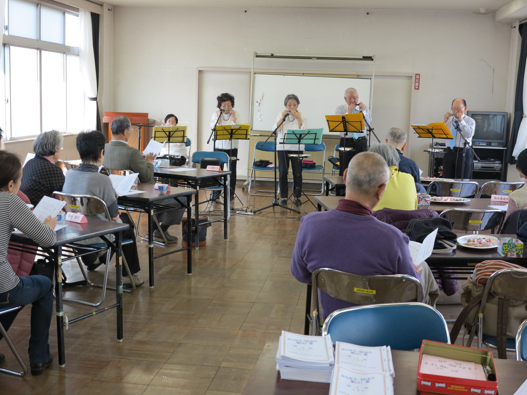 3月のふれあいサロンは、3月18日(月)13:00〜15:00公民館で開催され、倉田会さんによる健康体操と三月恒例の行事となった感のある【ひまわりハーモニカクラブ】の皆さんによるハーモニカ演奏の二部構成で、総勢21名の参加がありました。まず倉田会看護師さんご指導で手作り“アンピグラム”と“鏡文字”によると脳トレ体操とストレッチで頭と体をほぐし、ハーモニカ演奏とそれを伴奏にして、用意して頂いた歌集で合唱を楽しみました。今回出演メンバーは男性2名、女性3名の5名で構成され、前半は複音ハーモニカと後半は重低音のハーモニカと複数のハーモニカを巧みに使い分けられ、故郷、春の小川などの童謡や唱歌から、星影のワルツ、知床旅情、悲しい酒等の流行歌、休みを取ることなく立て続けに全22曲演奏して頂きました。演奏された曲は、参加者の皆さんのご存知のものばかりで、心地よく流麗な伴奏に乗せられ、懐かしく思い出に浸りながら歌声を上げて合唱しました。最後に「ひまわりハーモニカクラブ」の皆さんに感謝の大拍手を送ってお開きとなりました。
