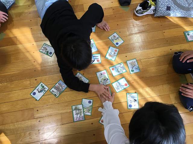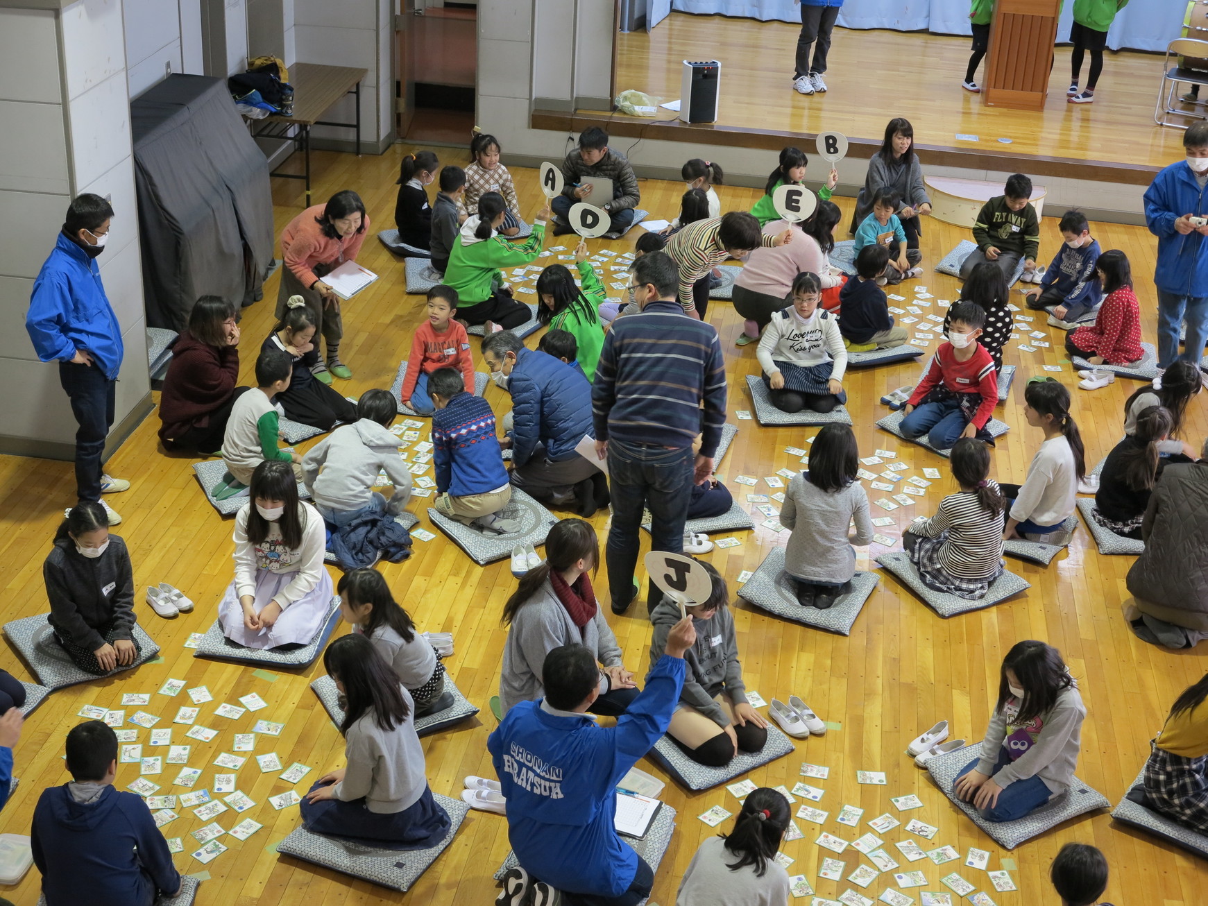 四之宮地区青少年指導委員と社会福祉協議会の『社会を明るくする運動』との共催で、大野小学校児童を対象に毎年恒例の“四之宮歴史かるた大会”が1月13日(土)四之宮ふれあいセンターで9時30分から13時まで開催されました。この大会はかるた取りという遊びを通して四之宮地区の歴史に触れ郷土愛を育むとともに新春のひと時をみんなで仲良く楽しく過ごしてもらうためのものです。開会の辞、大野小学校の校長先生、来賓の皆様のあいさつの後、参加者約120名は二つのグループに分かれ、それぞれが学年別に5名から6名の班になり座布団に輪になって座り一回戦と二回戦を戦いました。各班にはそれぞれ審判と札取り終了の合図係が付き、太鼓の音の終了を待って読み上げ係が札を読み上げ、競技を行います。半分ぐらいの札が取り上げられたら、札をシャッフルし、残り2枚になったら2枚とも1枚を取った人のものとなり、又お手付きは一回休み、同時着手はじゃんけん決着、等々が大体のルールです。読み上げ係は神明中学ボランティアの女生徒の皆さんが交代で、合図係と審判には学校関係者、社協役員や神明中の女生徒の皆さん等にお手伝い頂きました。44枚のかるた札を取り合う競技を2回行い、2回戦で最も多くの札を獲得した各班の児童にラッキー賞として図書カードが配られました。その後お楽しみのビンゴゲームが行われ会場は大いに盛り上がりました。その後表彰式が行われ、各学年の最多札獲得者6名が大会会長から表彰状を授与され散会となりました。