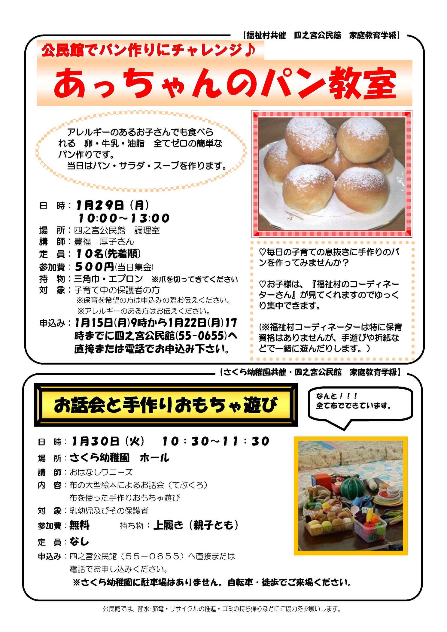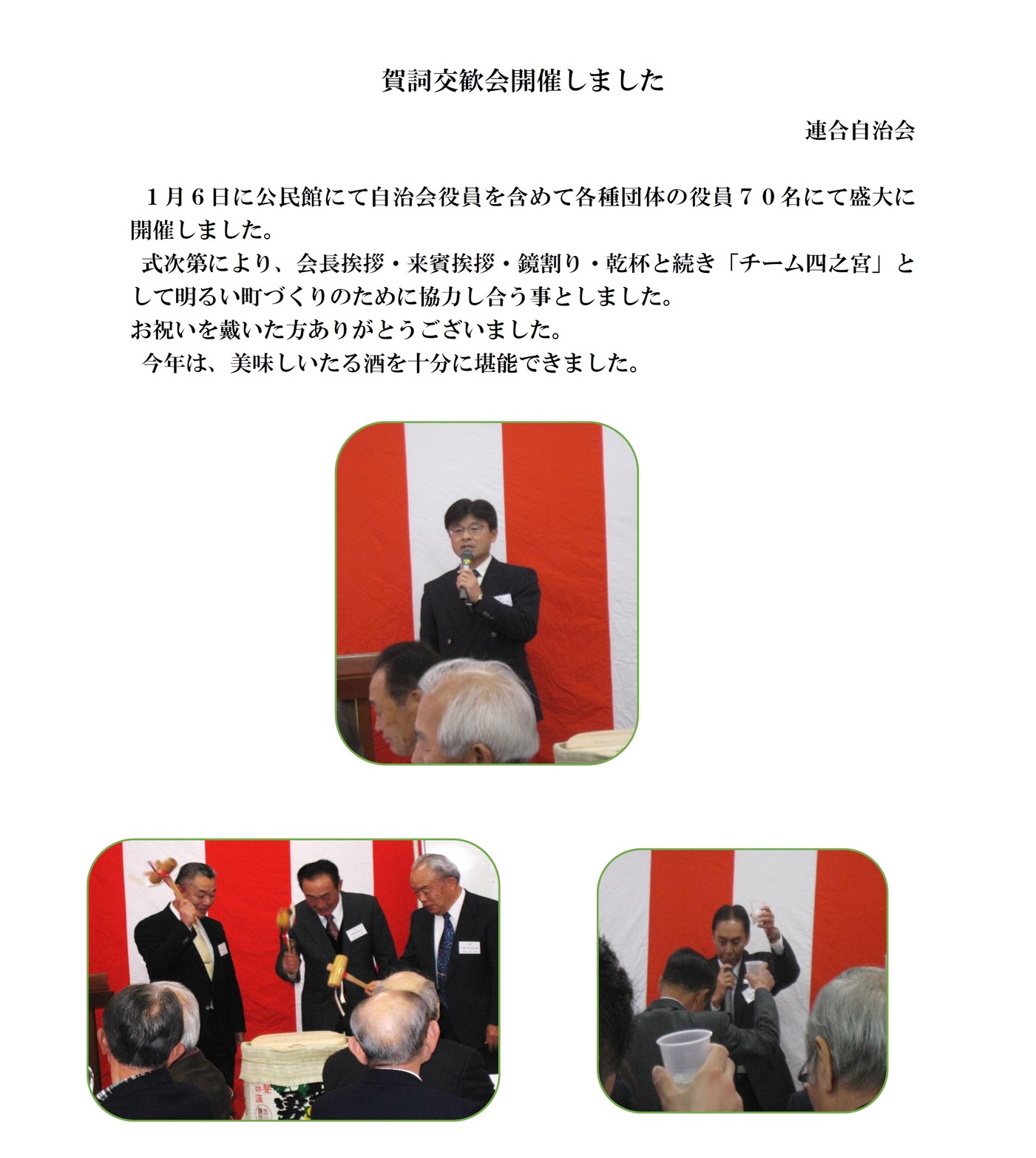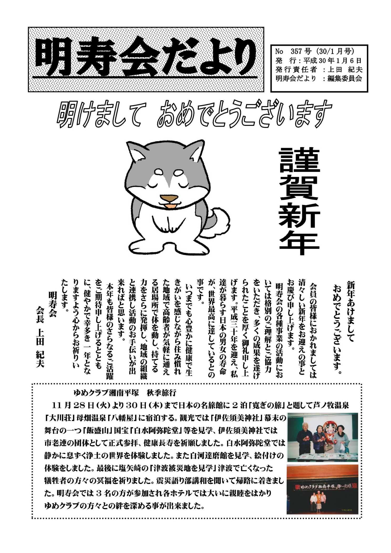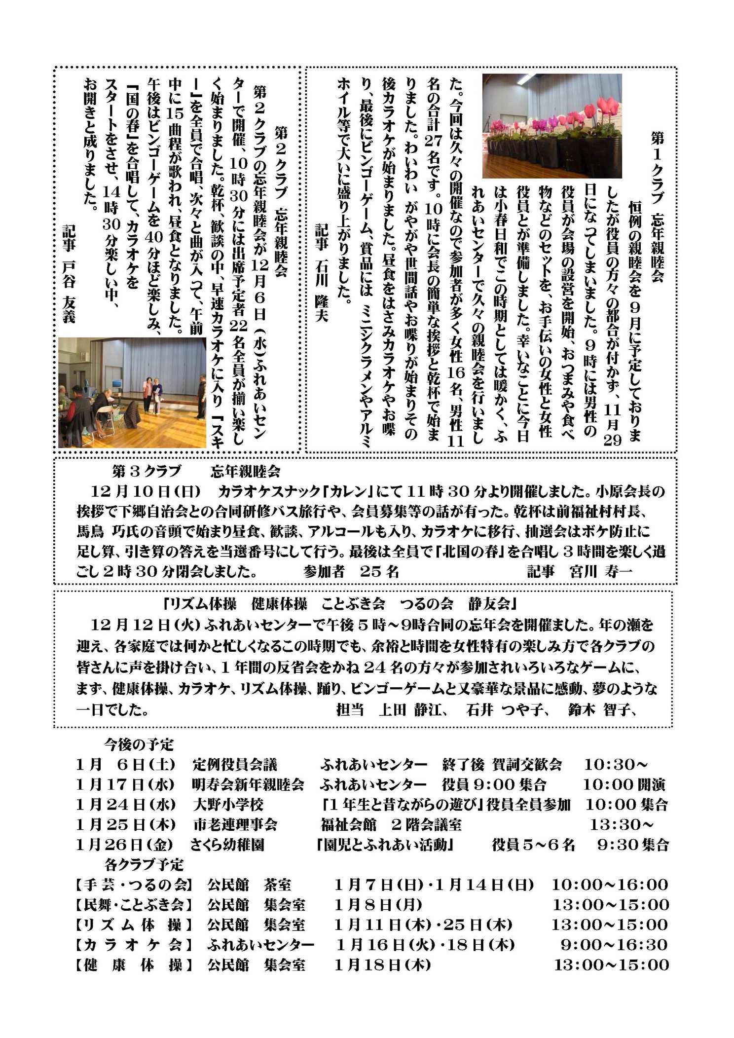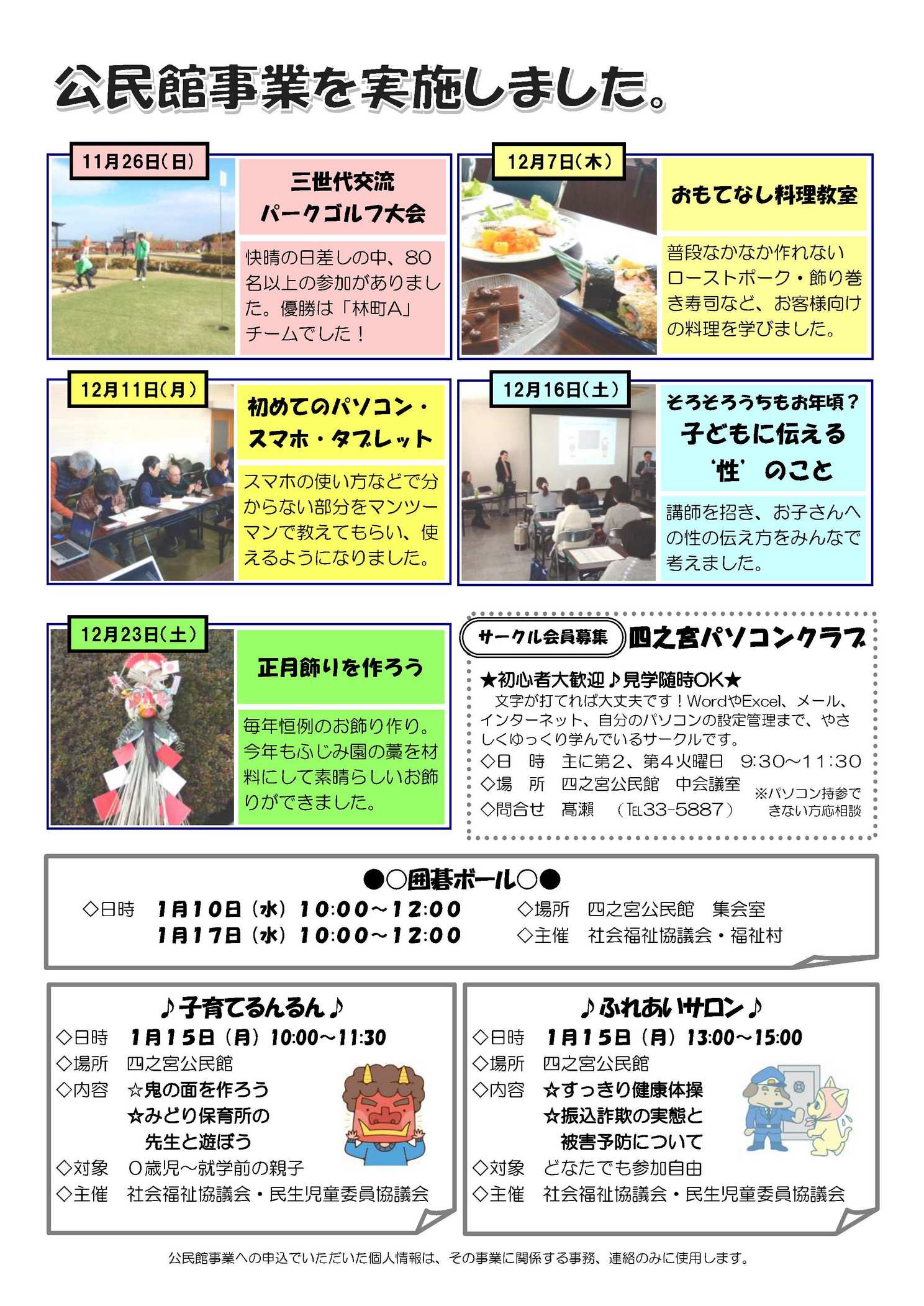 内容は、四之宮地区社会福祉協議会進藤会長の新年の挨拶、昨年10月と12月に行われた赤い羽根及び年末助け合いの両共同募金のそれぞれの結果とそれにたいする御礼、社協行事カレンダー、昨年11月20日開催された「社会を明るくする運動」の報告、ふれあいサロンと子育てるんるんの活動の紹介とそれらへの参加のお誘いです。