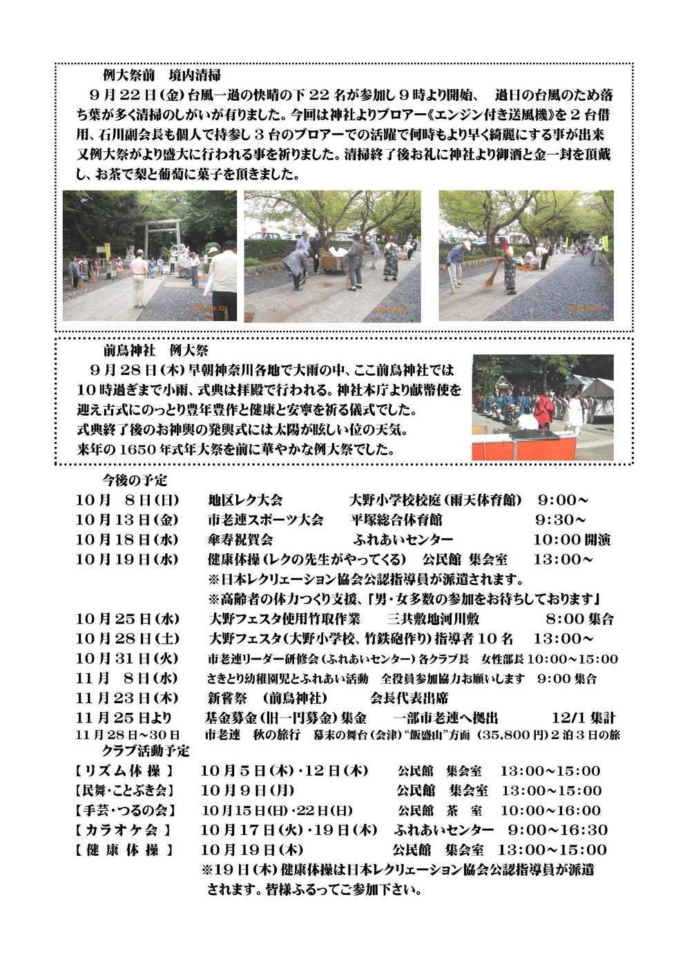 ゆめクラブ湘南平塚 福祉大会 静友会の集い 仲良し旅行 (秋の駿河路めぐり) 【2面】 例大祭前 境内清掃 前鳥神社 例大祭 今後の予定 10月 8日(日) 地区レク大会 大野小学校校庭(雨天体育館) 9:00〜 10月13日(金) 市老連スポーツ大会 平塚総合体育館 9:30〜 10月18日(水) 傘寿祝賀会 ふれあいセンター 10:00開演 10月19日(水) 健康体操(レクの先生がやってくる) 公民館 集会室 13:00〜 ※日本レクリェーション協会公認指導員が派遣されます。 ※高齢者の体力つくり支援、「男・女多数の参加をお待ちしております」 10月25日(水) 大野フェスタ使用竹取作業 三共敷地河川敷 8:00集合 10月28日(土) 大野フェスタ(大野小学校、竹鉄砲作り)指導者10名 13:00〜 10月31日(火) 市老連リーダー研修会(ふれあいセンター)各クラブ長 女性部長10:00〜15:00 11月 8日(水) さきとり幼稚園児とふれあい活動 全役員参加協力お願いします 9:00集合 11月23日(木) 新嘗祭 (前鳥神社) 会長代表出席 11月25日より 基金募金(旧一円募金)集金 一部市老連へ拠出 12/1集計 11月28日〜30日 市老連 秋の旅行 幕末の舞台(会津)“飯盛山”方面 (35,800円)2泊3日の旅 クラブ活動予定 【リズム体操】 10月5日(木)・12日(木) 公民館 集会室 13:00〜15:00 【民舞・ことぶき会】 10月9日(月) 公民館 集会室 13:00〜15:00 【手芸・つるの会】 10月15日(日)・22日(日) 公民館 茶室 10:00〜16:00 【カラオケ会】 10月17日(火)・19日(木) ふれあいセンター 9:00〜16:30 【健康体操】 10月19日(木) 公民館 集会室 13:00〜15:00 ※19日(木)健康体操は日本レクリェーション協会公認指導員が派遣 されます。皆様ふるってご参加下さい。 |
