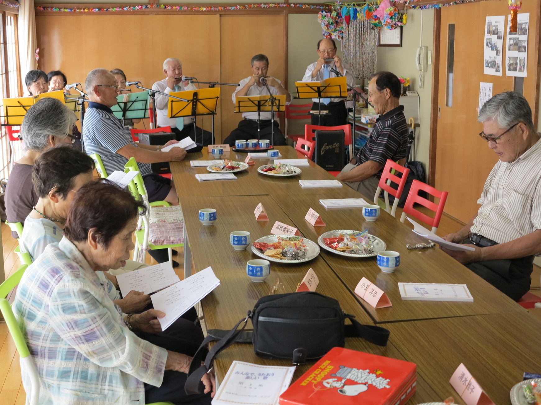 9月のふれあいサロンは、急遽予定を変更して、“ひまわりハーモニカクラブ”皆さんにお願いして、「大きな声で歌おう」を眼目に9月18日(月)敬老の日に公民館で開催しました。台風通過のすぐ後、又“高齢者の集い”からまだ間がないということもあり、参加者は13名と小規模な会となりましたが、6名のクラブメンバーの方々の熱演のおかげで、十分に堪能できました。