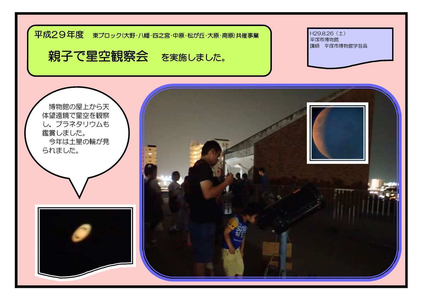 デイキャンプ 8月19日(土) 四宮公民館全館で デイキャンプ を実施しました。 宝探し・カレーライス作り・すいか割り・かき氷・ゴム鉄砲づくり・的当て・流しそうめん・・・・夏のイベントを一日で満喫しました! 空気で遊ぼう 8月23日(水) 四之宮公民館集会室で 空気で遊ぼう を実施しました。 博物館学芸員の塚田さんから、空気の不思議な力や浮沈子(ふちんし)の作り方を教わりました。ペットボトルの中で魚が浮き沈みするのが驚きでした! 博物館のインターンの大学生も手伝ってくれました。 親子で星空観察会 8月26日(土)平塚市博物館で 親子で星空観察会 を実施しました。 博物館の屋上から天体望遠鏡で星空を観察し、プラネタリウムも鑑賞しました。今年は土星の輪が見られました。 アンティーズによるコンサートwithリトミック 9月18日(月・祝) 四宮公民館集会室で アンティーズによるコンサートwithリトミック を実施しました。 子育てるんるんとの共催で、アンティーズによるコンサートとリトミックをしました。当日は台風一過で天気も良く、親子で楽しい時間を過ごせました。 大学生ボランティアも参加してくれました。 参加していただいたみなさま、ありがとうございました。 |