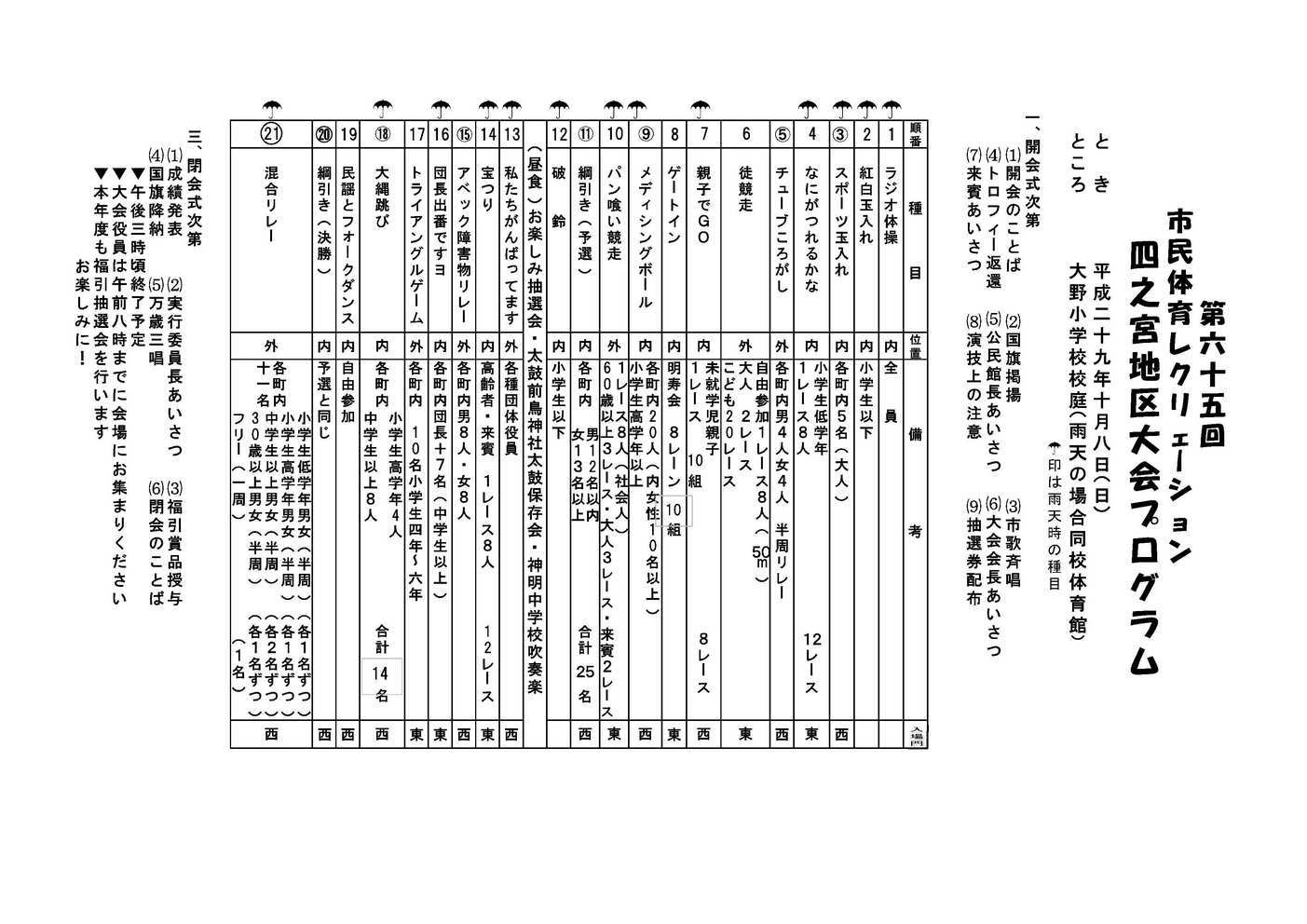平成29年度第65回市民体育レクリエーション四之宮地区大会が開催されます。 開催月日 : 10月8日(日)9時から 開催場所 : 大野小学校校庭(雨天時は同校体育館) 競技等の詳細はプログラムをご覧ください。 お隣同士誘い合って多数の方の参加をお待ちしています。 | |