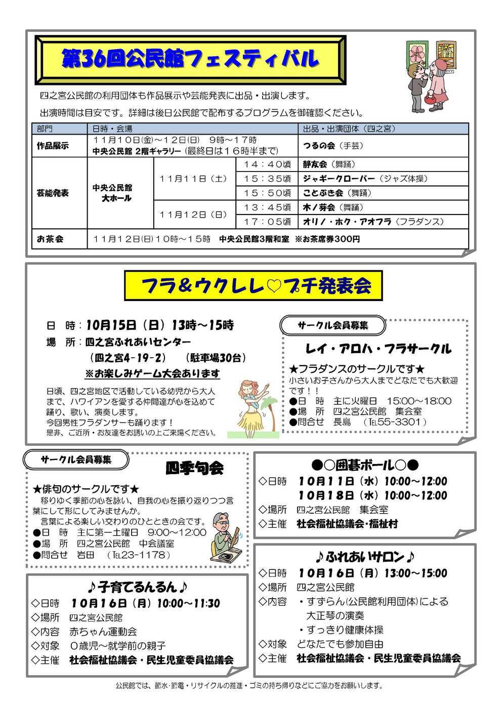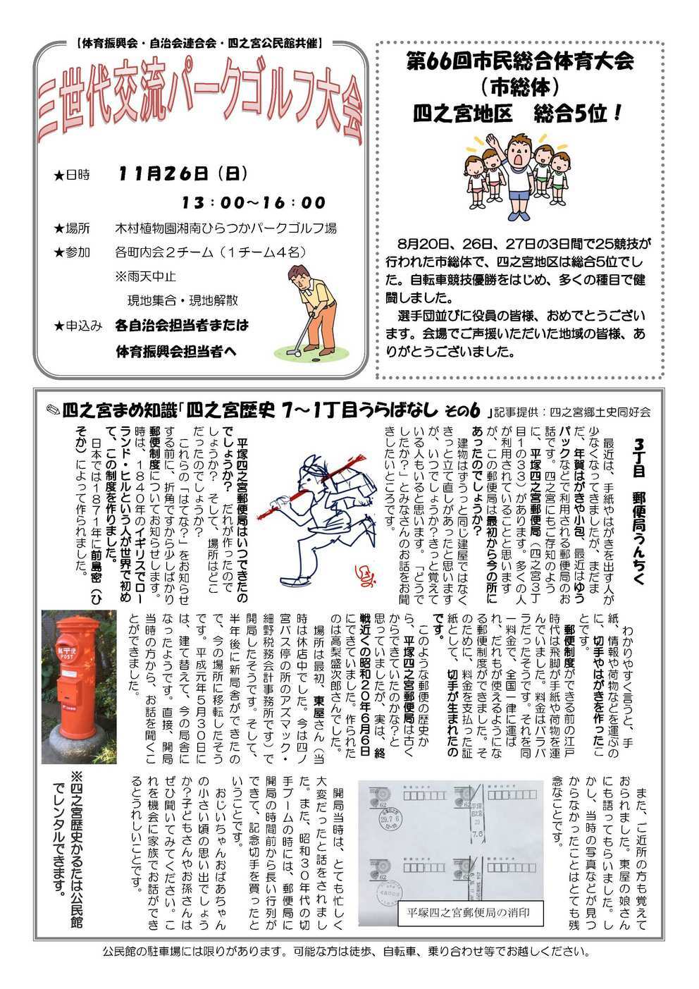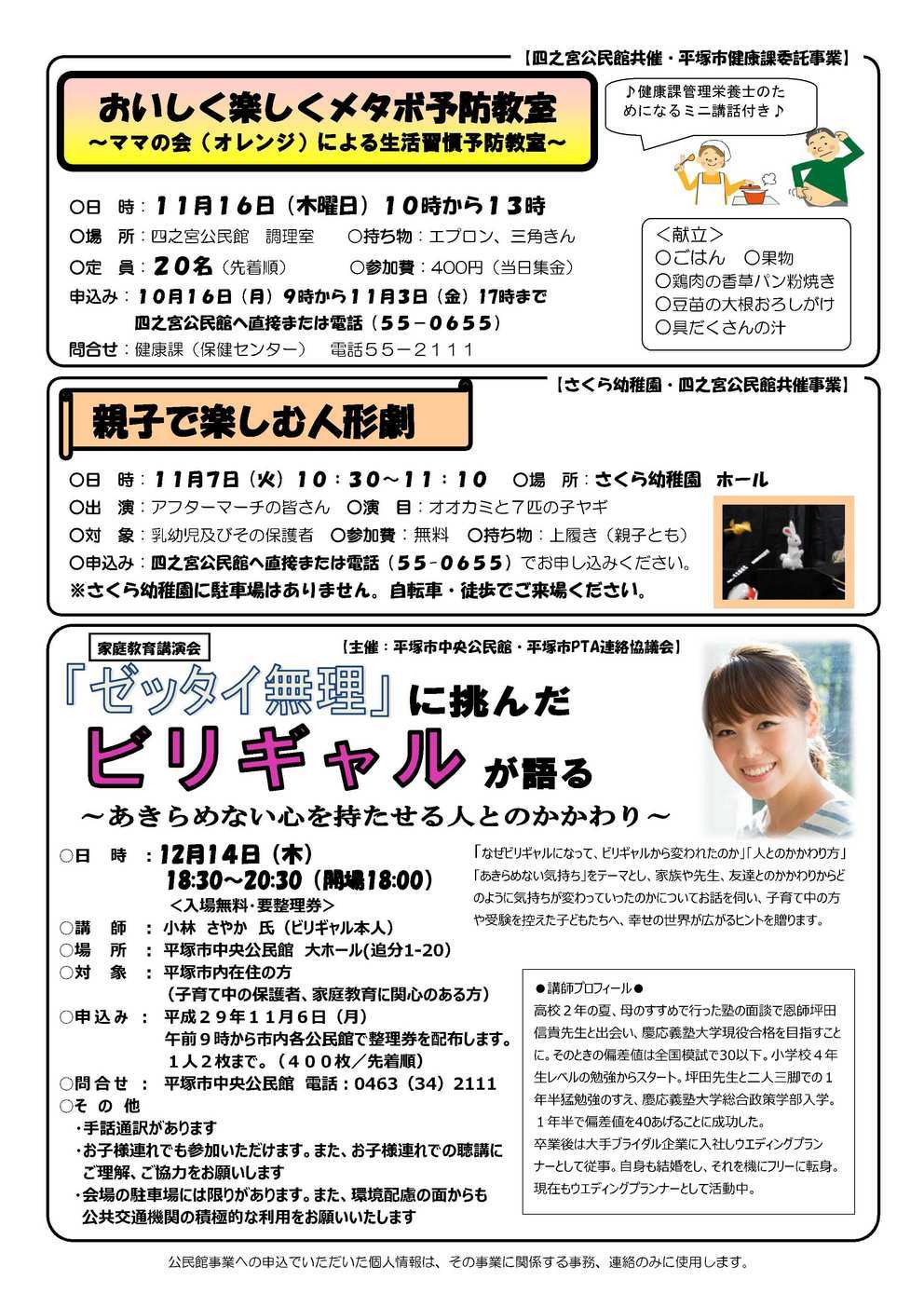 『ひきこもり50万人時代の教育論「親が変われば、子は育つ」』 11月19日(日)10:00〜11:50 中原公民館 ホール 『行くぜ!J1!!湘南ベルマーレを応援しよう!』 11月19日(日) 14:50〜19:00 Shonan BMWスタジアム平塚 【2面】 『おいしく楽しくメタボ予防教室』 11月16日(木) 10:00〜13:00 四之宮公民館 調理室 『親子で楽しむ人形劇』 11月7日(木) 10:30〜11:10 さくら幼稚園 ホール 『「ゼッタイ無理」に挑んだビリギャルが語る』 12月14日(木) 18:30〜20:30 中央公民館 大ホール 【3面】 『第36回公民館フェスティバル』 作品展示 11月10日(金)〜12日(日) 9時〜17時 中央公民館 2階ギャラリー (最終日は16時半まで) 芸能発表 11月11日(土) 10時〜16時半 11月12日(日) 10時〜17時半 中央公民館 大ホール お茶会 11月12日(日)10時〜15時 中央公民館3階和室 ※お茶席券300円 『フラ&ウクレレ♡プチ発表会』 10月15日(日) 13:00〜15:00 四之宮ふれあいセンター 『サークル会員募集:レイ・アロハ・フラサークル』 『サークル会員募集:四季句会』 『囲碁ボール』 10月11日(水)・18日(水) 10:00〜12:00 四之宮公民館 集会室 『子育てるんるん』 10月16日(月) 10:00〜11:30 四之宮公民館 『ふれあいサロン』 10月16日(月) 13:00〜15:00 四之宮公民館 【4面】 『3世代交流パークゴルフ大会』 11月26日(日)13:00〜16:00 木村植物園湘南ひらつかパークゴルフ場 『第66回市民総合体育大会 (市総体)四之宮地区 総合5位!』 『「四之宮歴史7〜1丁目 うらばなし その6」』 |