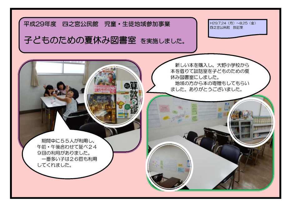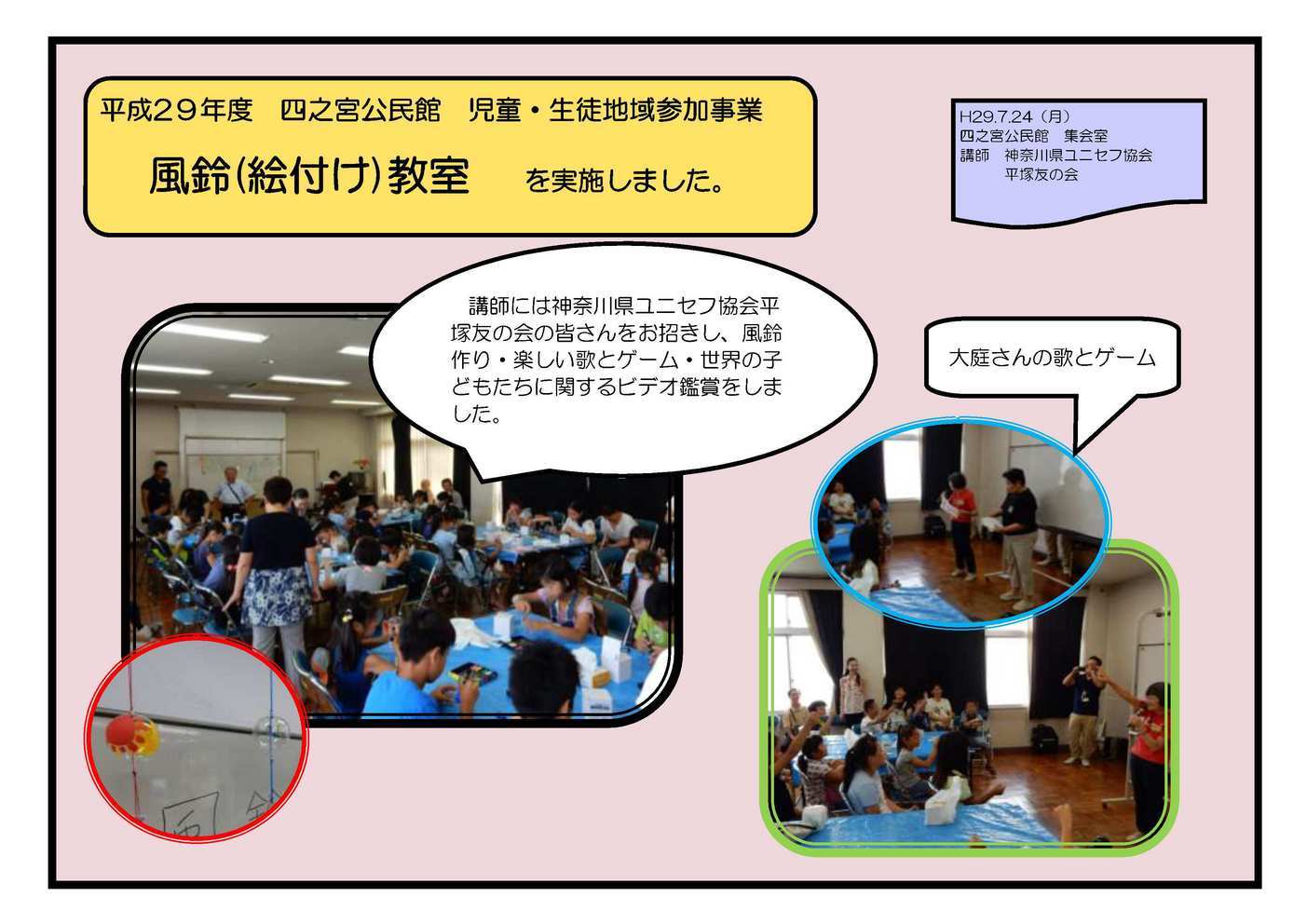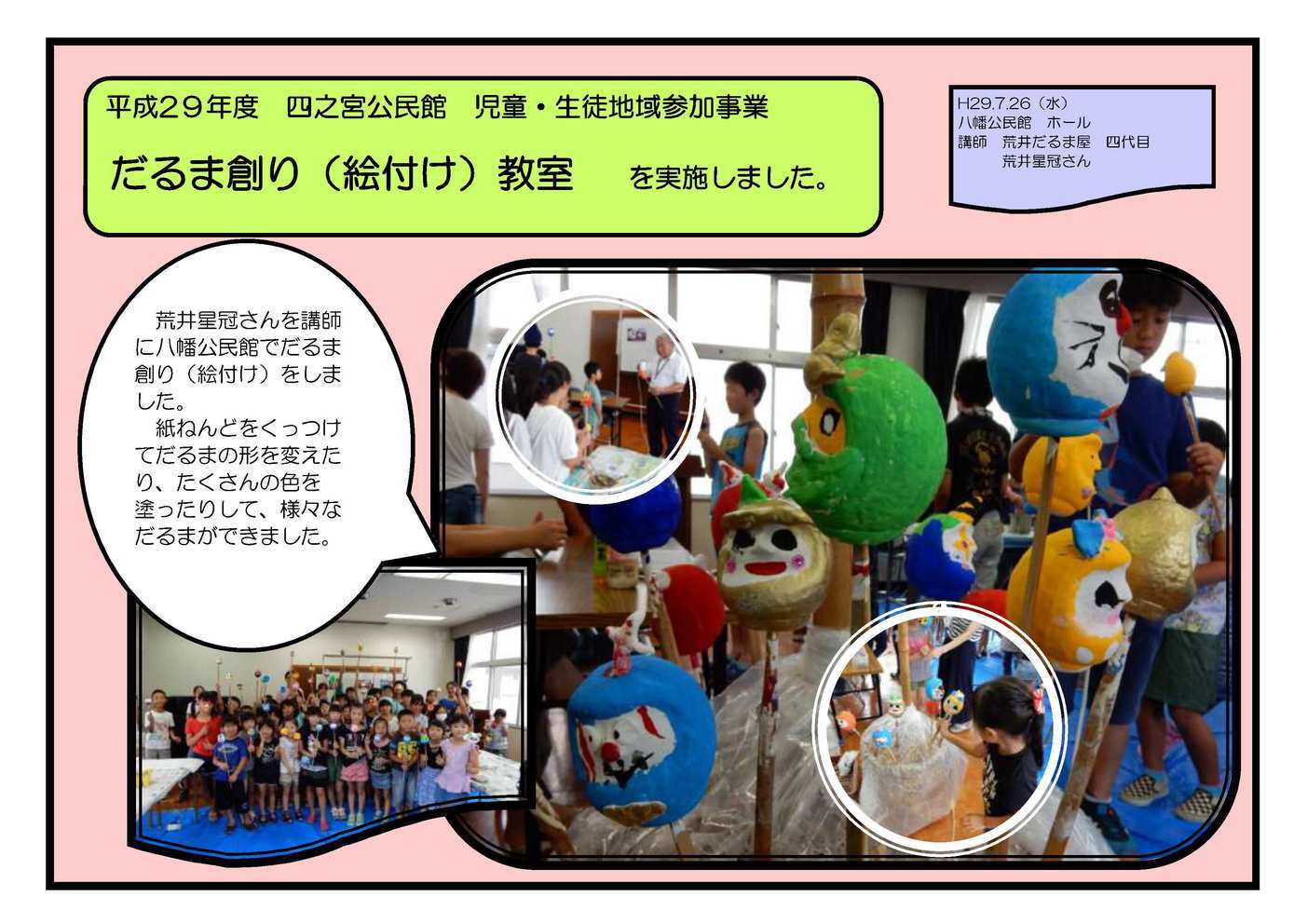 男の料理教室 7月20日(木) 四之宮公民館調理室で 男の料理教室 を実施しました。 ママの会オレンジのみなさんを講師に、男性限定の料理教室をしました。和気あいあとトンテキやスープなどを作り、みんなで美味しくいただきました。 風鈴(絵付け)教室 7月24日(月) 四之宮公民館集会室で 風鈴(絵付け)教室 を実施しました。 講師には神奈川県ユニセフ協会平塚友の会の皆さんをお招きし、風鈴作り・楽しい歌とゲーム・世界の子どもたちに関するビデオ鑑賞をしました。 だるま創り(絵付け)教室 7月26日(水) 八幡公民館でだるま創り(絵付け)教室 を実施しました。 荒井星冠さんを講師に八幡公民館でだるま創り(絵付け)をしました。紙ねんどをくっつけてだるまの形を変えたり、たくさんの色を塗ったりして、様々なだるまができました。 子どものための夏休み図書室 7月24日(月)から8月25日(金)までの平日9時〜17時、四宮公民館談話室を開放し 子どものための夏休み図書室 を実施しました。 期間中に55人が利用し、午前・午後合わせて延べ249回の利用がありました。一番多い子は26回も利用してくれました。 参加していただいたみなさま、ありがとうございました。 |