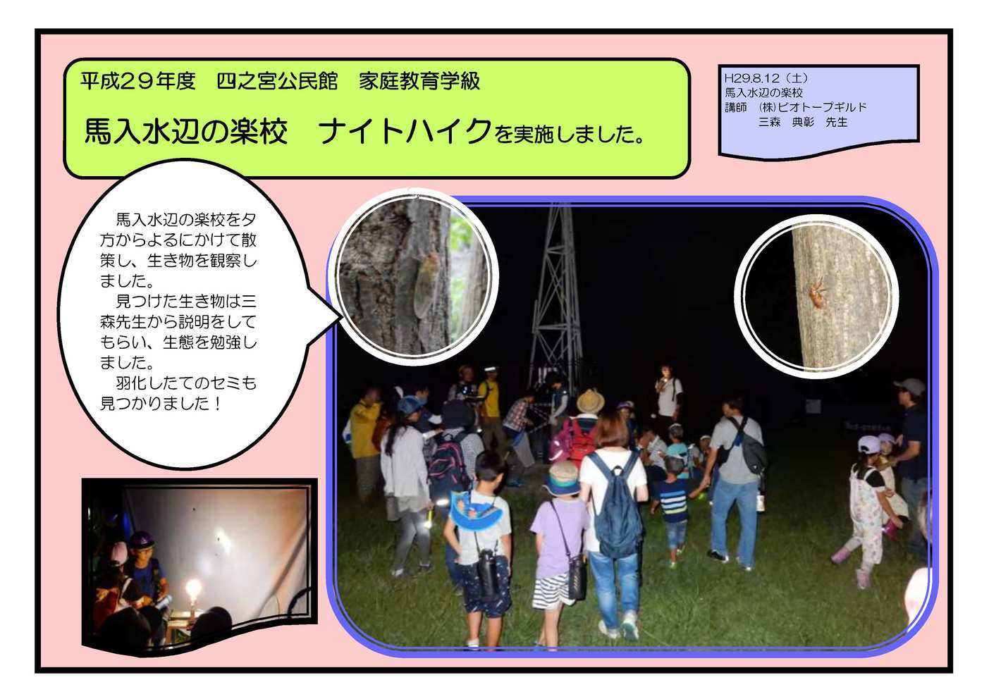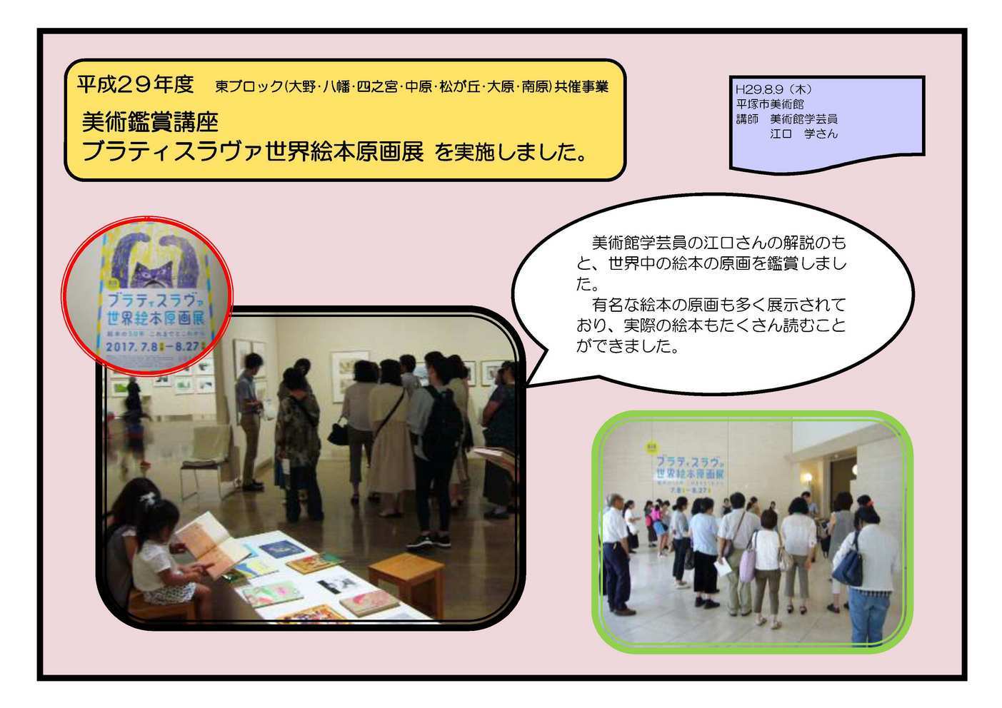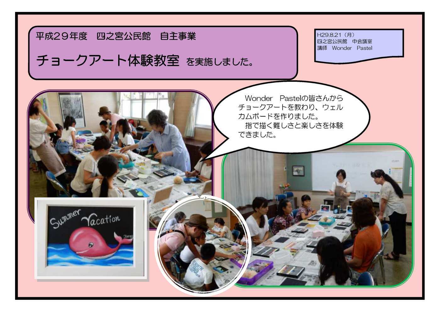 陶芸教室 8月3日(木) 四之宮公民館集会室で 陶芸教室 を実施しました。 陶芸家の岡村先生達から作り方を教わりました。公民館利用団体の楽窯会に協力していただきました。 美術鑑賞講座 ブラティスラヴァ世界絵本原画展 8月9日(木) 平塚市美術館で 美術鑑賞講座 ブラティスラヴァ世界絵本原画展 を実施しました。 美術館学芸員の江口さんの解説のもと、世界中の絵本の原画を鑑賞しました。有名な絵本の原画も多く展示されており、実際の絵本もたくさん読むことができました。 馬入水辺の楽校 ナイトハイク 8月12日(土)馬入水辺の楽校で 馬入水辺の楽校 ナイトハイク を実施しました。 馬入水辺の楽校を夕方からよるにかけて散策し、生き物を観察しました。見つけた生き物は三森先生から説明をしてもらい、生態を勉強しました。羽化したてのセミも見つかりました! チョークアート体験教室 8月21日(月) 四宮公民館中会議室で チョークアート体験教室 を実施しました。 Wonder Pastelの皆さんからチョークアートを教わり、ウェルカムボードを作りました。指で描く難しさと楽しさを体験できました。 参加していただいたみなさま、ありがとうございました。 |
