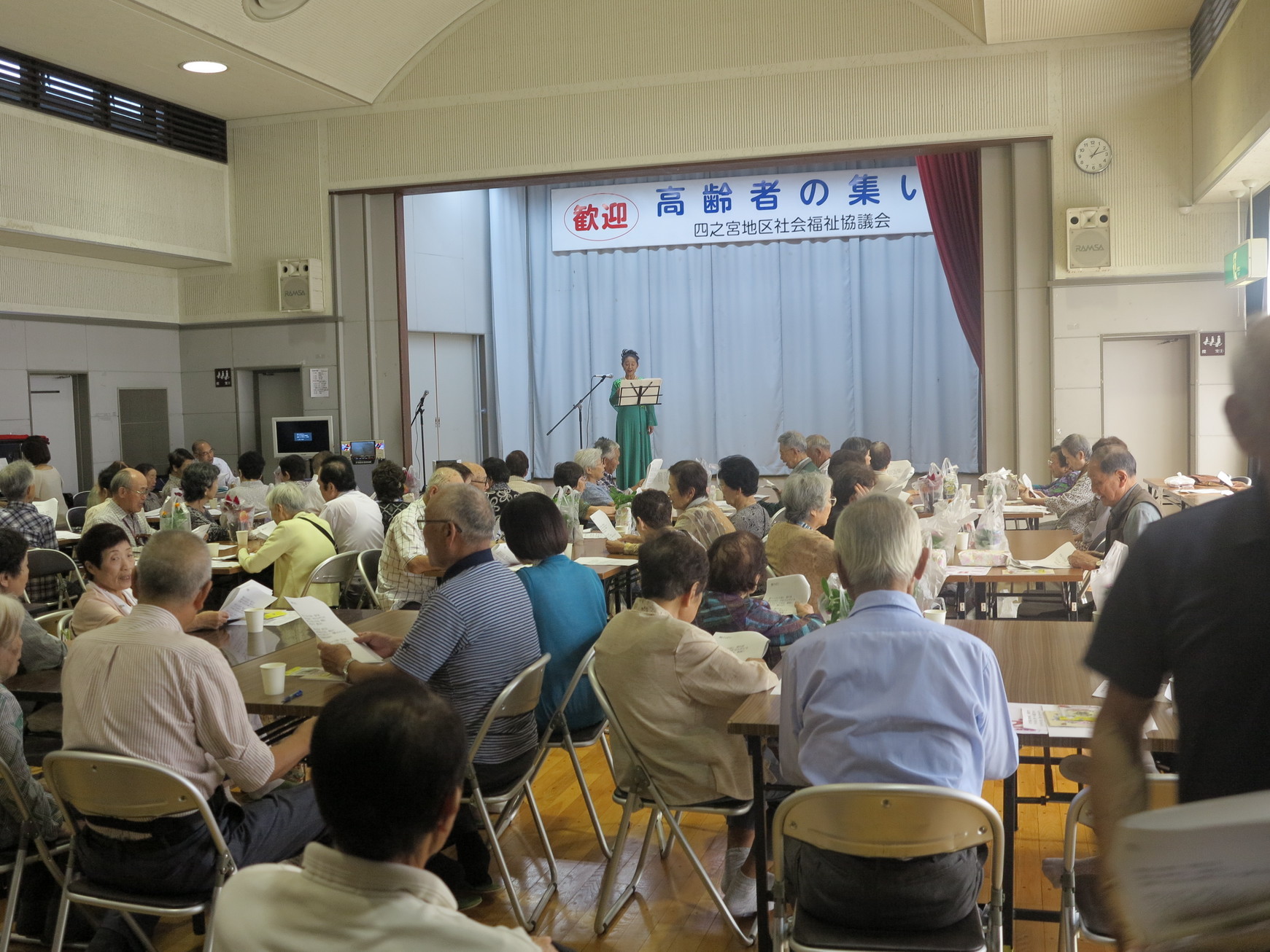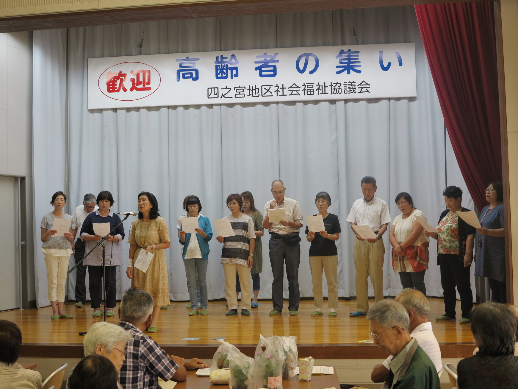 参加者59人、社協協力団体のママの会、ボランティアの方々、自治会、ふじみ園、倉田会、明寿会、民生児童委員等々の協力者66人やご来賓で、合計125人と昨年を若干上回る多くの方々に出席いただきました。 主催者のあいさつ、ご来賓の祝辞の後、昼食にママの会の季節の野菜や食材を使った心づくしの手作りの弁当の献立説明の後、皆さんにご賞味いただきました。 その後、お楽しみ抽選会(空クジなし)が行われ、各参加者に種類の異なるお花とお菓子のセットの景品が贈呈されました。 倉田会看護師さんの暮らしの健康手帳の説明や脳リハビリ体操を行った後、地元四之宮ご出身の総合芸術学園ボア・コロンブの主宰者で声楽家の高橋セツ子さんによる童謡や唱歌の独唱(ピアノ伴奏付き)に合わせ、予め配布された歌詞を見ながら懐かしい“どこかで春が”から“アザミの歌”、など皆さんご存知のメロディー全13曲を大きな声で合唱しました。その後これも恒例となりました、民生児童委員総出の“この街で”の合唱の後、参加者全員で“北国の春”を歌って、お開きとなりました。 |
