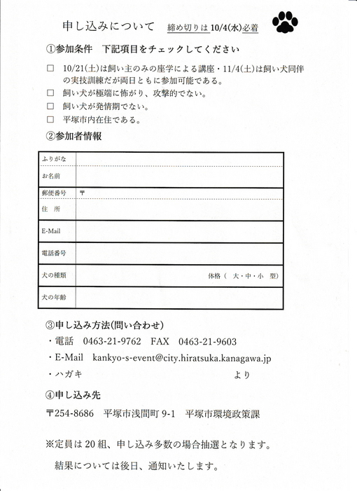 正しい飼い方を覚えて犬との楽しい生活を送りましょう 第1回目 講義 10月21日(土)10時から 第2回目 講義 11月4日(土)午前中 会 場 リサイクルプラザ |