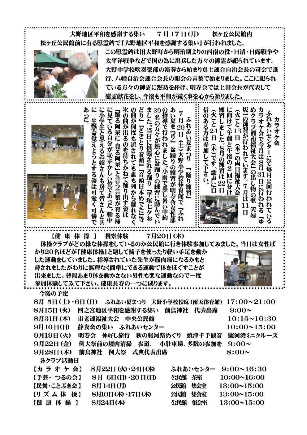 明寿会 夏期親睦会 明寿会 なかよし旅行 八坂神社例祭 訃報 【2面】 大野地区平和を感謝する集い カラオケ会 ふれあい夏まつり 「踊り練習」 【健 康 体 操 】 視察体験 今後の予定 8月 5日(土)・6日(日) ふれあい夏まつり 大野小学校校庭(雨天体育館) 17:00〜21:00 8月15日(火) 四之宮地区平和を感謝する集い 前鳥神社 代表出席 9:00〜 8月31日(木) 市老連福祉大会 中央公民館 10:15〜16:30 9月10日(日) 静友会の集い ふれあいセンター 10:00〜15:00 9月19日(火) 明寿会 仲好し旅行 秋の駿河路めぐり 焼津千手観音 駿河湾ミニクルーズ 9月22日(金) 例大祭前の境内清掃 参道、 小駐車場、多数の参加を 9:00〜 9月28日(木) 前鳥神社 例大祭 式典代表出席 8:00〜 各クラブ活動日 【カ ラ オ ケ 会】 8月22日(火)・24日(木) ふれあいセンター 9:00〜16:30 【手芸・ つるの会】 8月 6日(日)・20日(日) 公民館 茶室 10:00〜16:00 【民舞・ことぶき会】 8月 14日(月) 公民館 集会室 13:00〜15:00 【リ ズ ム 体 操】 8月10日(木)・17日(木) 公民館 集会室 13:00〜15:00 【健 康 体 操 】 8月24日(木) 公民館 集会室 13:00〜15:00 |