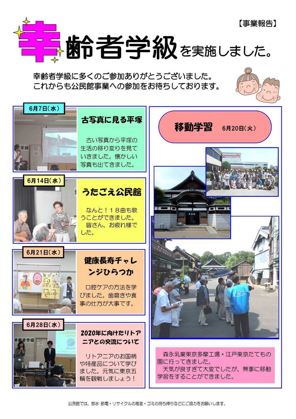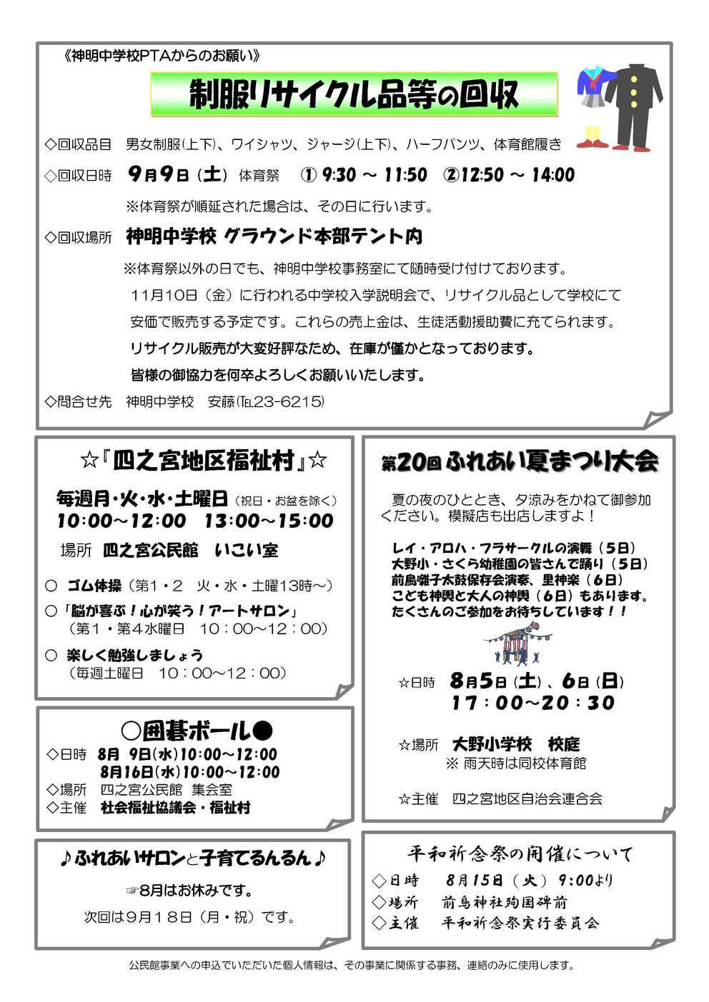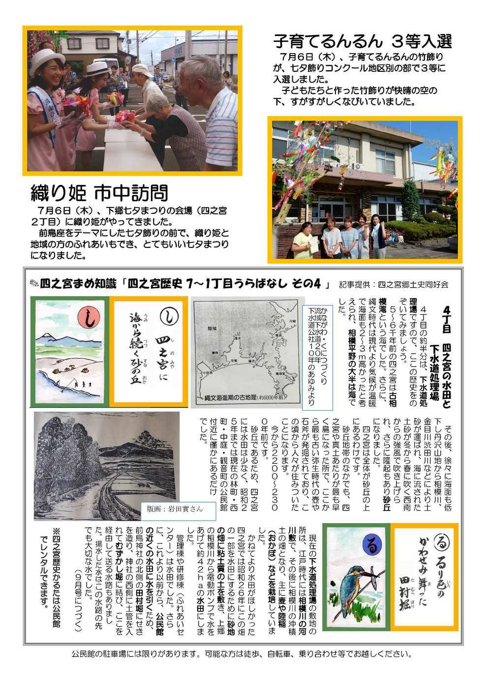 『講師・ボランティアが見つかる!!知恵袋バンク』 『こどものための夏休み図書室』 7月24日(月)〜8月25日(金)※土日除く 9:30〜12:00 13:00〜17:00 四之宮公民館 談話室 【2面】 『幸齢者学級を開催しました。』 6月7日(水)古写真に見る平塚 6月14日(水)うたごえ公民館 6月20日(火)移動学習 6月21日(水)健康長寿チャレンジひらつか 6月28日(水)2020年に向けたリトアニアとの交流について 【3面】 『制服リサイクル品等の回収』 9月9日(土) 体育祭 @ 9:30 〜 11:50 A12:50 〜 14:00 ※体育祭が順延された場合は、その日に行います。 回収場所 神明中学校 グラウンド本部テント内 『四之宮地区福祉村』 毎週 月・火・水・土 曜日 10:00〜12:00 13:00〜15:00 四之宮公民館 いこい室 『第20回ふれあい夏まつり大会』 8月5日(土)・6日(日) 17:00〜20:30 大野小学校 『囲碁ボール』 8月9日(水)・16日(水) 10:00〜12:00 四之宮公民館 集会室 『子育てるんるん』 8月はお休みです。 『移動ふれあいサロン』 8月はお休みです。 『平和祈念祭の開催について』 8月15日(火) 9:00〜 前鳥神社殉国碑前 【4面】 織り姫 市中訪問 子育てるんるん 3等入選 四之宮まめ知識 「四之宮歴史7〜1丁目 うらばなし その4」 |