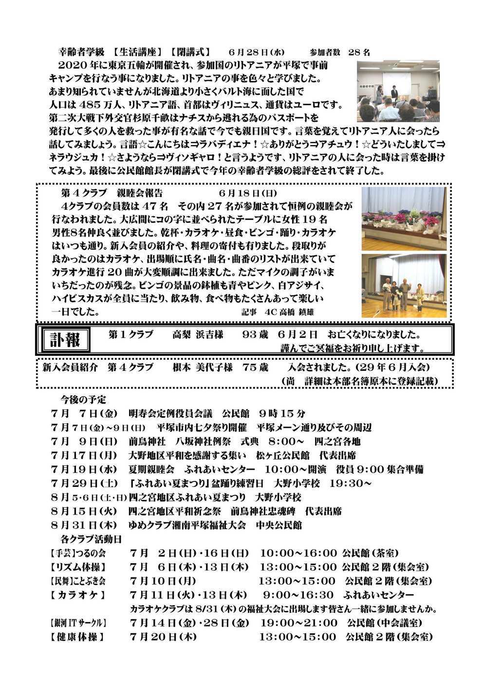 幸齢者学級「古写真に見る平塚」 幸齢者学級「趣味の講座」 幸齢者学級「移動学習」 幸齢者学級「健康講座」 【2面】 幸齢者学級「生活講座」 第 4 クラブ 親睦会報告 訃報 新入会員紹介 今後の予定 7 月 7 日(金) 明寿会定例役員会議 公民館 9 時 15 分 7 月 7 日(金)〜9 日(日) 平塚市内七夕祭り開催 平塚メーン通り及びその周辺 7 月 9 日(日) 前鳥神社 八坂神社例祭 式典 8:00〜 四之宮各地 7 月 17 日(月) 大野地区平和を感謝する集い 松ヶ丘公民館 代表出席 7 月 19 日(水) 夏期親睦会 ふれあいセンター 10:00〜開演 役員 9:00 集合準備 7 月 29 日(土) 「ふれあい夏まつり」盆踊り練習日 大野小学校 19:30〜 8 月 5・6 日(土・日)四之宮地区ふれあい夏まつり 大野小学校 8 月 15 日(火) 四之宮地区平和祈念祭 前鳥神社忠魂碑 代表出席 8 月 31 日(木) ゆめクラブ湘南平塚福祉大会 中央公民館 各クラブ活動日 【手芸】つるの会 7 月 2 日(日)・16 日(日) 10:00〜16:00 公民館(茶室) 【リズム体操】 7 月 6 日(木)・13 日(木) 13:00〜15:00 公民館 2 階(集会室) 【民舞】ことぶき会 7 月 10 日(月) 13:00〜15:00 公民館 2 階(集会室) 【 カ ラ オ ケ 】 7 月 11 日(火)・13 日(木) 9:00〜16:30 ふれあいセンター カラオケクラブは 8/31(木)の福祉大会に出場します皆さん一緒に参加しませんか。 【銀河 IT サークル】 7 月 14 日(金)・28 日(金) 19:00〜21:00 公民館(中会議室) 【健康体操】 7 月 20 日(木) 13:00〜15:00 公民館 2 階(集会室) |
