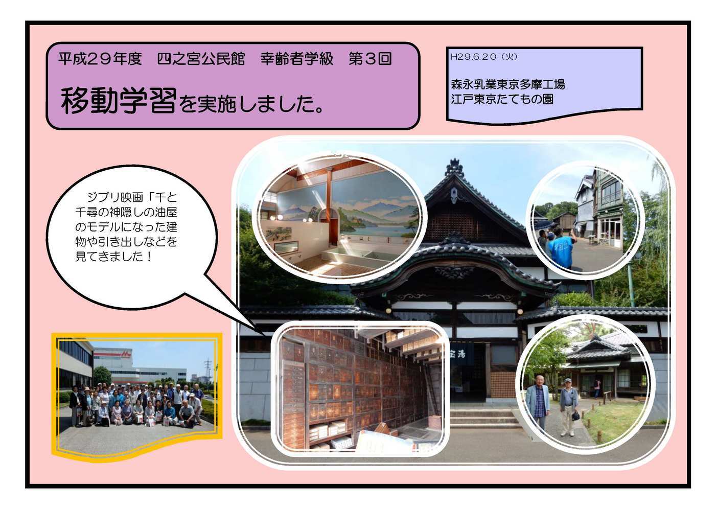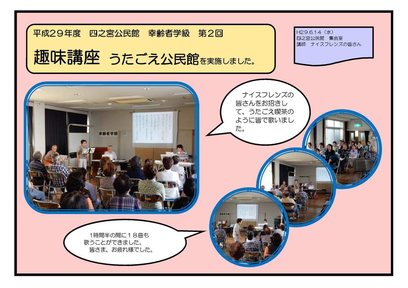 6月7日(水) 四之宮公民館集会室で幸齢者学級 第1回 「開講式と古写真に見る平塚」を実施しました。 講師には平塚市博物館 浜野達也さんをお招きし、古い写真から平塚の生活の移り変わりを話してもらいました。四之宮地区の 写真も何枚も出てきました。 趣味講座 6月14日(水) 四之宮公民館集会室で幸齢者学級 第2回 「うたごえ公民館」を実施しました。 ナイスフレンズの皆さんをお招きして、ギター、ピアノ、アコーディオンの演奏をバックにうたごえ喫茶のように皆で歌いました。 1時間半の間に18曲も歌うことができました。皆さま、お疲れ様でした。 移動学習 6月20日(火) 幸齢者学級 第3回「移動学習」を実施しました。 行先は東京都多摩方面で、「森永乳業東京多摩工場」と「江戸東京たてもの園」に行ってきました。当日は天気が良すぎて暑くて大変でしたが、無事に帰って来られました。 参加していただいたみなさま、ありがとうございました。 |
