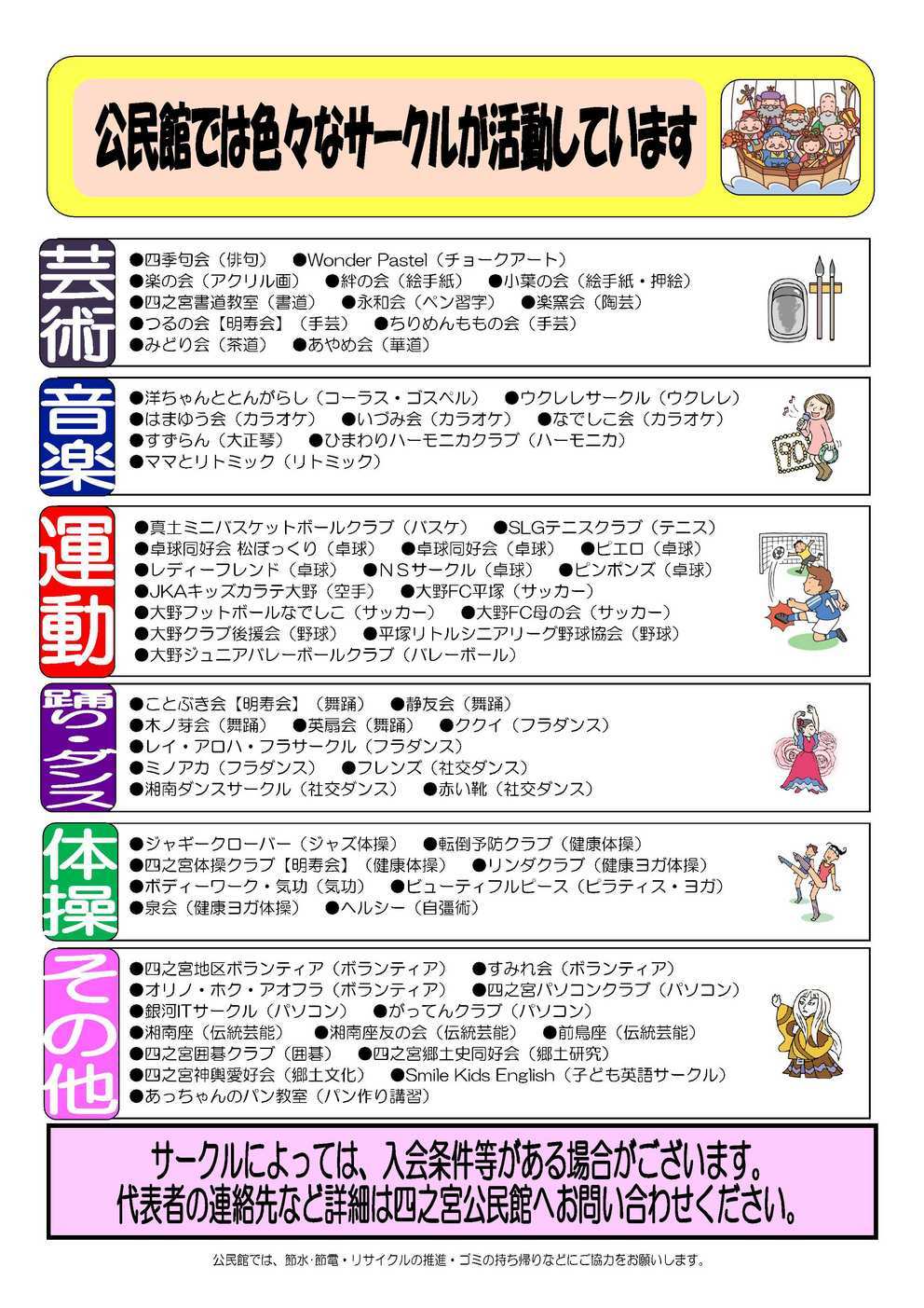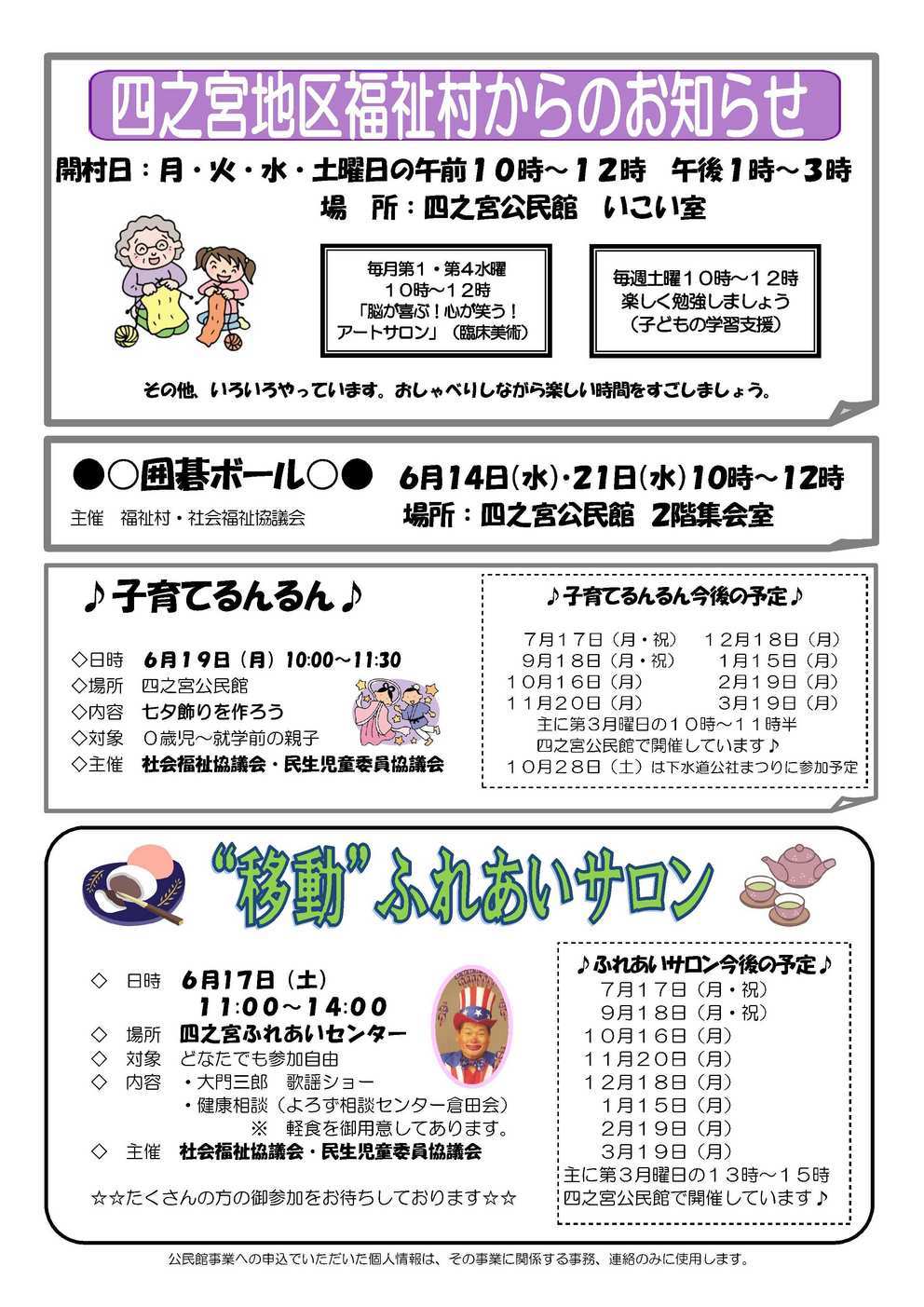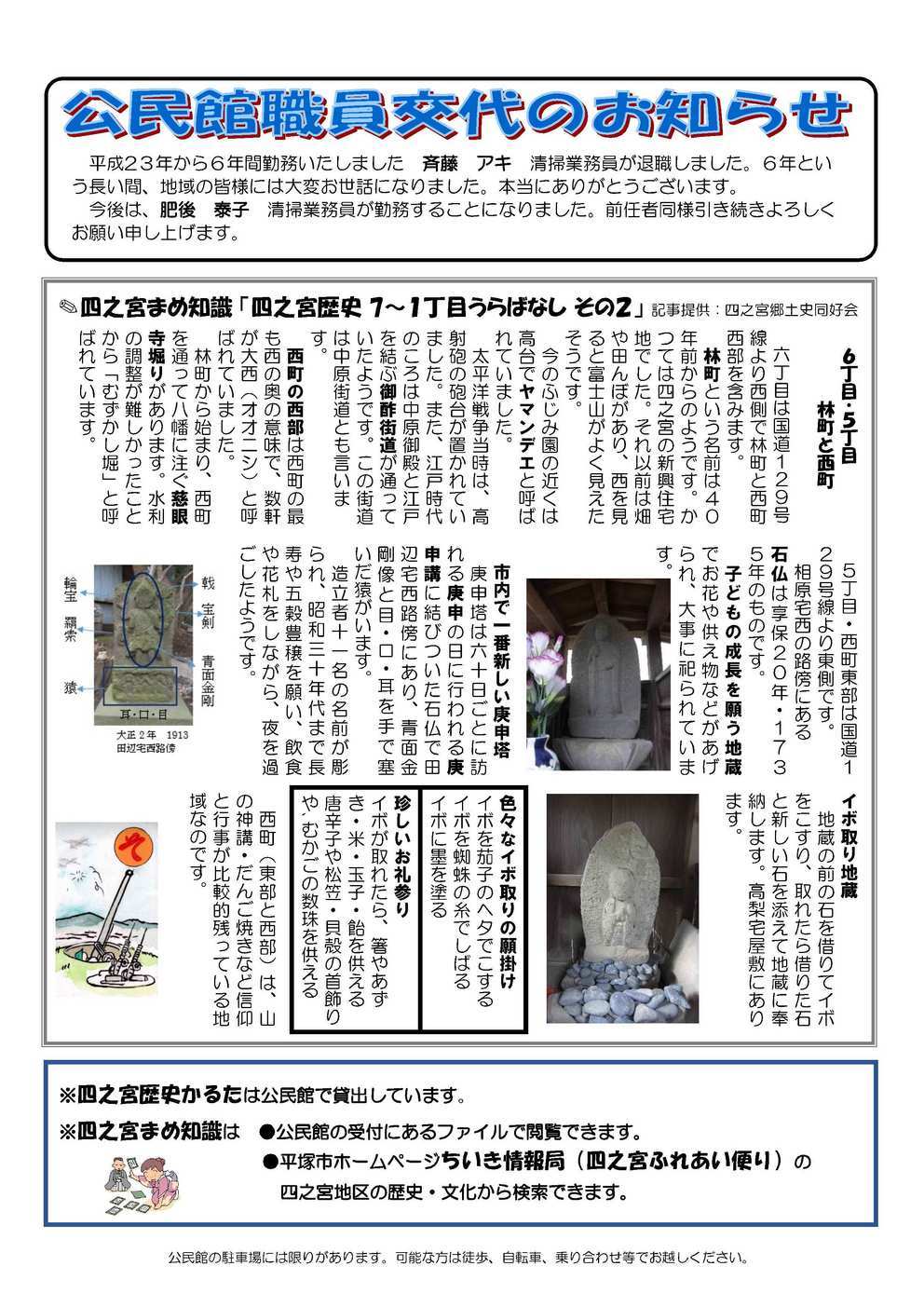 『男の料理教室』 7月20日(木) 10:00〜13:00 四宮公民館 調理室 『第22回 大野地区平和を感謝する集い』 7月17日(月・祝) 9:00〜12:00 松が丘公民館・大野殉国碑前 【2面】 『公民館では色々なサークルが活動しています』 サークルによっては入会条件等がある場合がございます。 代表者の連絡先など詳細は四宮公民館へお問い合わせください。 【3面】 『四之宮地区福祉村からのお知らせ』 毎週 月・火・水・土 10:00〜12:00 13:00〜15:00 四之宮公民館 いこい室 『囲碁ボール』 6月14日(水)・21日(水) 10:00〜12:00 四之宮公民館 2階集会室 『子育てるんるん』 6月19日(月) 10:00〜11:30 四之宮公民館 『移動ふれあいサロン』 6月17日(土) 11:00〜14:00 四之宮ふれあいセンター 【4面】 公民館職員交代のお知らせ 四之宮まめ知識 「四之宮歴史7〜1丁目 うらばなし その2」 |