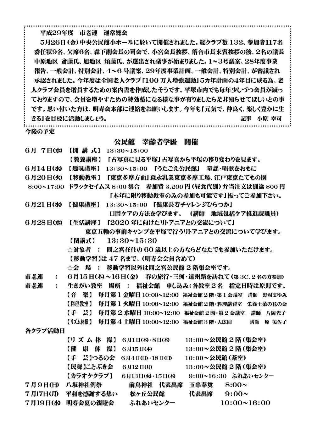 国府祭 新旧役員引き継ぎ研修旅行 新入会員紹介 訃 報 ご芳志 【2面】 平成29年度 市老連 通常総会 今後の予定 公民館 幸齢者学級 開催 6月 7日(水) 【開 講 式】【教養講座】 13:30〜15:00 「古写真に見る平塚」古写真から平塚の移り変わりを見ます。 6月14日(水) 【趣味講座】 13:30〜15:00 「うたごえ公民館」 童謡・唱歌をおもに 6月20日(火) 【移動教室】 8:00〜17:00 「東京多摩方面」森永乳業東京多摩工場、江戸東京たてもの園 ドラックセイムス 8:00 集合 参加費 3,200 円(昼食代別)弁当注文は別途 800 円 振ってご参加下さい。 6月21日(水) 【健康講座】 13:30〜15:00 「健康長寿チャレンジひらつか」 口腔ケアの方法を学びます。 (講師 地域包括ケア推進課職員) 6月28日(水) 【生活講座】【閉講式】 13:30〜15:30 「2020 年に向けたリトアニアとの交流について」 東京五輪の事前キャンプを平塚で行うリトアニアとの交流について学びます。 ☆対象者 : 四之宮在住の 60 歳以上の方ならどなたでも参加いただけます。 【移動学習】は 47 名まで。(明寿会会員含めて) ☆会 場 : 移動学習以外は四之宮公民館 2 階集会室です。 市老連 : 6月15日(木)〜16日(金) 春の旅行・三河・遠州路を訪ねて(第 3C、2 名の方参加) 市老連 : 生きがい教室 場所 : 福祉会館 申し込み:各教室 2 名 指定日時は原則です。 【音 楽】 毎月第 1 金曜日 10:00〜12:00 福祉会館 2 階・第 1 会議室 講師 野村まゆみ 【料理教室】 毎月第 1 火曜日 10:00〜12:00 福祉会館 2 階・料理講習室 栄養士菜の花の会 【手 芸】 毎月第 2 水曜日 10:00〜12:00 福祉会館 2 階・第 2 会議室 講師 片岡光子 【リズム体操】 毎月第 4 土曜日 10:00〜12:00 福祉会館 3 階・大広間 講師 原 美佐子 各クラブ活動日 【リ ズ ム 体 操】 6月1日(木)・8日(木) 13:00〜公民館 2 階(集会室) 【健康体 操】 6月15日(木) 13:00〜公民館 2 階(集会室) 【手 芸】つるの会 6月4日(日)・18日(日) 10:00〜公民館(茶室) 【民舞】ことぶき会 6月12日(月) 13:00〜公民館 2 階(集会室) 【カラオケクラブ】 6月13日(火)・15日(木) 9:00〜16:30 ふれあいセンター 7月 9日(日) 八坂神社例祭 前鳥神社 代表出席 玉串奉奠 8:00〜 7月17日(月) 平和を感謝する集い 松ヶ丘公民館 代表出席 9:00〜 7月19日(水) 明寿会夏の親睦会 ふれあいセンター 10:00〜16:00 |