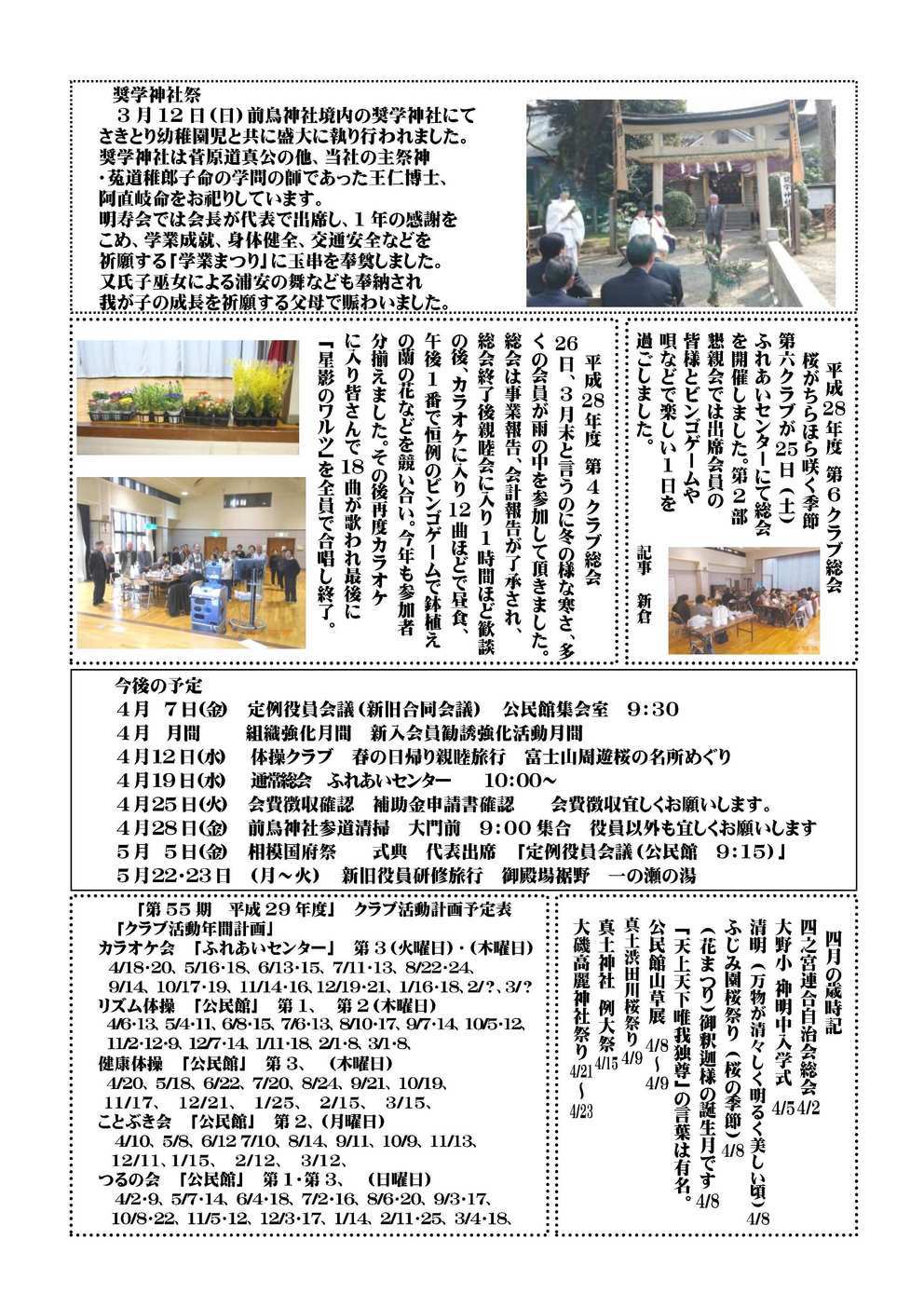 平成29年度 明寿会 役員体制 公民館まつり 明寿会 第2クラブ 平成28年度 総会 明寿会 第1クラブ 総会 新入会員紹介 訃 報 ご芳志 【2面】 奨学神社祭 平成28年度 第6クラブ総会 平成28年度 第4クラブ総会 今後の予定 4月 7日(金) 定例役員会議(新旧合同会議) 公民館集会室 9:30 4月 月間 組織強化月間 新入会員勧誘強化活動月間 4月12日(水) 体操クラブ 春の日帰り親睦旅行 富士山周遊桜の名所めぐり 4月19日(水) 通常総会 ふれあいセンター 10:00〜 4月25日(火) 会費徴収確認 補助金申請書確認 会費徴収宜しくお願いします。 4月28日(金) 前鳥神社参道清掃 大門前 9:00集合 役員以外も宜しくお願いします 5月 5日(金) 相模国府祭 式典 代表出席 「定例役員会議(公民館 9:15)」 5月22・23日 (月〜火) 新旧役員研修旅行 御殿場裾野 一の瀬の湯 四月の歳時記 「第55期 平成29年度」 クラブ活動計画予定表 「クラブ活動年間計画」 |