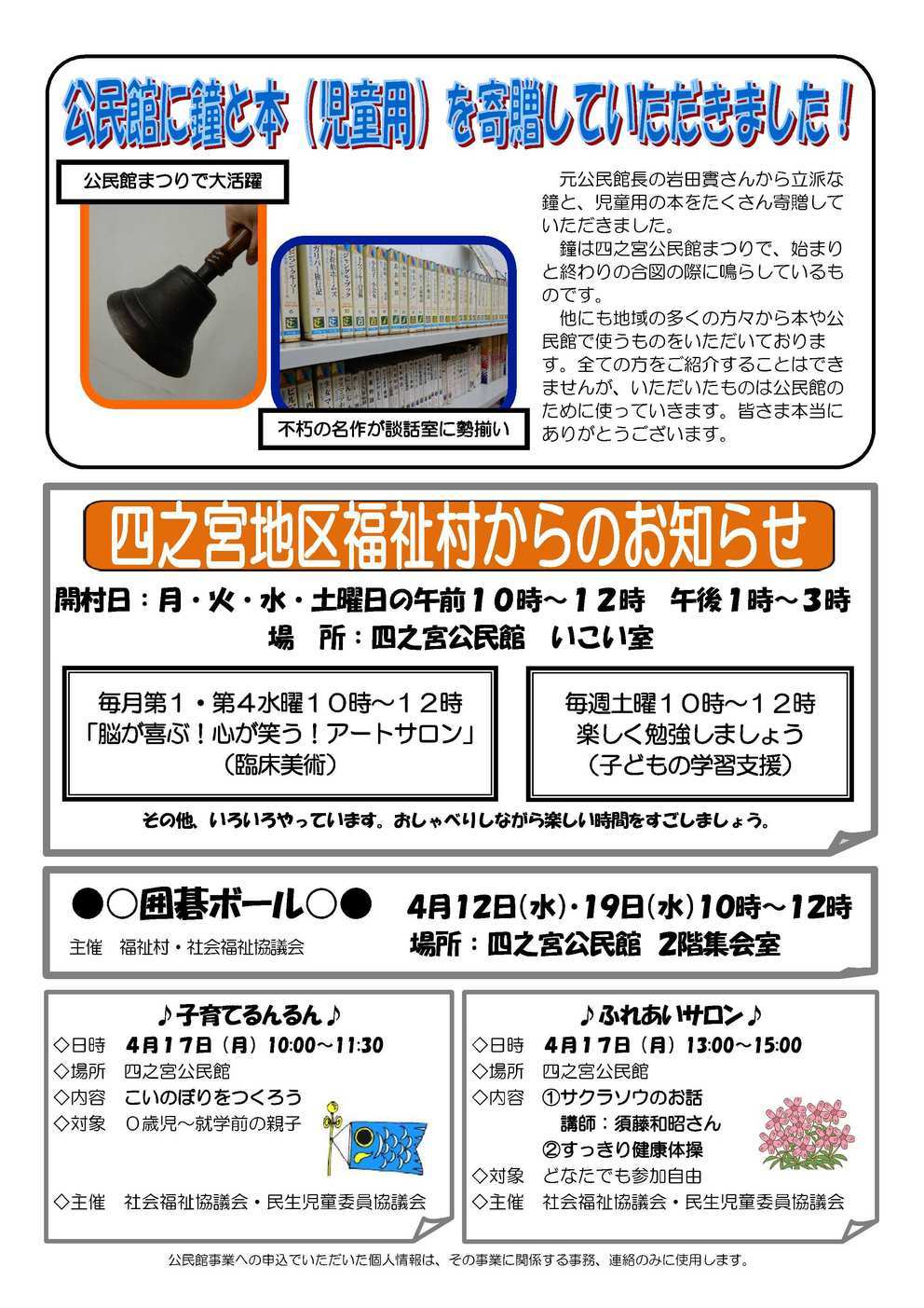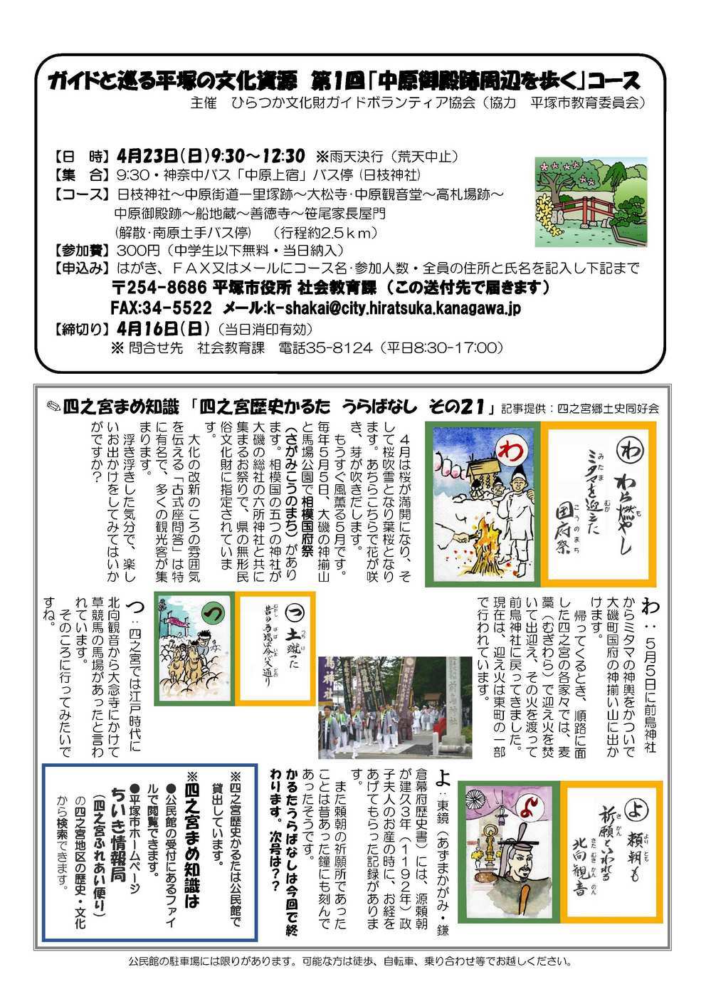 【1面】 『市長と語ろう!ほっとミーティング 参加者募集』 5月24日(水) 19:00〜21:00 大野公民館ホール(1階) 問合せ先:市民情報・相談課 四之宮ふれあい便り(地域情報局)を利用しよう! 【2面】 第35回公民館まつり 御来場、御参加ありがとうございました。 【3面】 公民館に鐘と本(児童用)を寄贈していただきました! 『福祉村からのお知らせ』 開村日:毎週 月・火・水・土曜日 10:00〜12:00 13:00〜15:00 四之宮公民館 いこい室 『囲碁ボール』 4月12日(水)・19日(水) 10:00〜12:00 四之宮公民館 2階集会室 『子育てるんるん』 4月17日(月) 10:00〜11:30 四之宮公民館 『ふれあいサロン』 4月17日(月) 13:00〜15:00 四之宮公民館 【4面】 ガイドと巡る平塚の文化資源 第1回「中原御殿跡周辺を歩く」コース 4月23日(日) 9:30〜12:30 問合せ先:社会教育課 四之宮まめ知識 「四之宮歴史かるた うらばなし その21」 |