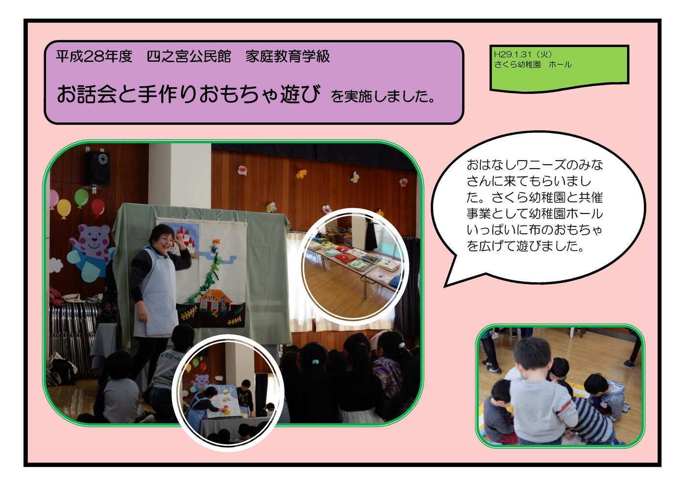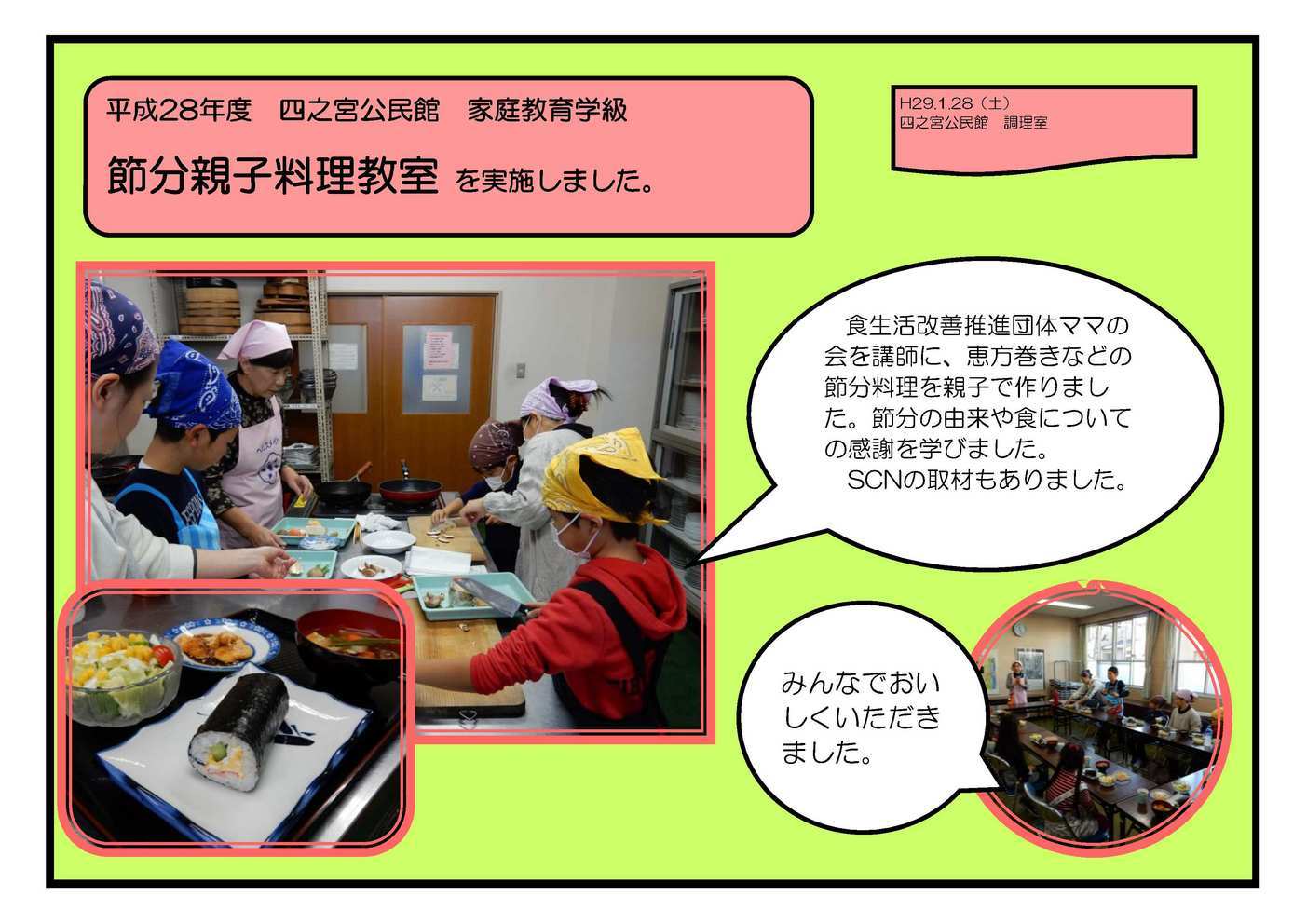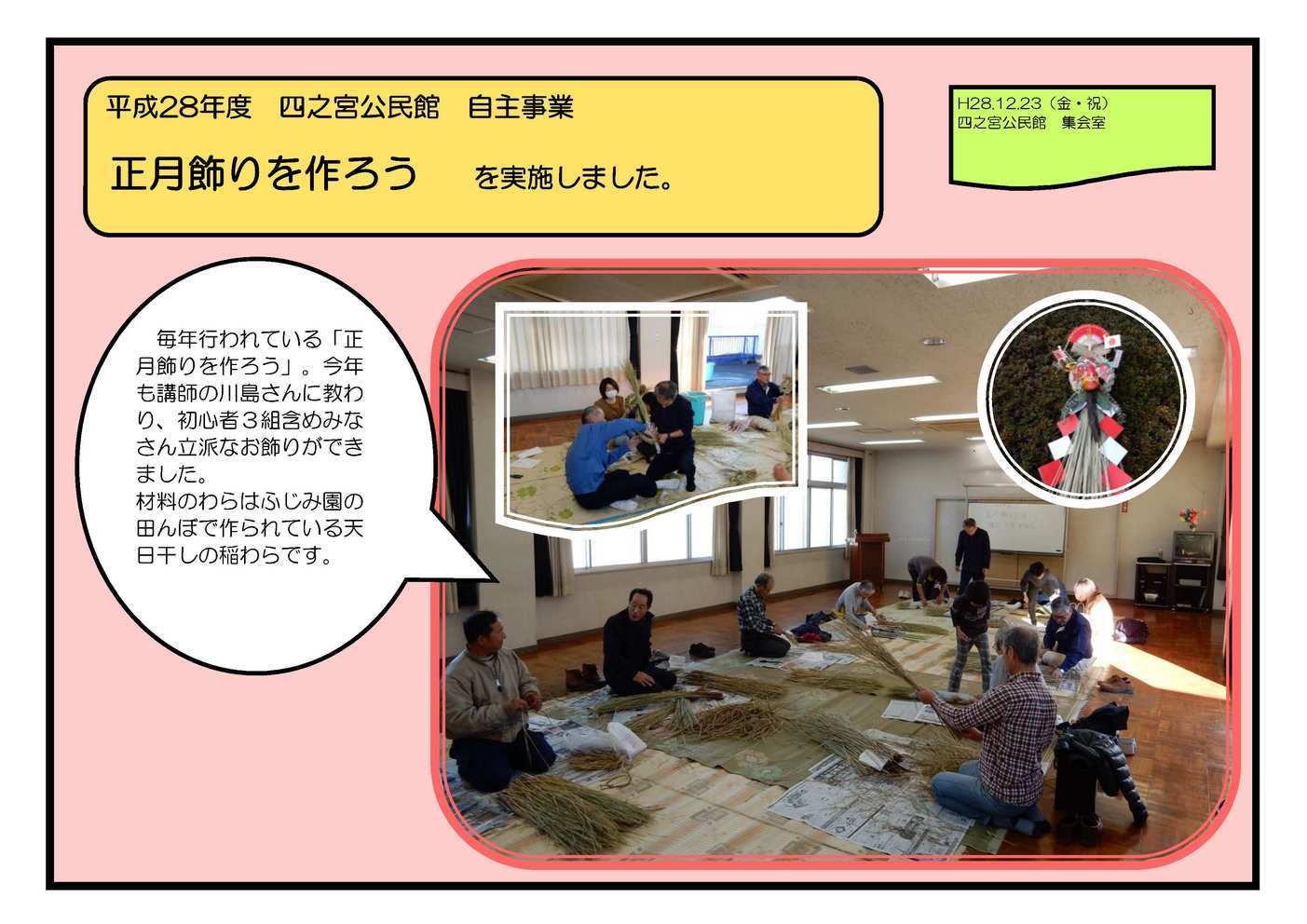 12月12日(水) 東ブロックの7公民館共催で、プロのシャンソン歌手 兼 教育ジャーナリストの野口桂子先生をお招きし、思春期の子育てについて学びました。 実体験をもとに子どもにどう親の愛を伝えるかをお話していただきました。 正月飾りを作ろう 12月23日(金) 毎年行われている「正月飾りを作ろう」。今年も講師の川島さんに教わり、初心者3組含めみなさん立派なお飾りができました。 材料のわらはふじみ園の田んぼで作られている天日干しの稲わらです。 節分親子料理教室 1月28日(土) 食生活改善推進団体ママの会を講師に、恵方巻きなどの節分料理を親子で作りました。節分の由来や食についての感謝を学びました。 SCNの取材もありました。 お話会と手作りおもちゃ遊び 1月31日(火) おはなしワニーズのみなさんに来てもらいました。さくら幼稚園と共催事業として幼稚園ホールいっぱいに布のおもちゃを広げて遊びました。 事業に参加していただいたみなさま、ありがとうございました。 |