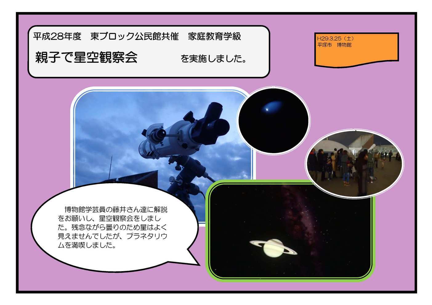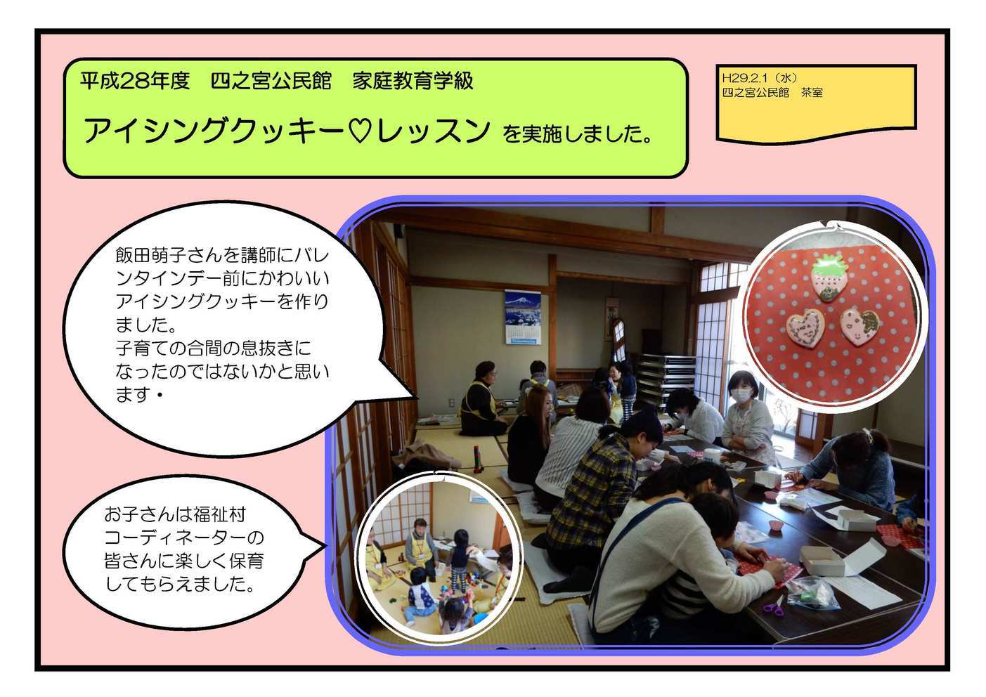 初めてのパソコン・スマホ・タブレット 1月30日(月) 2月6日(月) 生きがい事業団IT班の皆さんに講師をしてもらい、パソコンやスマホ・タブレットの使い方を教わりました。 受講生を中心に「がってんクラブ」という新サークルができました! アイシングクッキー♡レッスン 2月1日(水) 飯田萌子さんを講師にバレンタインデー前にかわいいアイシングクッキーを作りました。 お子さんは福祉村コーディネーターの皆さんに楽しく保育してもらえました。子育ての合間の息抜きになったのではないかと思います。 親子で星空観察会 3月25日(土) 博物館学芸員の藤井さん達に解説をお願いし、星空観察会をしました。残念ながら曇りのため星はよく見えませんでしたが、プラネタリウムを満喫しました。 親子テニス教室 3月29日(水) テニススクールの講師を招き、ラケットの使い方・ボールの打ち方を親子で教わりました。 事業に参加していただいたみなさま、ありがとうございました。 |