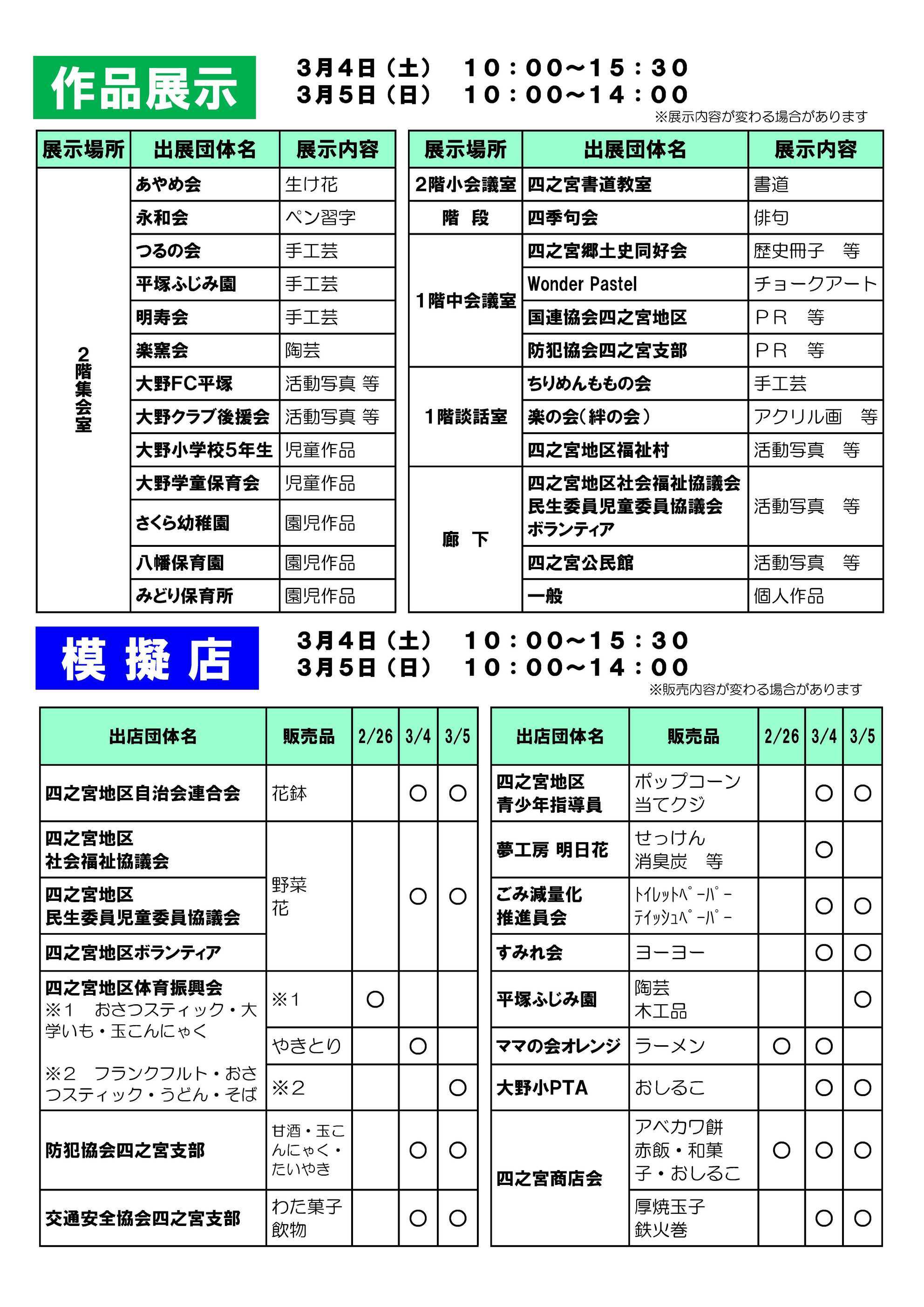 3月4日(土)の四之宮公民館まつり(作品展示・催し物・模擬店)は、多くの方に来ていただき、大盛況でした。 ご参加いただきました皆さま、ご協力いただきました皆さま、誠にありがとうございました。 本日3月5日(日)も、10:00〜14:00 四之宮公民館まつり(作品展示・催し物・模擬店)を四之宮公民館(平塚市四之宮3−20−26)で開催します。 ※変更点※ ビンゴゲームの時間帯が 1回目11:00 2回目13:00 に変更になりましたのでご注意ください。 皆さまぜひお越しください。なお、駐車場はありませんので、自転車か徒歩でお越しください。 | |